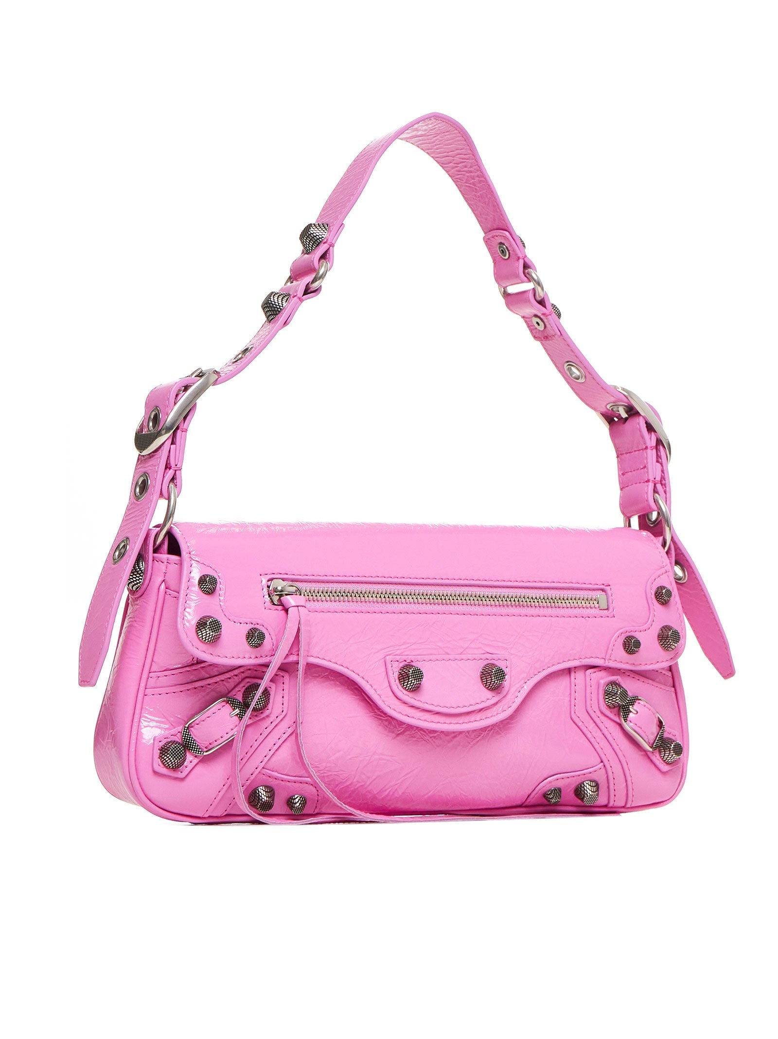 Balenciaga's Le Cagole Sling S bag in Arena pink leather featuring an adjustable handle with double buckles, zip pocket on the flap, zip slider with long strap, back zip pocket, concealed magnetic fastening, engraved silver-tone metal studs, buckles and hardware.