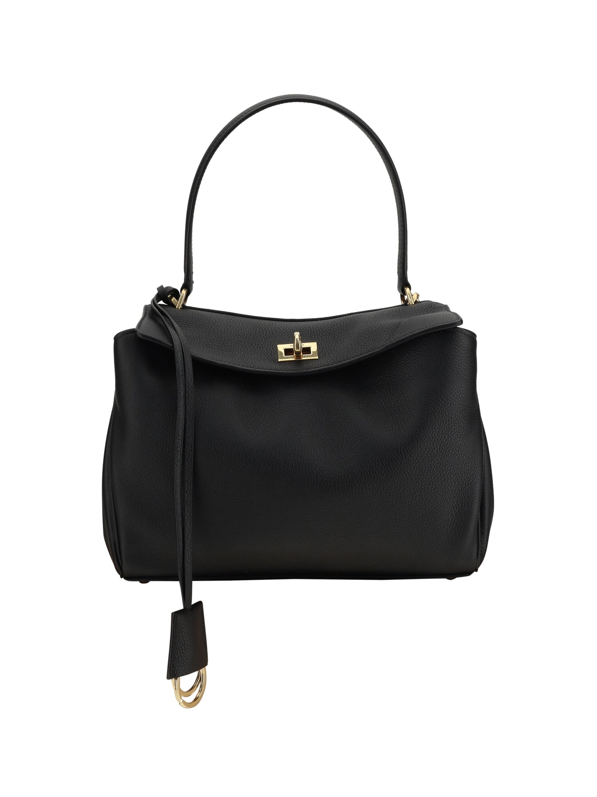 Balenciaga's signature leather Rodeo Shoulder Bag is a sophisticated and versatile accessory. The flat handle at the top offers a comfortable grip, while the removable shoulder strap allows you to adapt it to your style, wearing it on the shoulder or crossbody. Front flap with swivel closure lends a distinctive and practical touch. Inside, single interior pocket for simple and functional organization. Metal support feet applied to the base protect the leather and provide stability. A perfect blend of elegance and practicality, ideal for any occasion.