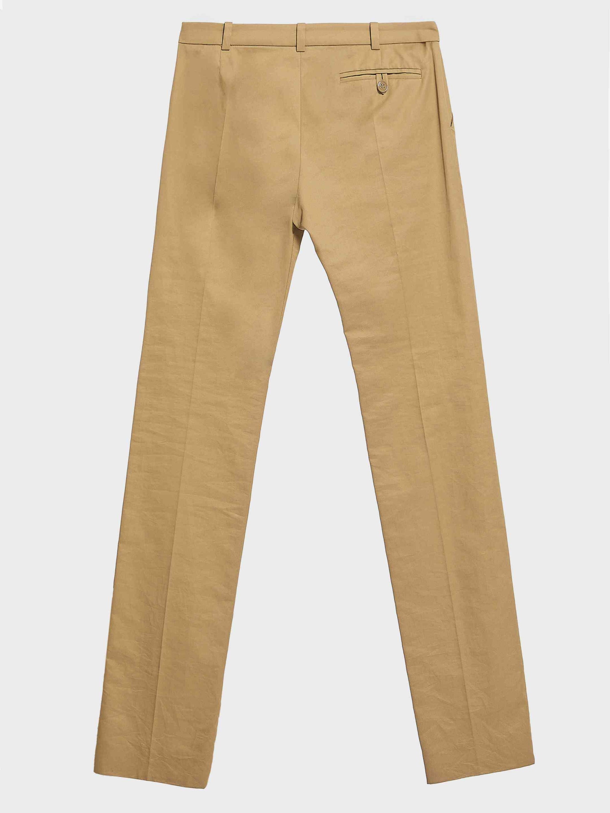 Beige cotton trousers. Featuring belt loops, a hidden button closure with zipper and hook, two welt pockets at the front, and one back pocket with flap and button, with pleats on the front and back. Slim fit.