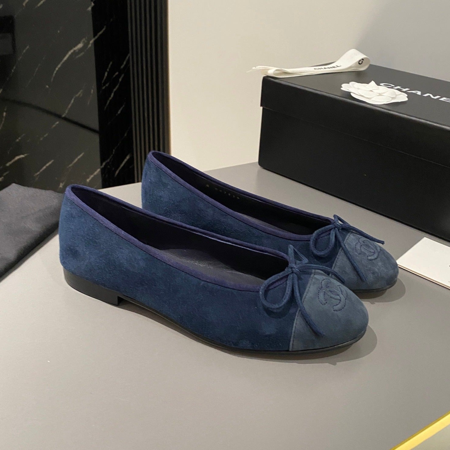 CHANEL ballet flat dark blue suede calfskin