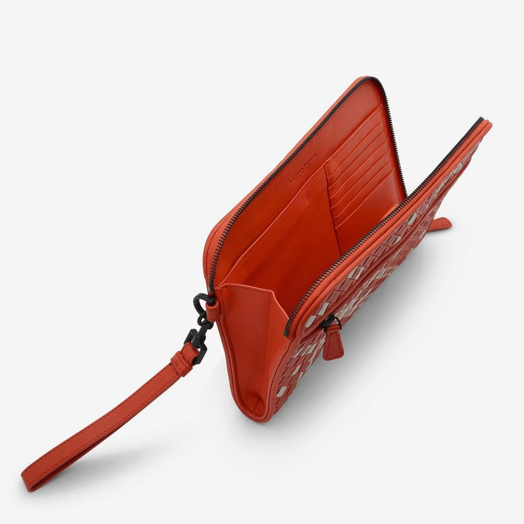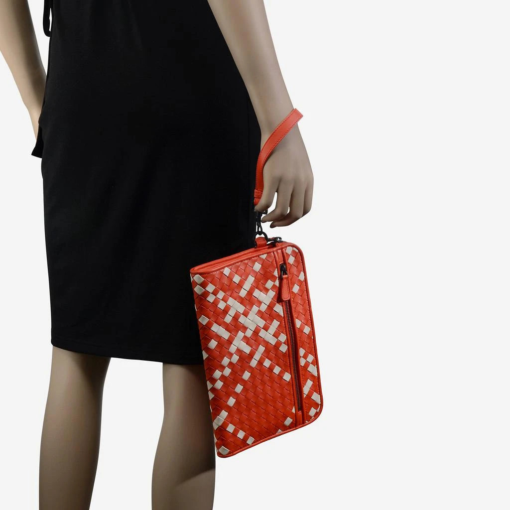 The Bottega Veneta Leather Wristlet features a convenient front zip pocket for quick access to essentials. Inside, it typically includes a slip pocket and card slots, offering practical organization options. This stylish accessory combines luxury craftsmanship with functionality, making it ideal for carrying essentials in a compact and elegant manner.Bag Material - LambskinBag Dimensions - 7.08x10.62x1.57Bag Color - Orange,WhiteBag Hardware Color - Matte-blackBag Closure Type - Zip-AroundMSRP - 1770.00