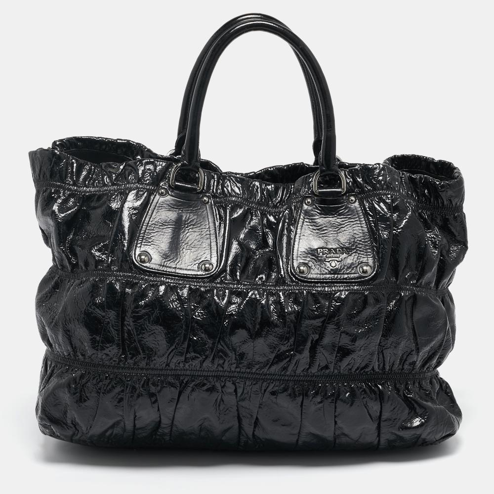 Experience luxury with this exquisite Prada creation in sleek black patent leather. Meticulously crafted, this large shopper showcases an alluring ruched design, epitomizing sophistication. The interior is lined with premium nylon, offering practicality without compromising elegance. Accompanied by comfortable handles, it effortlessly radiates style while ensuring ease and versatility for daily use. - Good - In good condition with slight fading on exterior/handle(s) & minor scratches on metal.