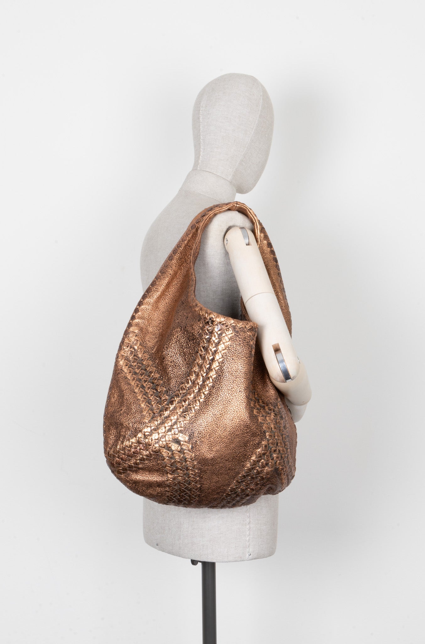 Die Bottega Veneta Hobo Bag aus bronzefarbenem Leder ist ein unverwechselbares Accessoire. Die charakteristische Hobo-Form bietet nicht nur eine grosszügige, praktische Innenausstattung, sondern auch einen einzigartigen Look. Das hochwertige Leder und die geschmeidige Textur verleihen der Tasche einen edlen Glanz, während die subtile Farbnuance vielseitig kombinierbar ist. Ideal für den Alltag oder besondere Anlässe.