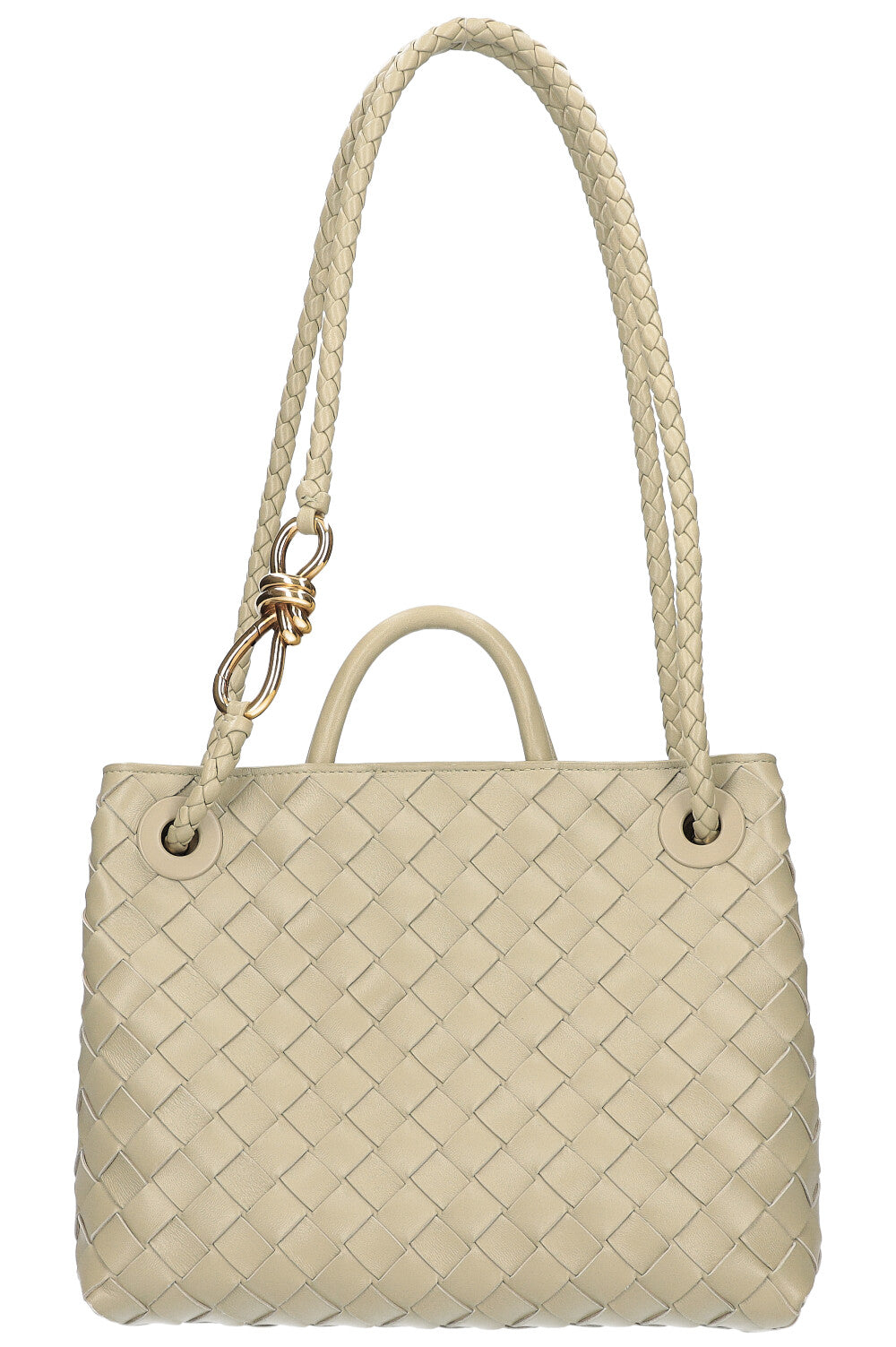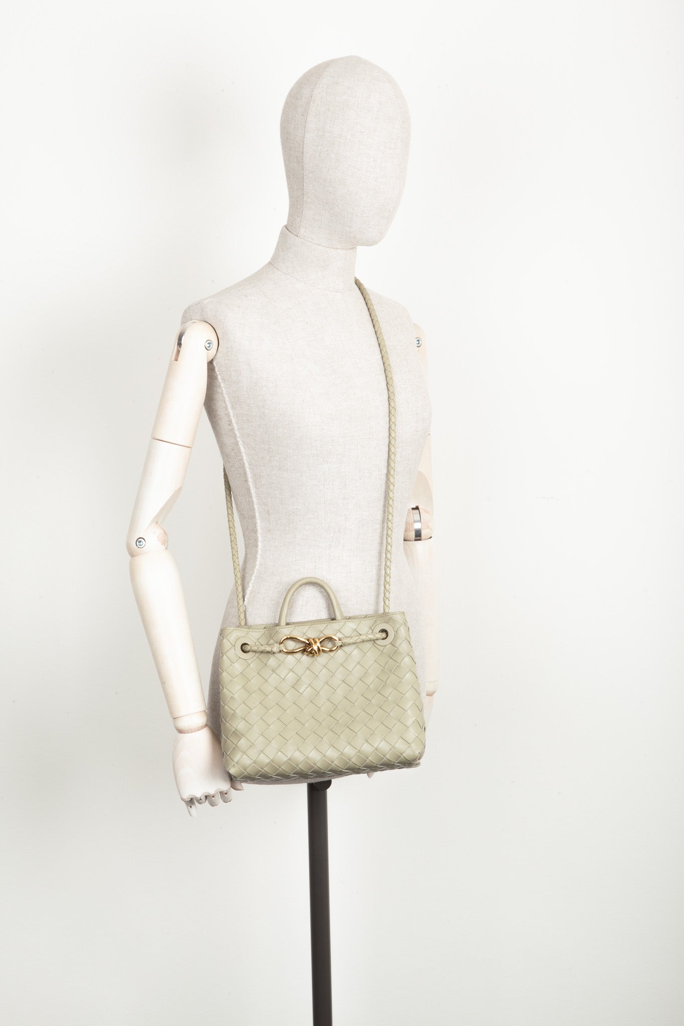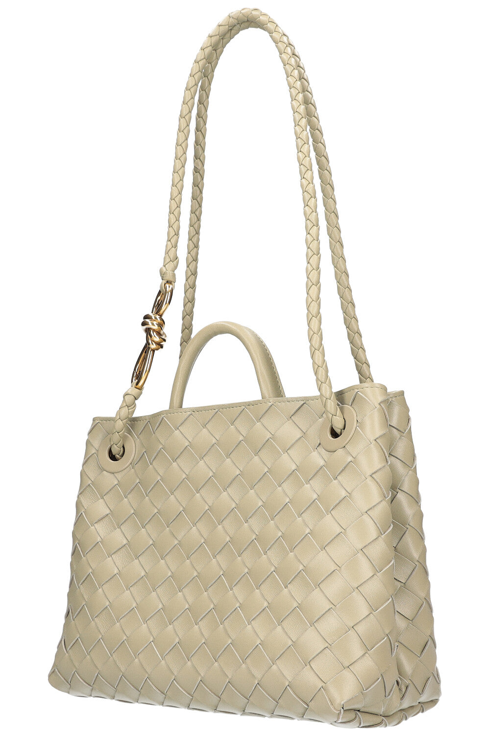We Love: Klassisches Intrecciato mit signature Knot Detail. Die Andiamo lässt sich sowohl Crossbody als auch auf der Schulter mit doppeltem Schulterhenkel tragen.