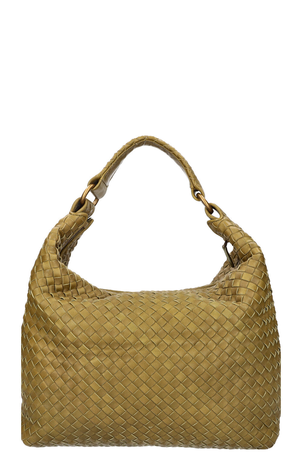 We Love: Die Vorgängerin der heutigen Hobo Bag. Sie unterscheidet sich leicht im Schulterriemen welcher mit Hardware Elementen versehen ist. Klassisches Intrecciato aus weichem Leder