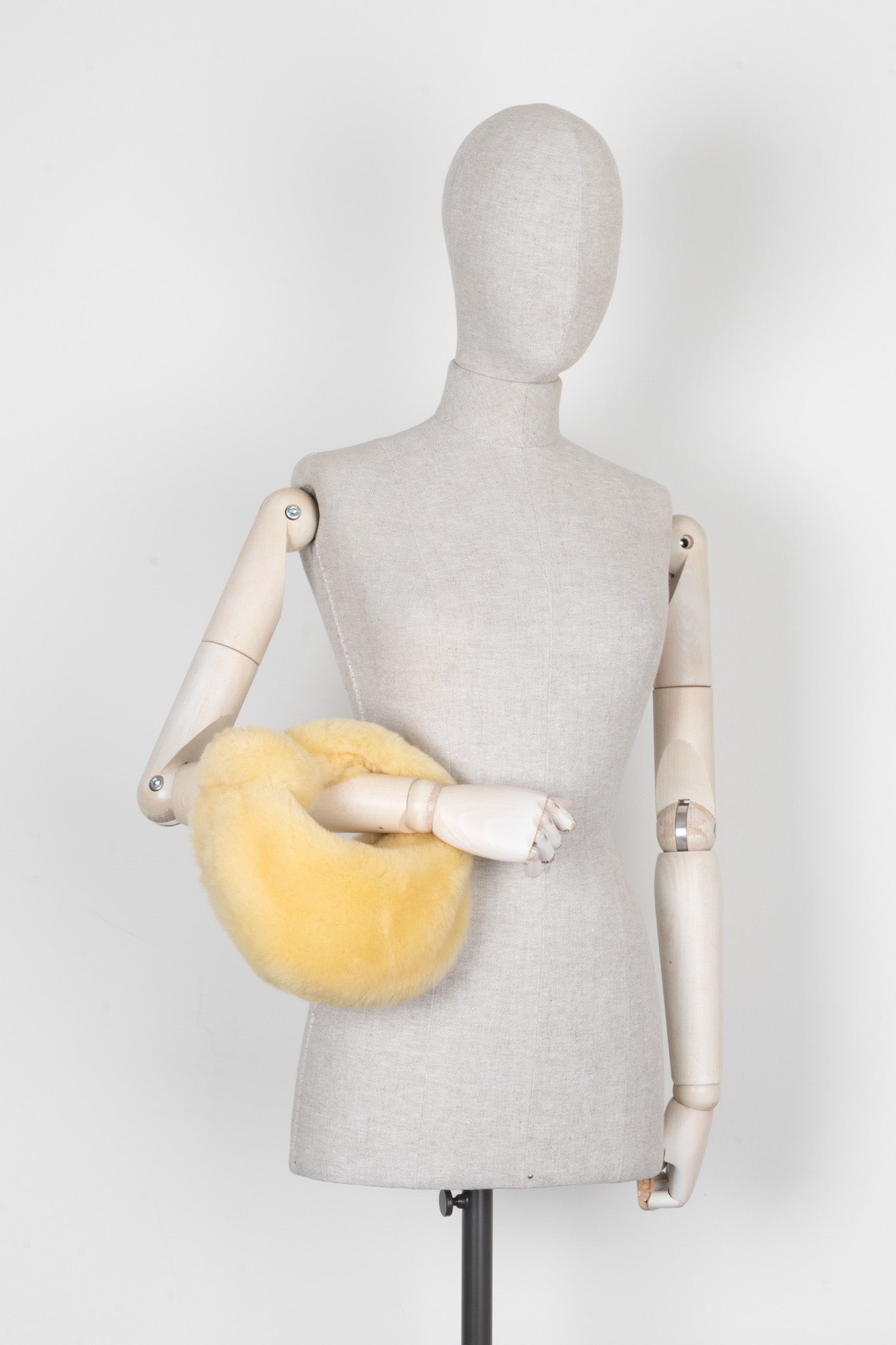 Die Bottega Veneta Mini Jodie Shearling Bag in Vanilla ist der Inbegriff von süssem Charme und Gemütlichkeit. Gefertigt aus luxuriösem Shearling, vereint sie ein kuscheliges Gefühl mit modernem Stil.
