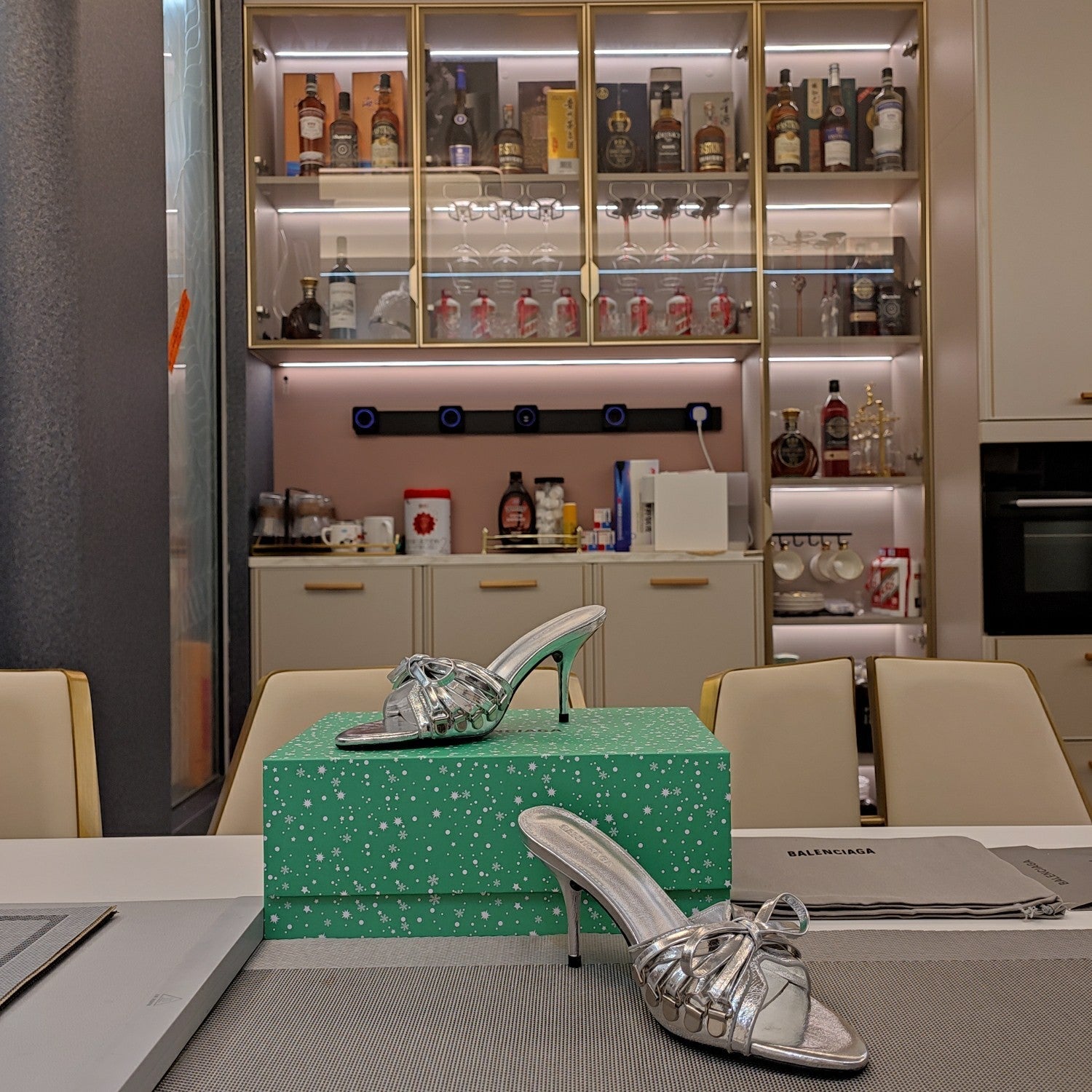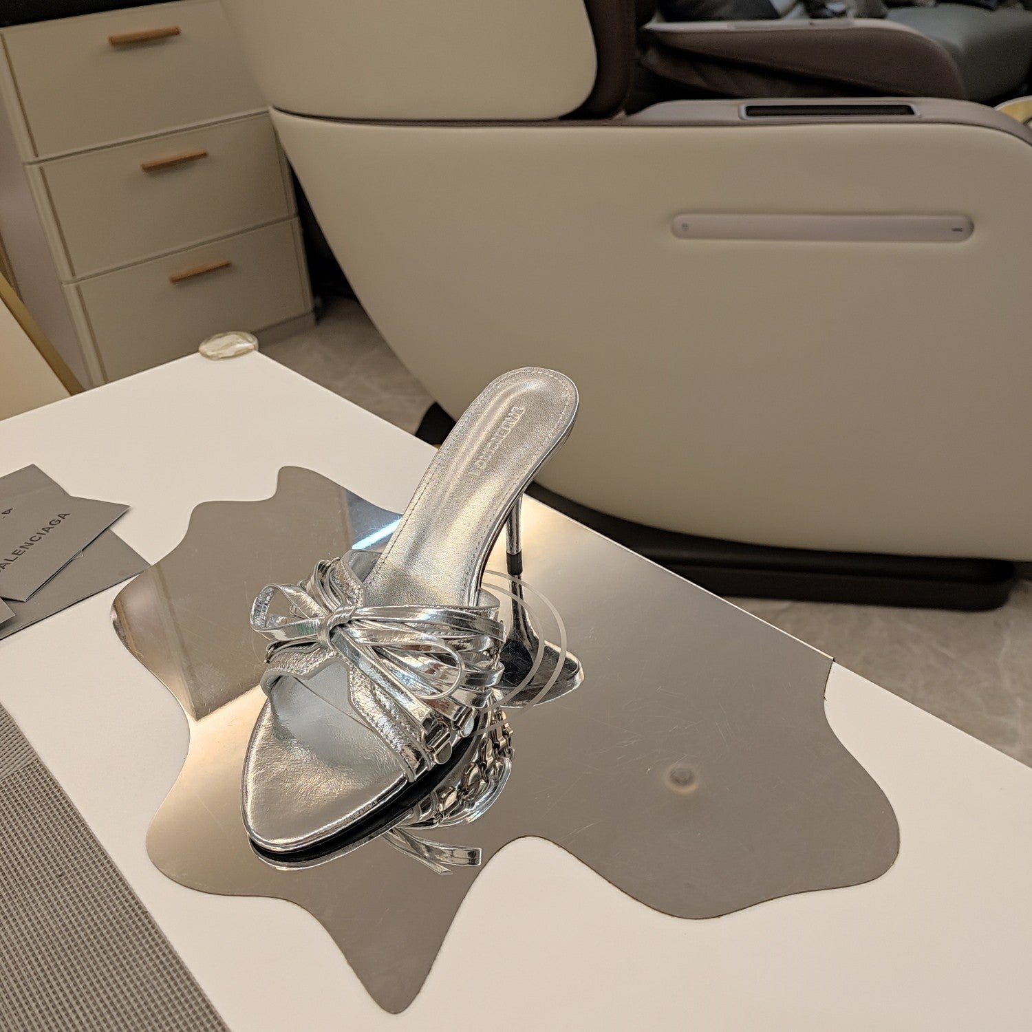 Balanciaga BOW-EMBELLISHED HIGH MULES IN SILVER METALLIC SHEEPSKIN