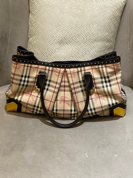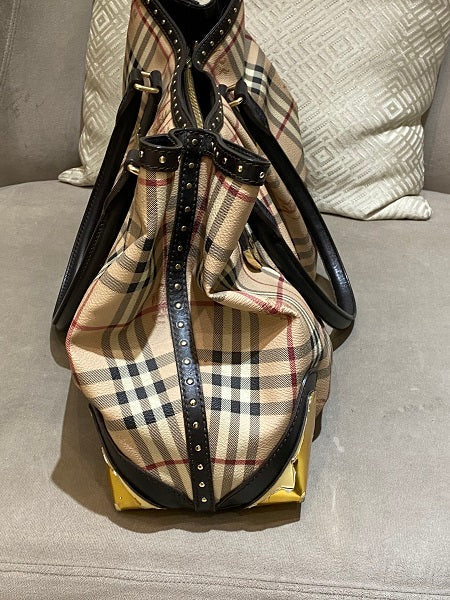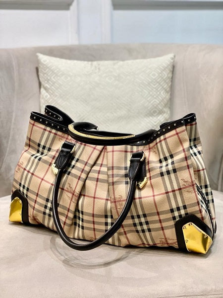 - Material: Haymarket Check Canvas with Black Leather Trim