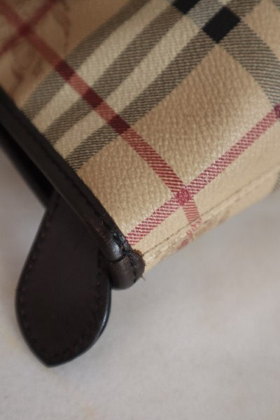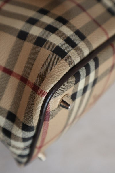 - Material: Beige Haymarket Check Coated Canvas with Brown Leather Trim