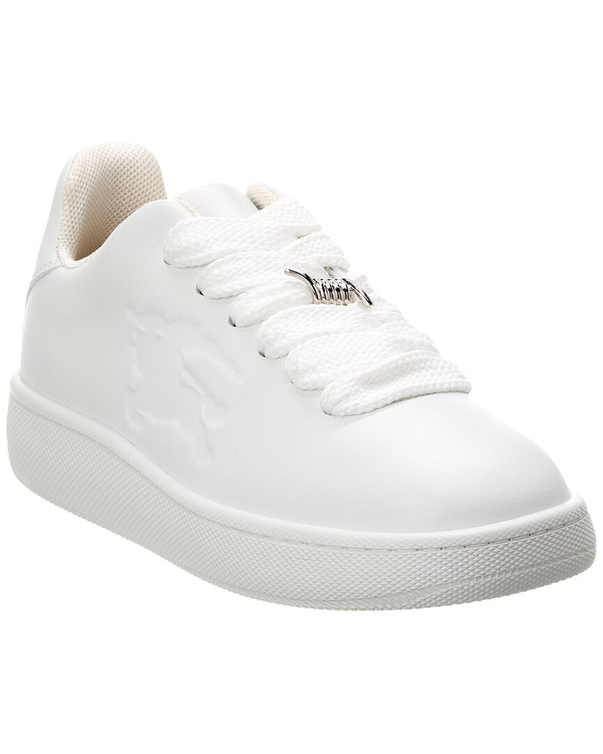 Elevate your street style with the Burberry Box Leather Sneaker. Crafted in Italy from luxurious white leather, these fashion-forward sneakers feature the iconic Burberry logo embossed on the side and silver-tone spirals at the laces. The lace-up closure and lightly padded leather insole ensure a comfortable fit, while the rubber sole provides traction for all-day wear. Channel timeless British influence with these covetable sneakers that showcase Burberry's signature style. Please note that size selections are in European sizing - refer to the size chart for US conversions. Add a touch of luxury to your footwear collection with these Burberry sneakers that are to be . Shop with confidence knowing that each product sold on our site is ated for quality assurance.