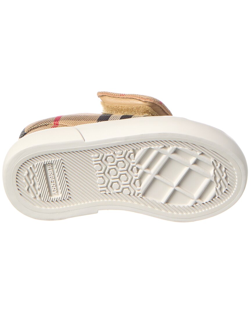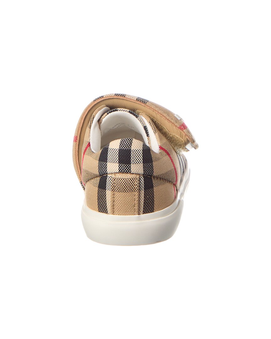 Introducing the Burberry Canvas Sneaker for kids/girls! This iconic design features the brand's signature vintage check pattern in archive beige canvas with bold logo lettering. The velcro closure ensures a secure fit, while the lightly padded leather insole keeps little feet comfortable all day long. The rubber sole provides traction for active playtime. Burberry has been a luxury staple since 1856, known for their timeless appeal and British influence. Rest assured, our products are , sourced from trusted independent suppliers to . Please note that size selections are European, so be sure to reference the size chart for US conversions. Add a touch of designer flair to your child's wardrobe with the Burberry Canvas Sneaker today!