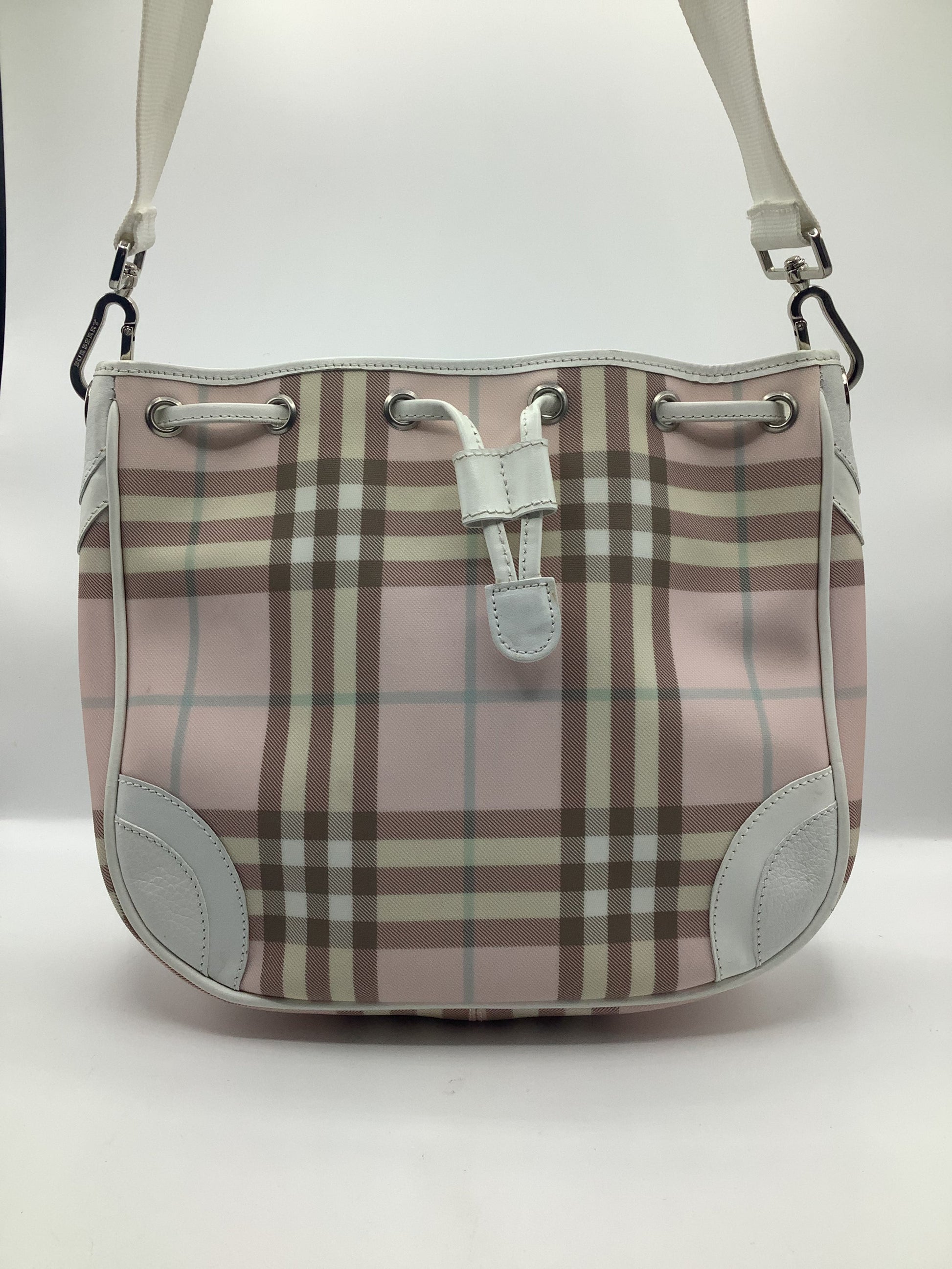 Key Product Information: This Burberry shoulder bag showcases the brand's iconic tartan pattern in a charming pink hue, crafted from durable canvas material. The drawstring closure ensures secure storage while offering easy access to your belongings. Complemented by leather trim and a white nylon shoulder strap.