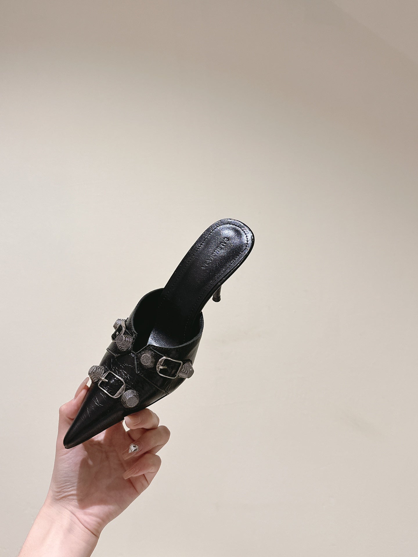 Balanciaga CAGOLE POINTED HIGH MULES IN BLACK SHINY CALFSKIN