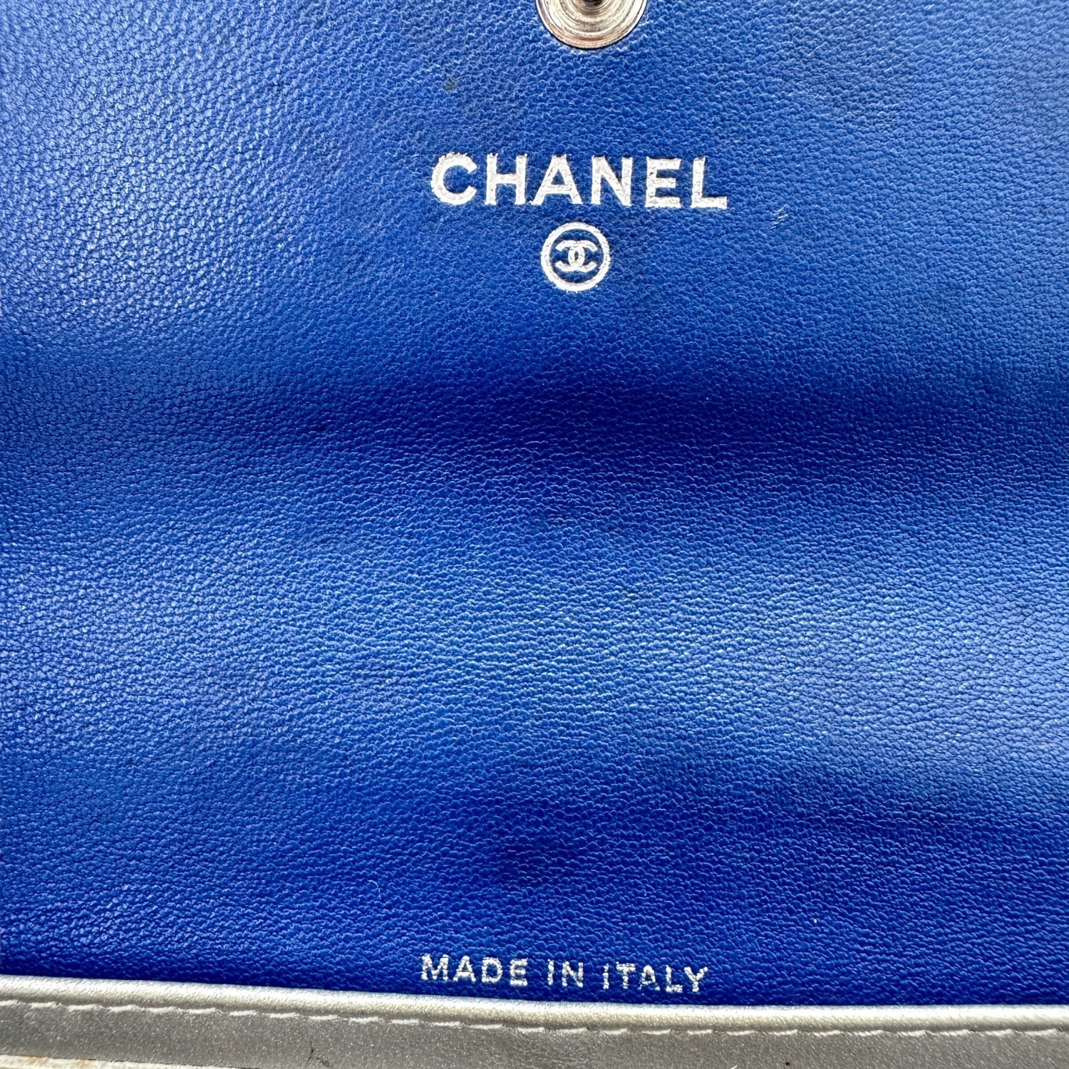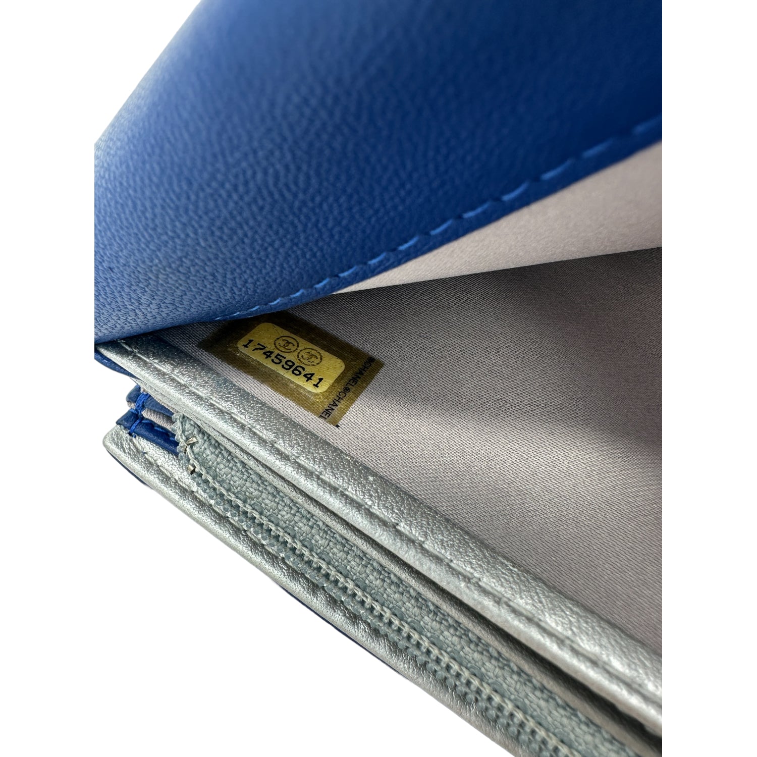 This Chanel bag Blue Camellia lambskin leather snap wallet is perfect if you are seeking something chic and luxurious to organize your essentials such as bills, credit cards and coins. It features Silver-tone hardware along with 12 card slots, two bill compartments and one zipper coin pocket. The interior lining is made of grey lambskin leather with a satin fabric. Card of ation is included from manufacturer.