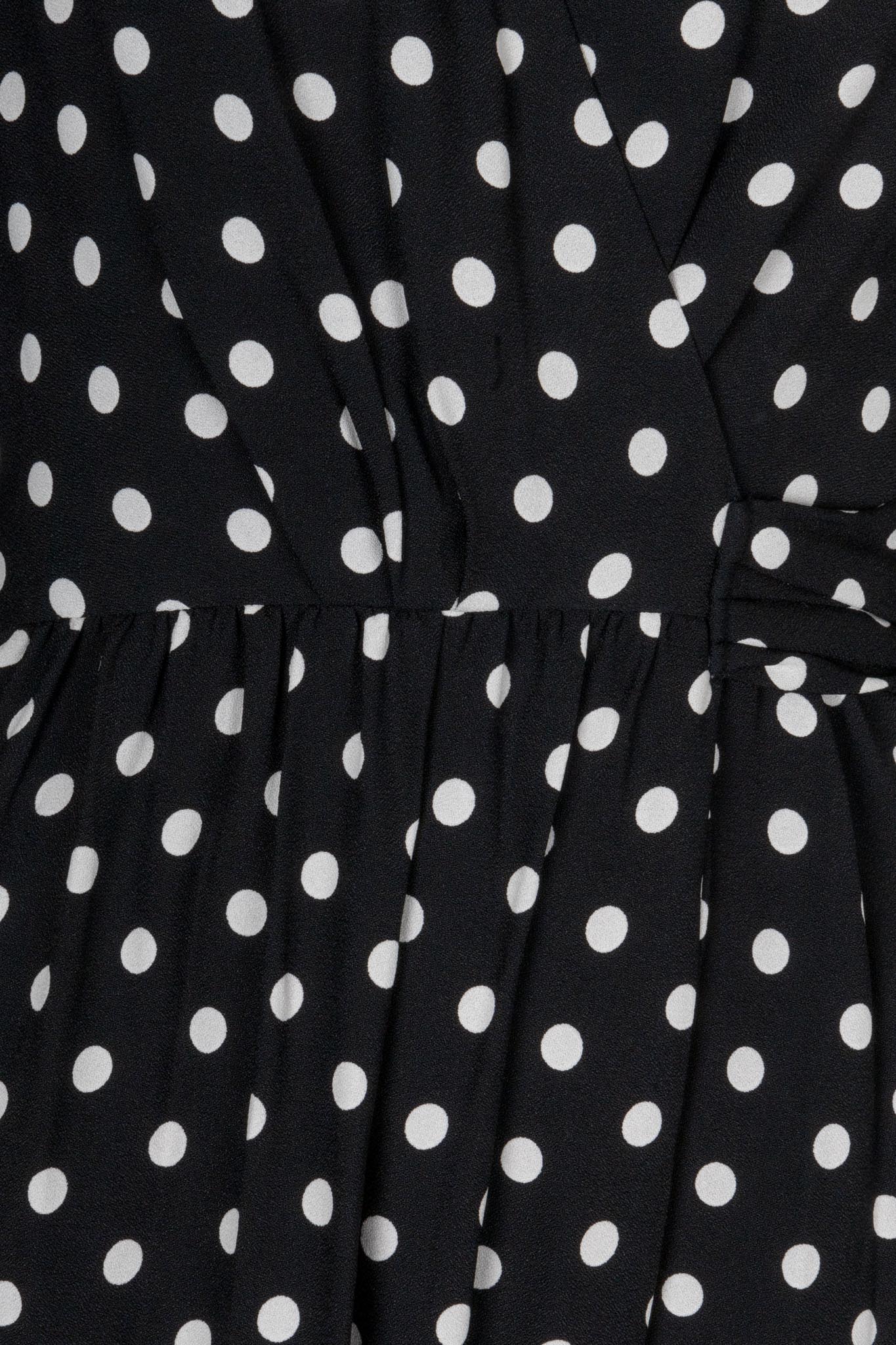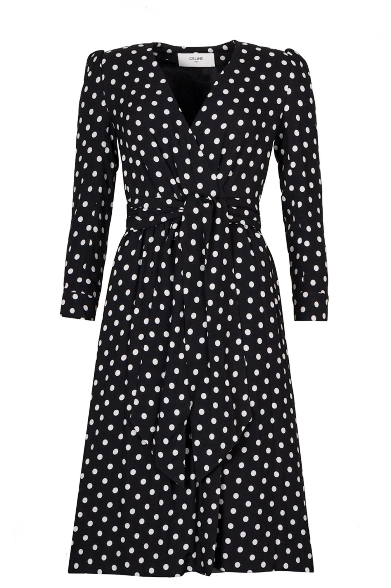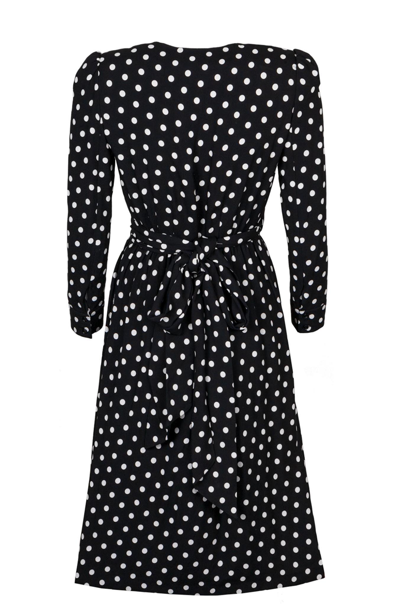 Das Celine Polka Dot Wrap Dress in Schwarz und Weiss schmiegt sich elegant an jede Körperform an und sorgt für eine schmeichelhafte Silhouette. Vielseitig und zeitlos, ist es ein echter Hingucker, der sich perfekt in jede Garderobe integrieren lässt.