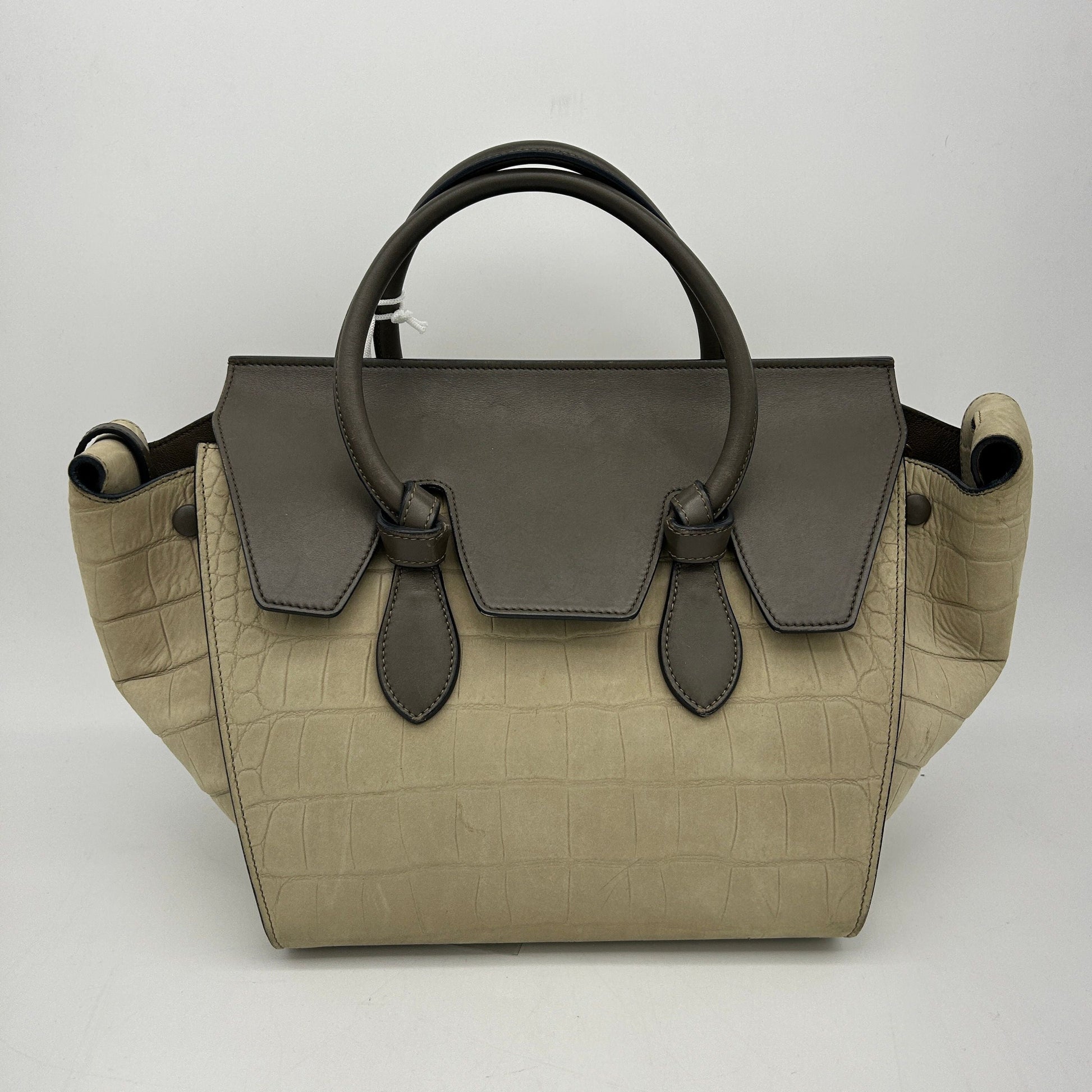 This CELINE Crocodile Embossed Nubuck Calfskin Small Tie Knot Tote in Grey is a stunning addition to any luxury handbag collection. Perfectly blending elegance and functionality, this exquisite tote features a sophisticated crocodile embossed pattern, offering both durability and style. Despite being a piece, it is in excellent condition with only minor scratches and interior wear, making it a prime example of quality in used designer handbags. The tote comes with its original dust bag, making it an enviable choice for those who have a keen eye for vintage CELINE bags.