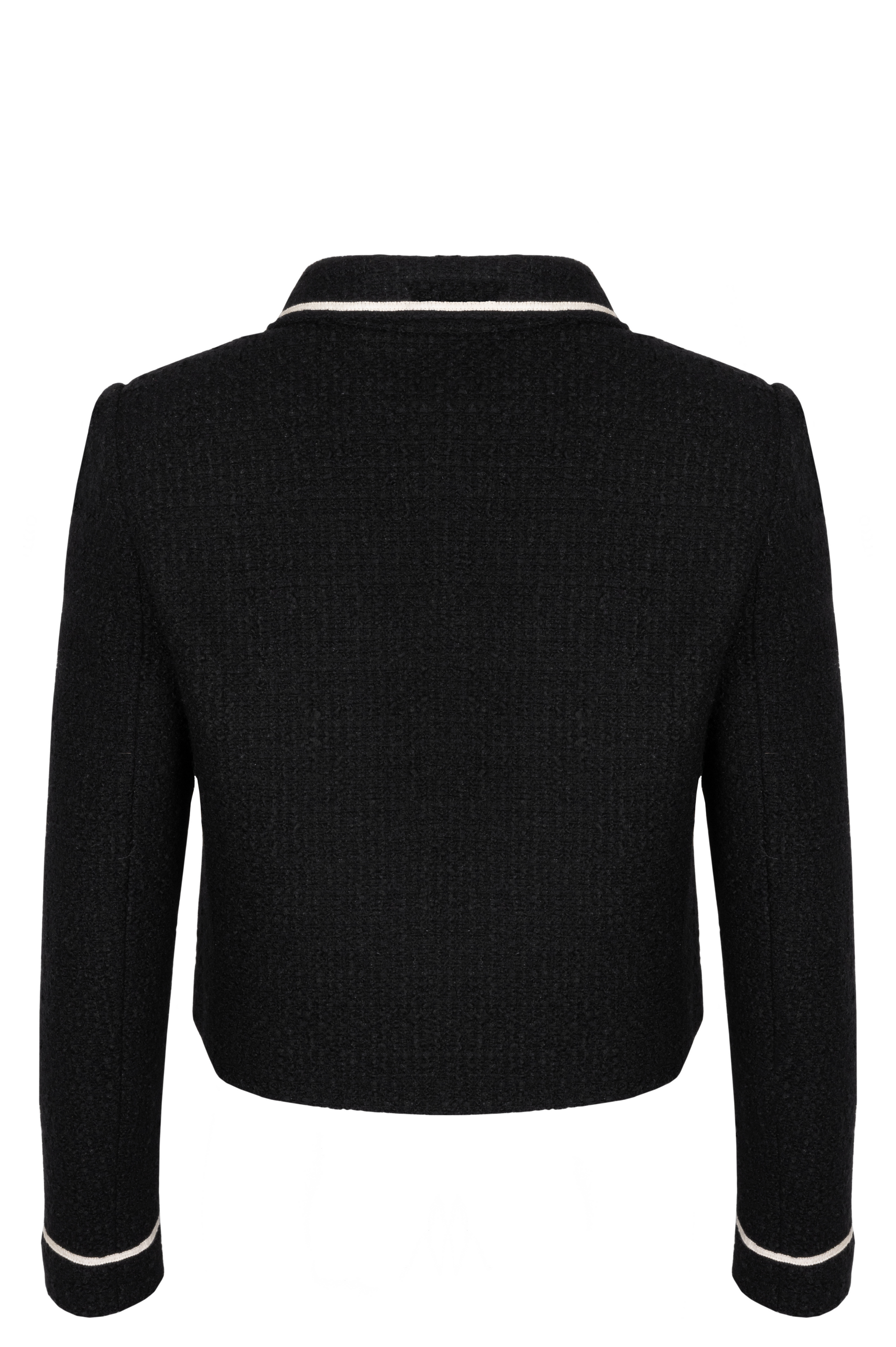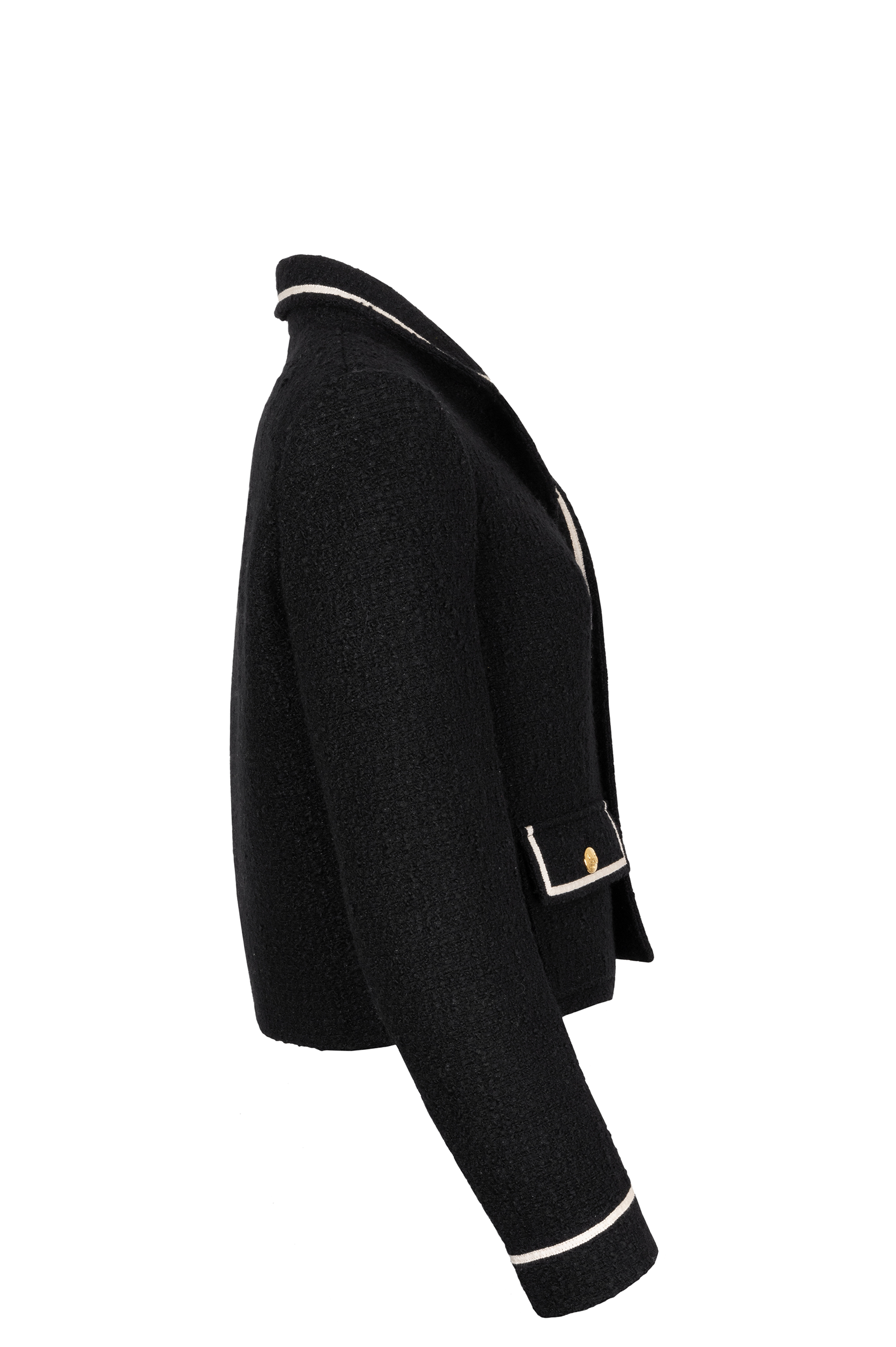 Diese Celine Wolljacke in Schwarz begeistert durch ihren eleganten Look. Mit ihrem Farbkontrast und dem minimalistischen Design wird diese Jacke zu einem zeitlosen Klassiker. Super chic setzt sie mit goldenen Knöpfen als I-Pünktchen raffinierte Akzente. Ideal für den Übergang, passt sie perfekt zu jedem Look – von casual bis chic.