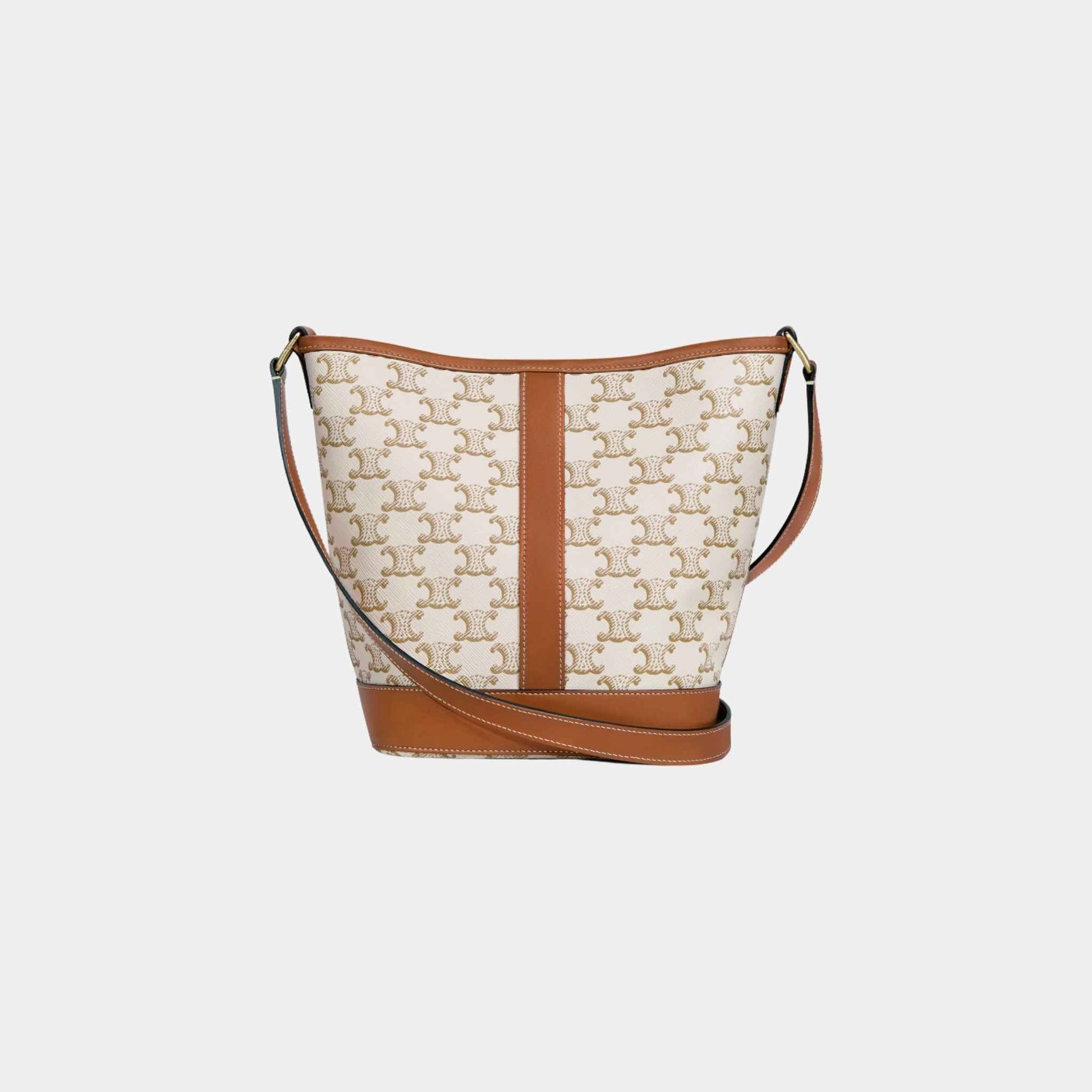 Crafted from Celine’s signature Triomphe canvas with calfskin trimmings, this bucket bag showcases the brand’s dedication to quality and elegance. The textile lining enhances the interior’s durability, while gold finishing details add a polished touch. The adjustable strap allows for cross-body or shoulder carry, making it both practical and stylish.