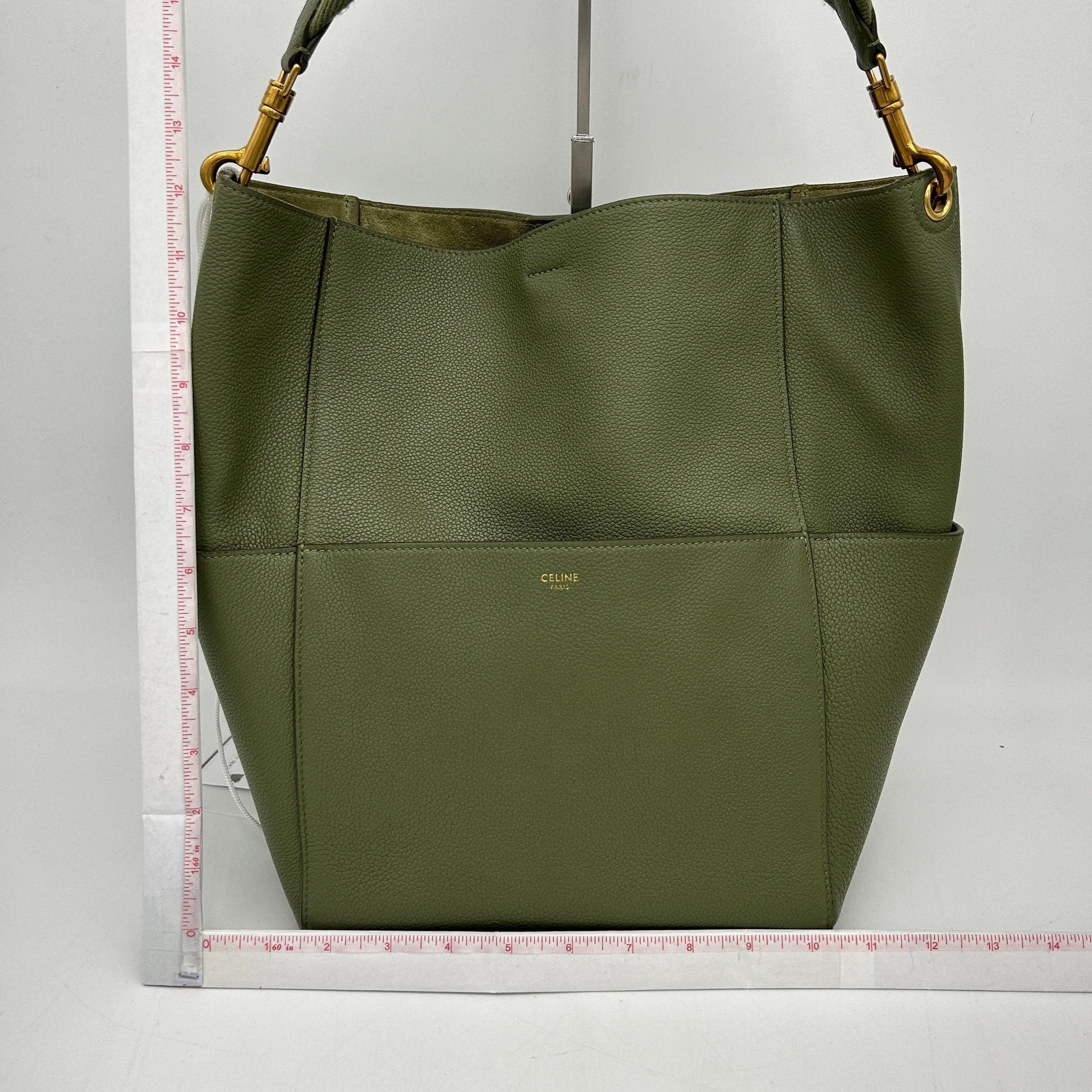 This used CELINE Soft Grained Calfskin Sangle Bucket Bag in Light Khaki is a refined addition to any collection of used designer handbags. Boasting a classic bucket style, this chic bag combines luxury craftsmanship with everyday practicality. Its medium-sized silhouette, crafted from soft grained calfskin, features a solid pattern and a spacious open interior perfect for daily essentials. Experience timeless elegance with CELINE, a standout among vintage CELINE bags sought after by collectors and fashion enthusiasts alike.