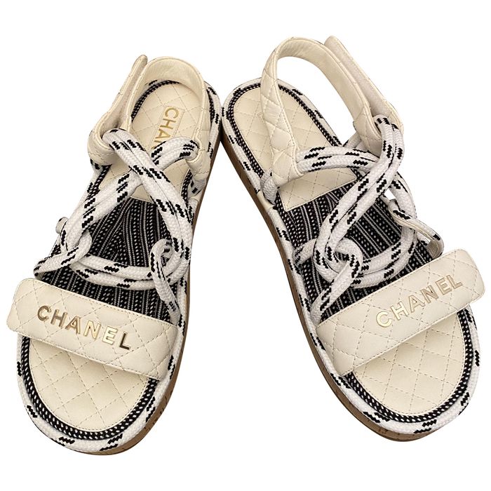 Features quilted lambskin and woven rope straps, a gold Chanel CC logo, and cork midsoles.