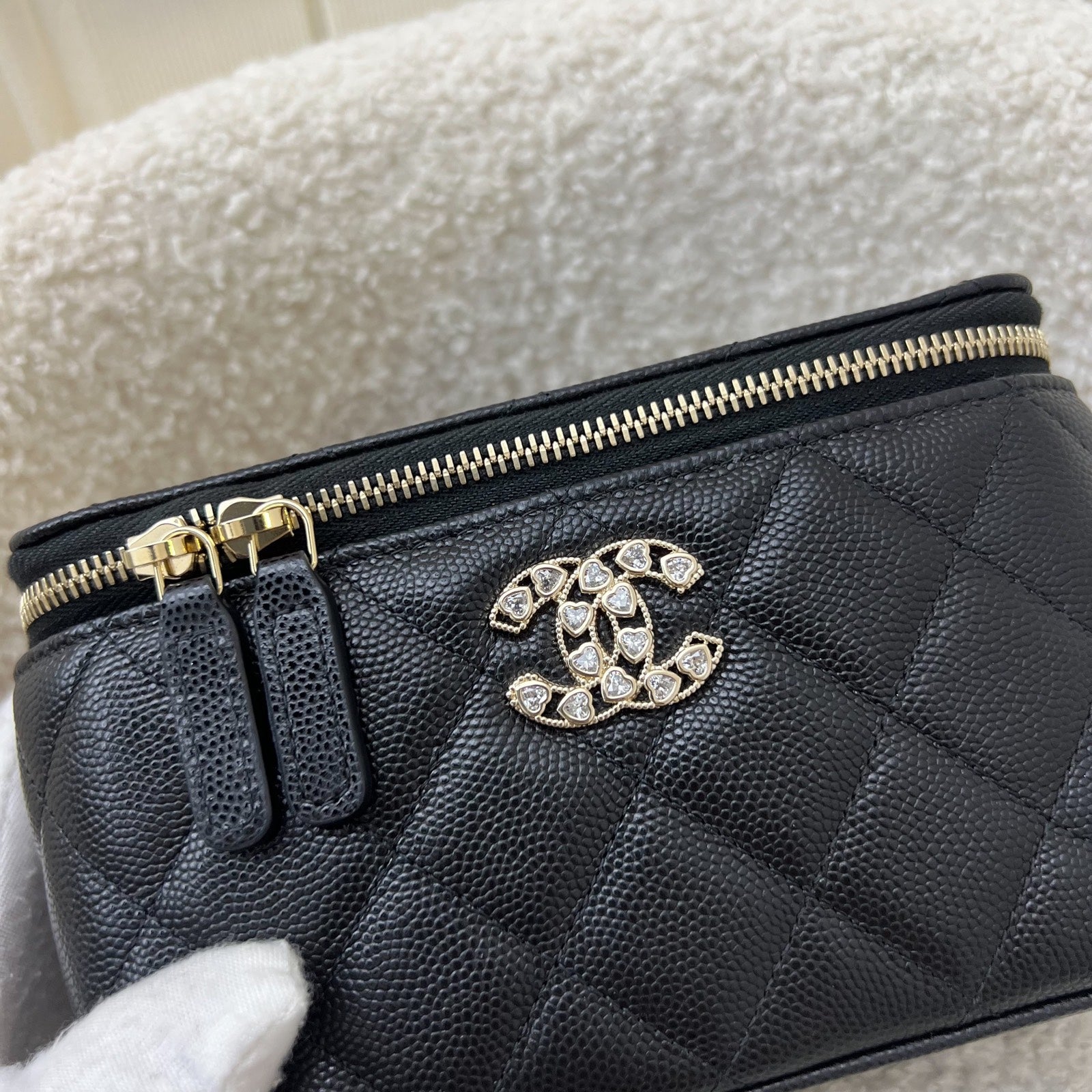 Newest design from 25P with heart shaped crystals! Super popular small vanity case in the most popular black caviar. With a cute mirror inside. Very functional and can fit as much as a Rectangle Mini. Get a bag at the price of an SLG!