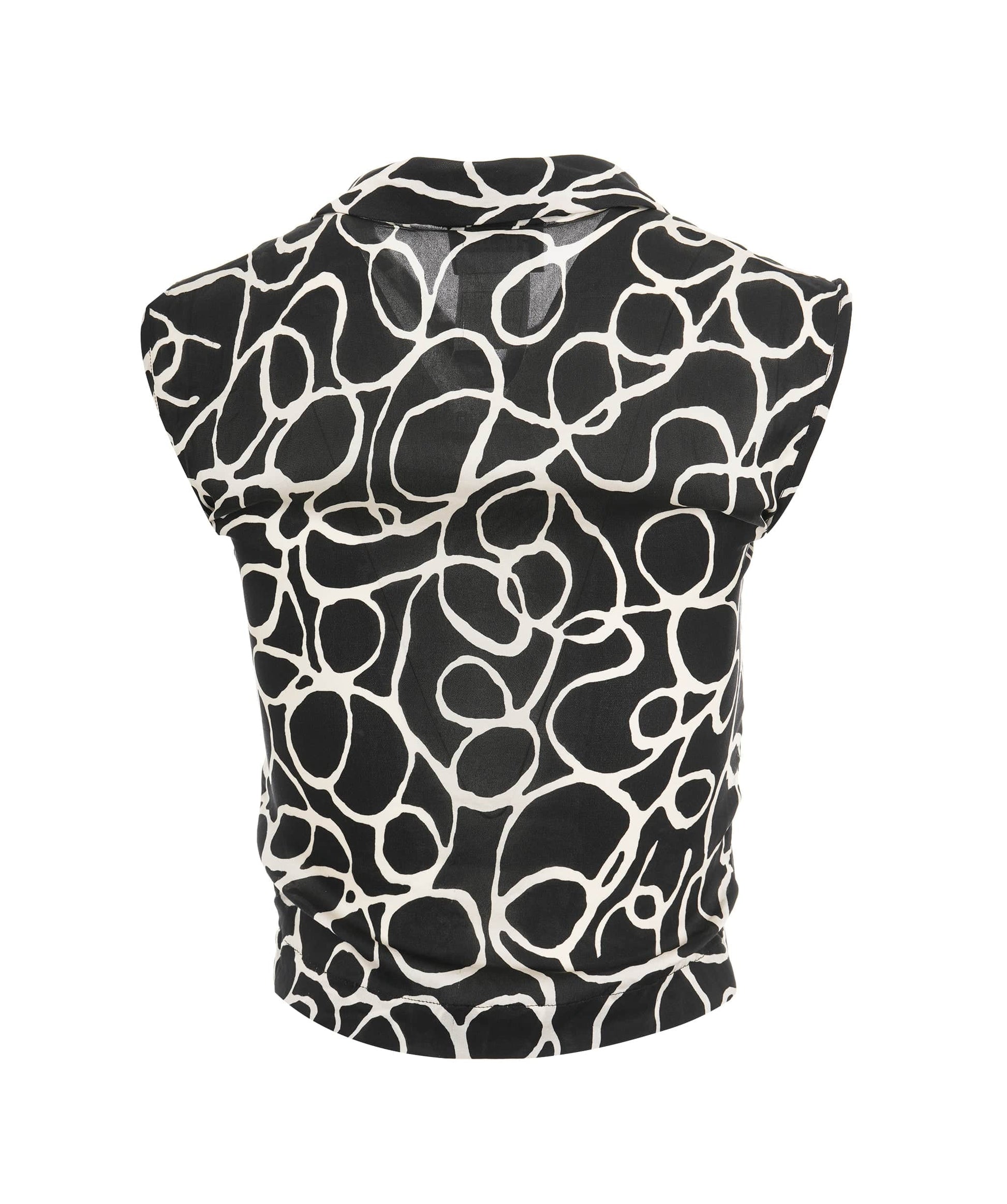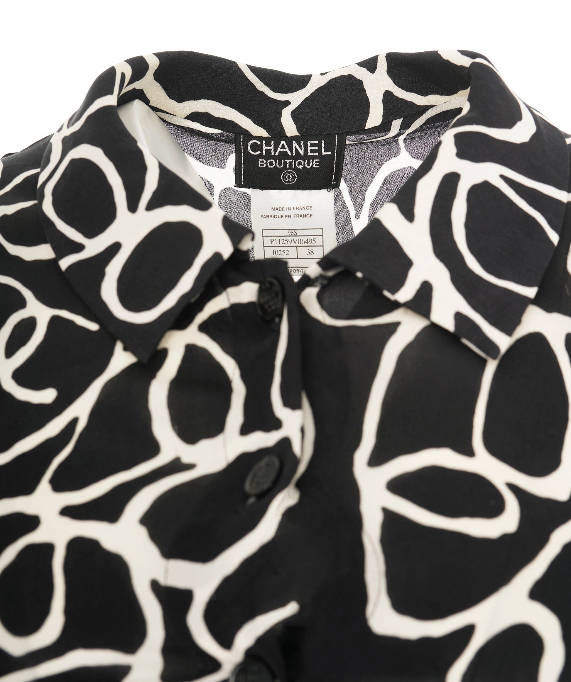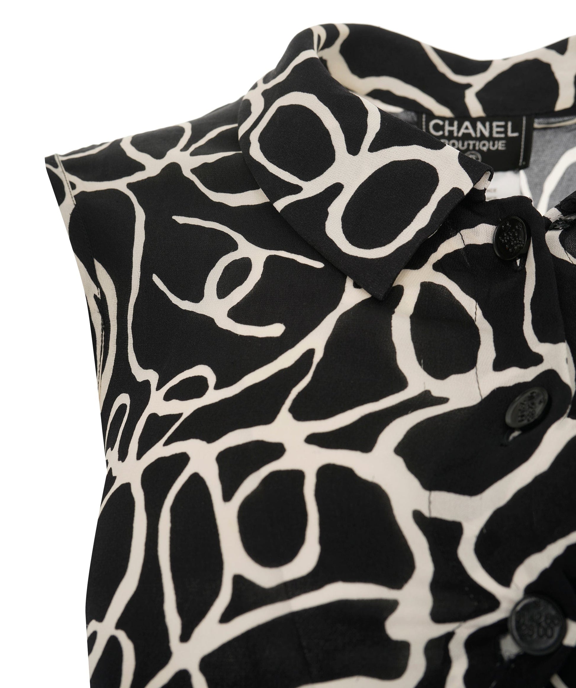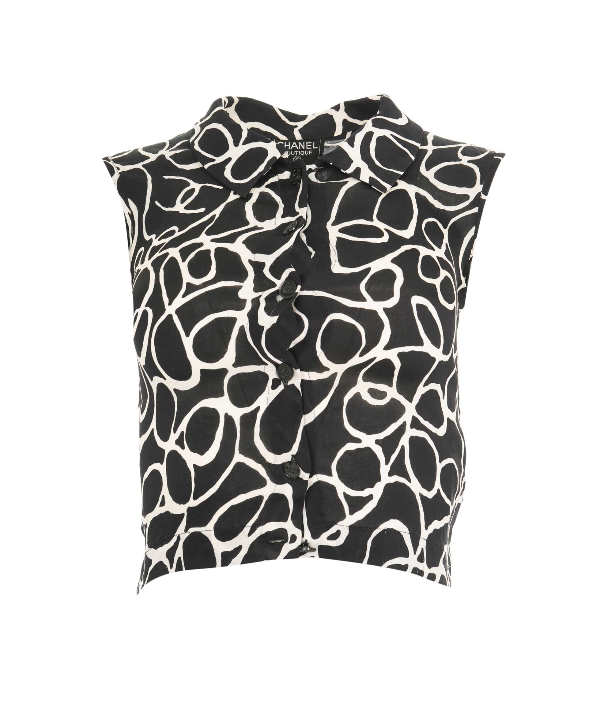 Description: This exquisite Chanel 98P Silk Top is a sleeveless piece featuring a striking black-and-white pattern. Made from 100% silk, it offers a luxurious feel and a sophisticated look. It is in New condition, with no piling, stains, or odors.
