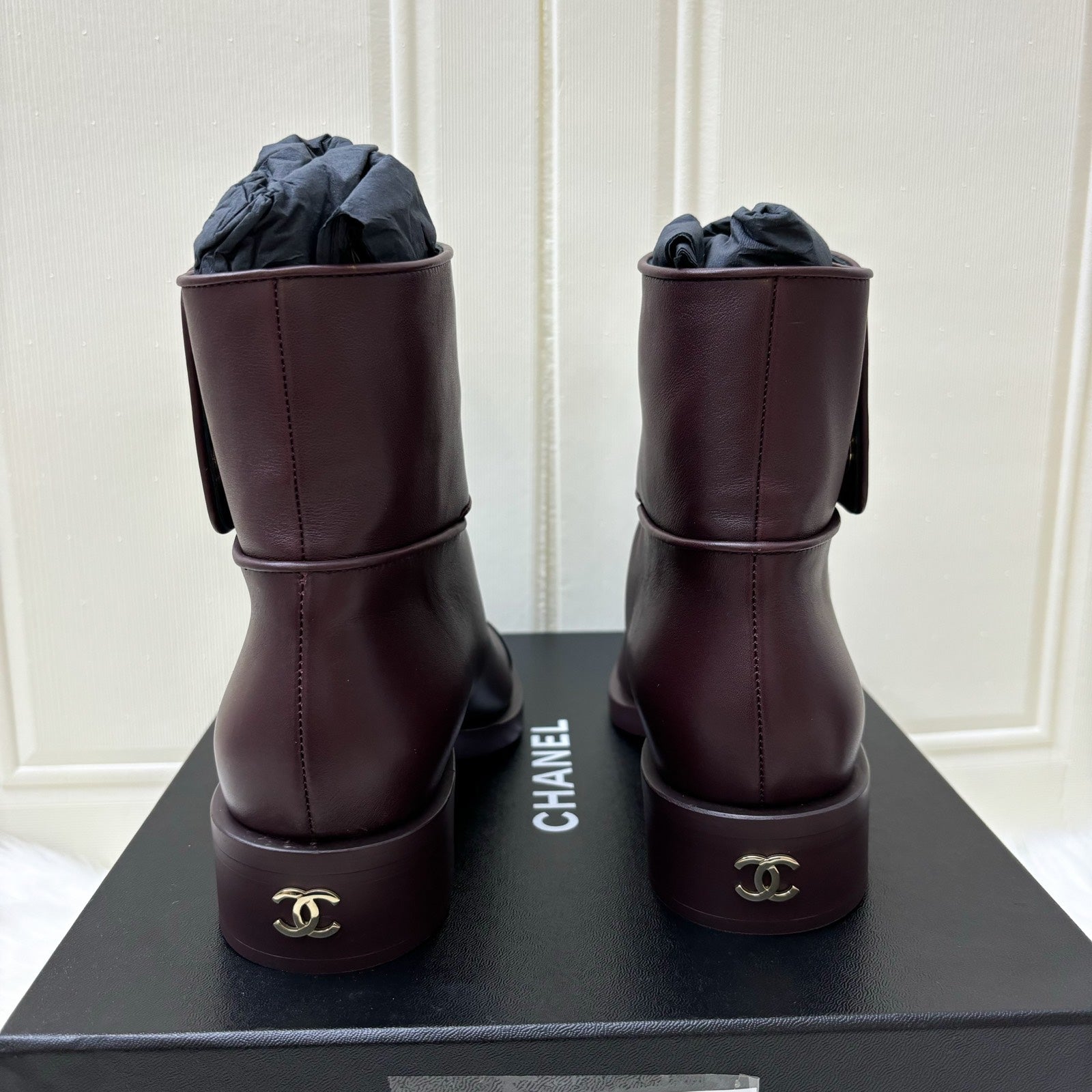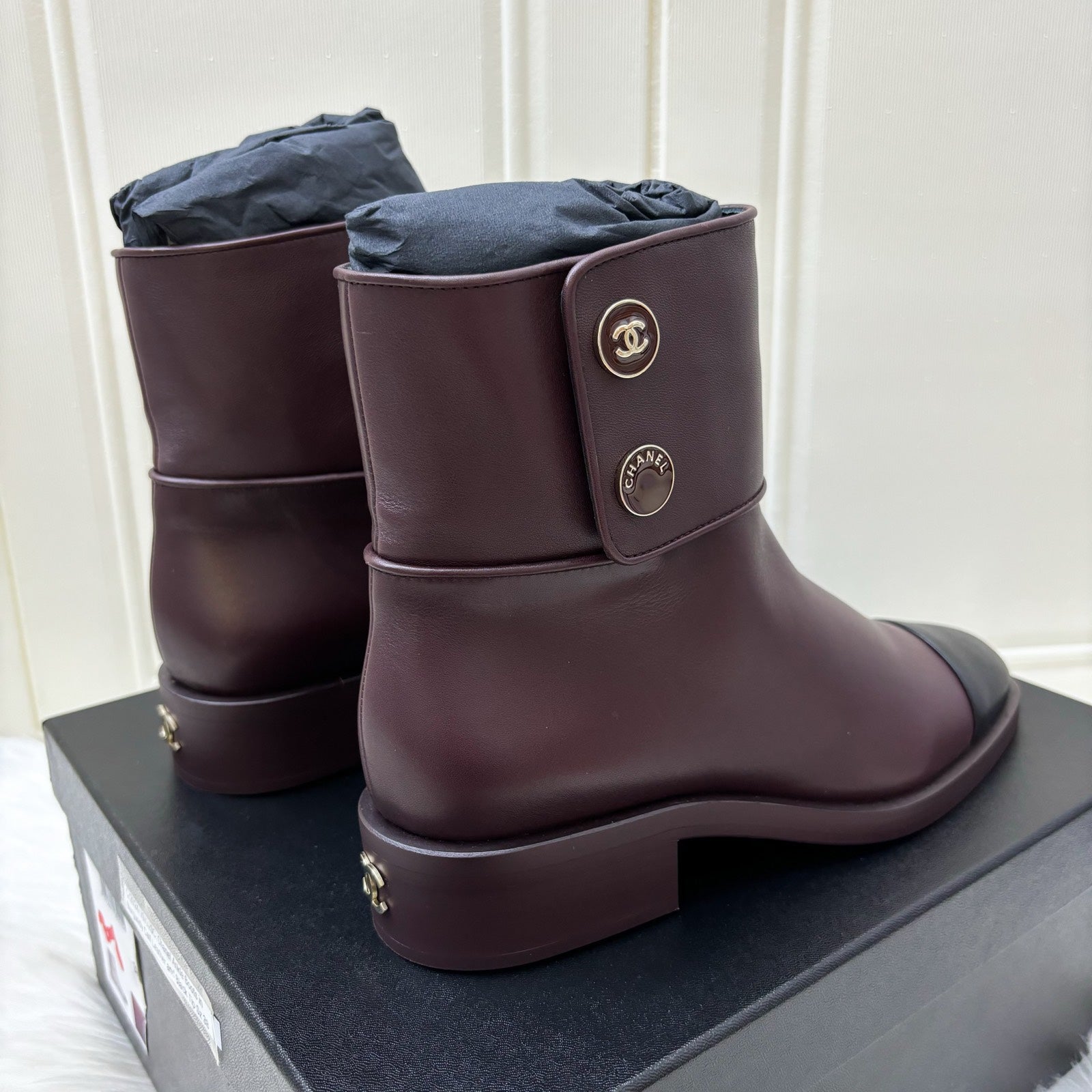 Chanel Ankle Boots in Burgundy Calf Leather and Black Tip Sz 38