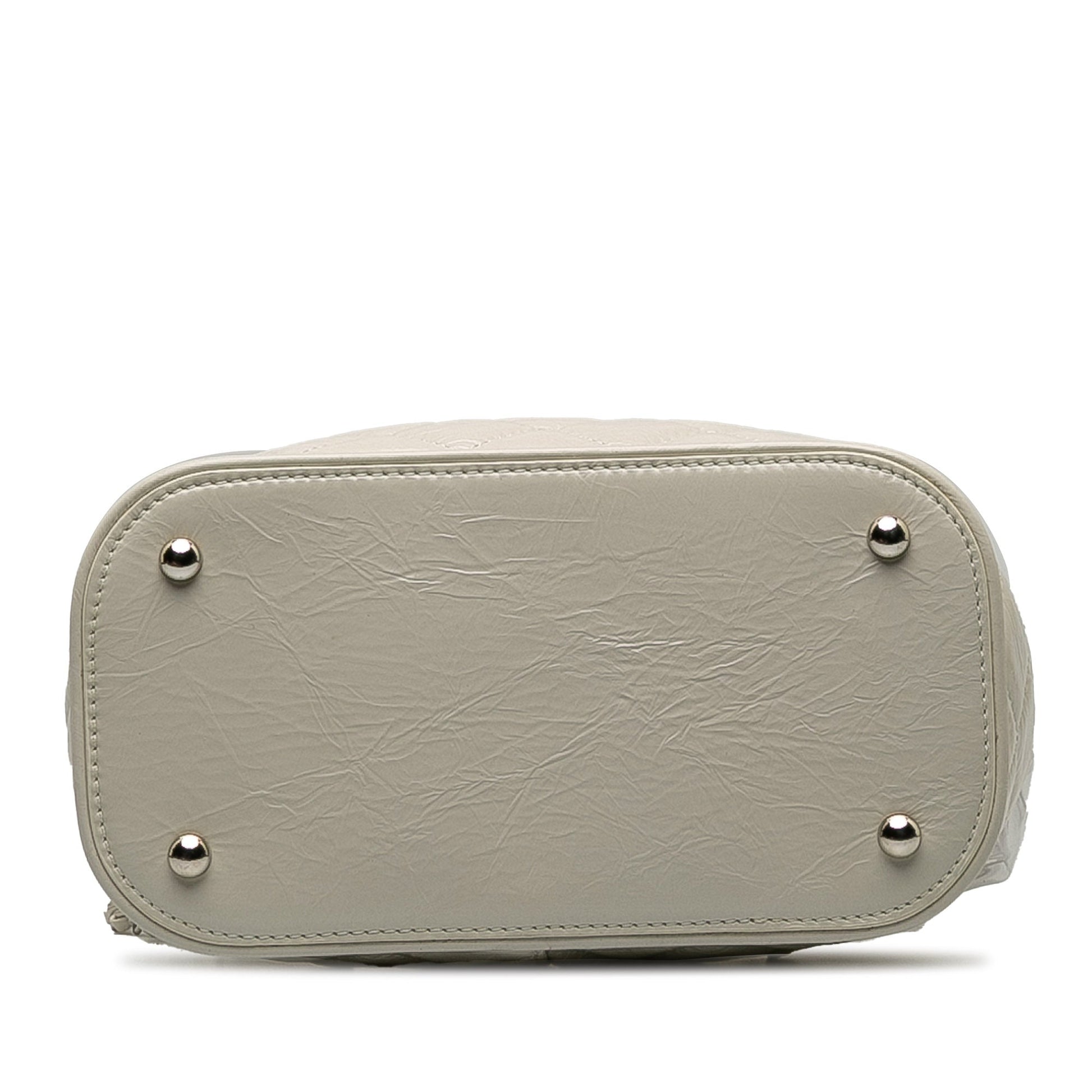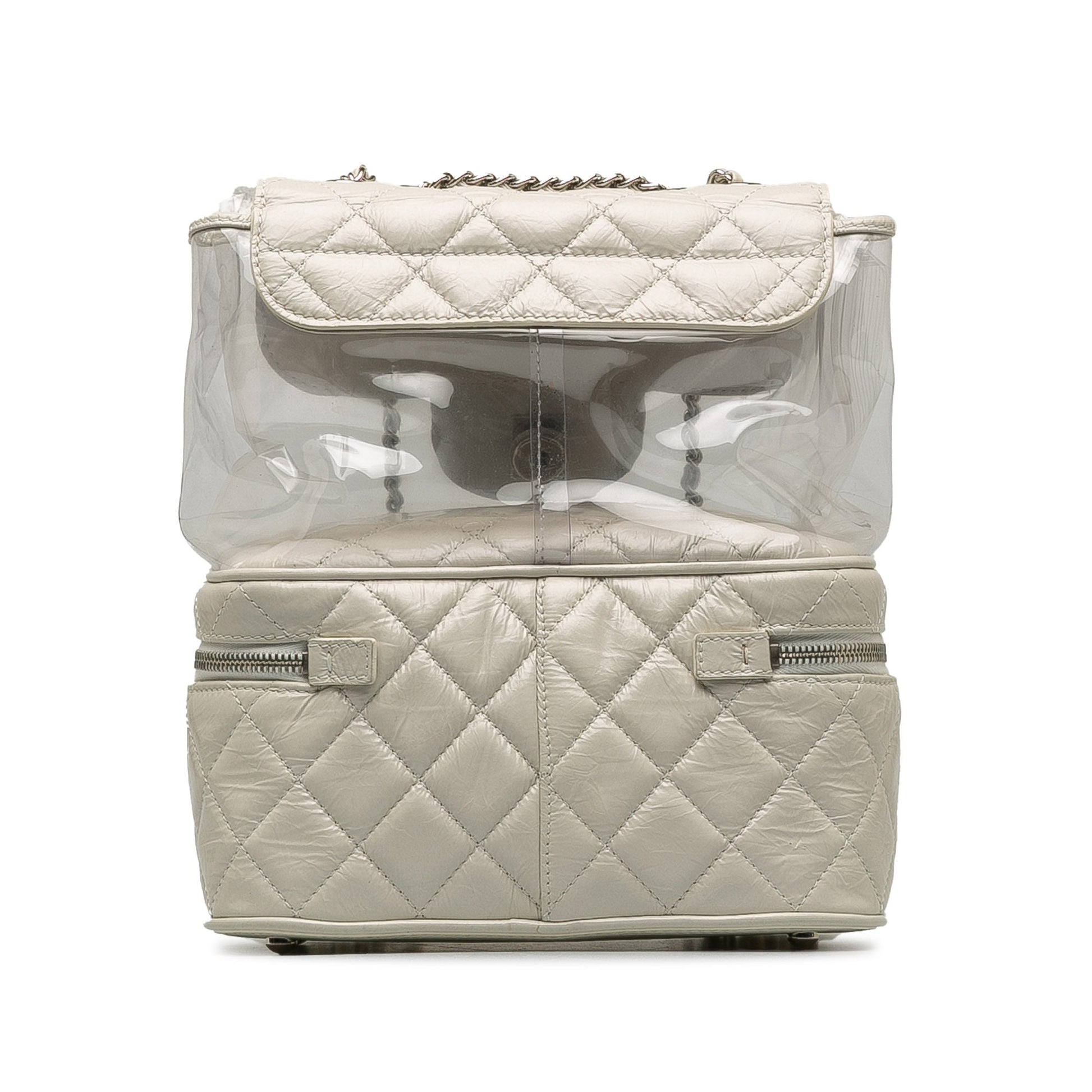 The Aquarium backpack features a quilted lambskin leather and a PVC body, leather woven chain straps, an exterior zip-around compartment, and a top flap with twist-lock closure.