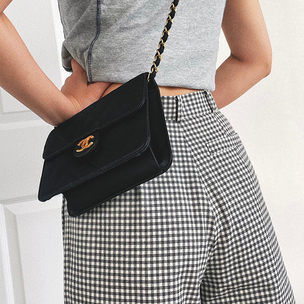 Chanel Around 1985~1990 Silk Satin Cc Mark Plate Straight Flap Chain Bag Black