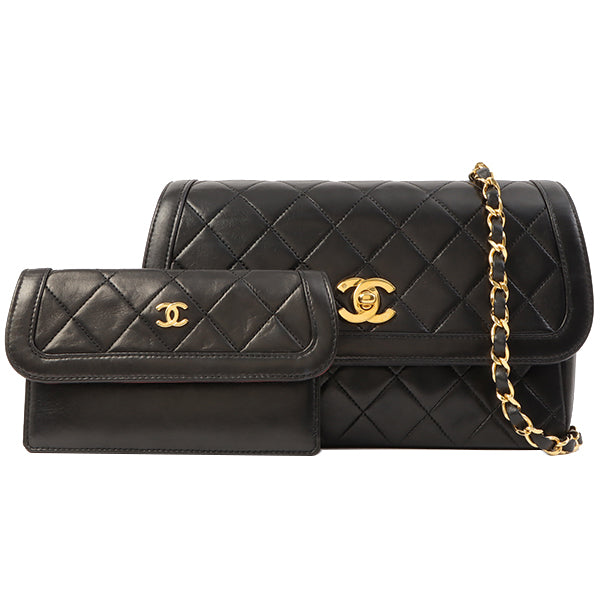 Chanel Around 1990 Made Design Flap Turn-Lock Chain Bag With Pouch Black