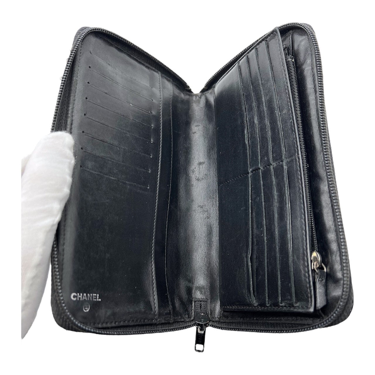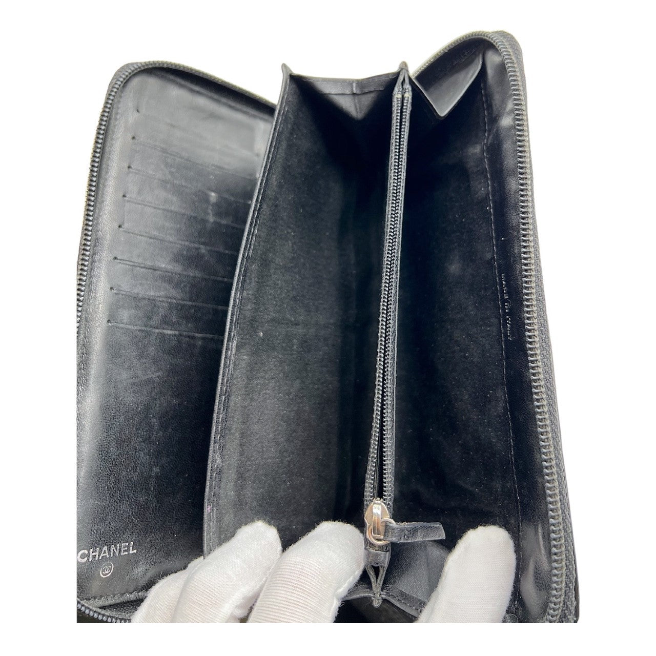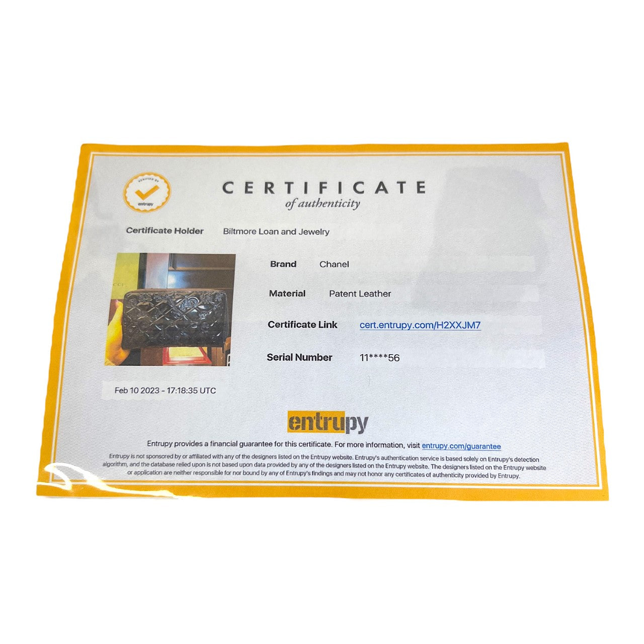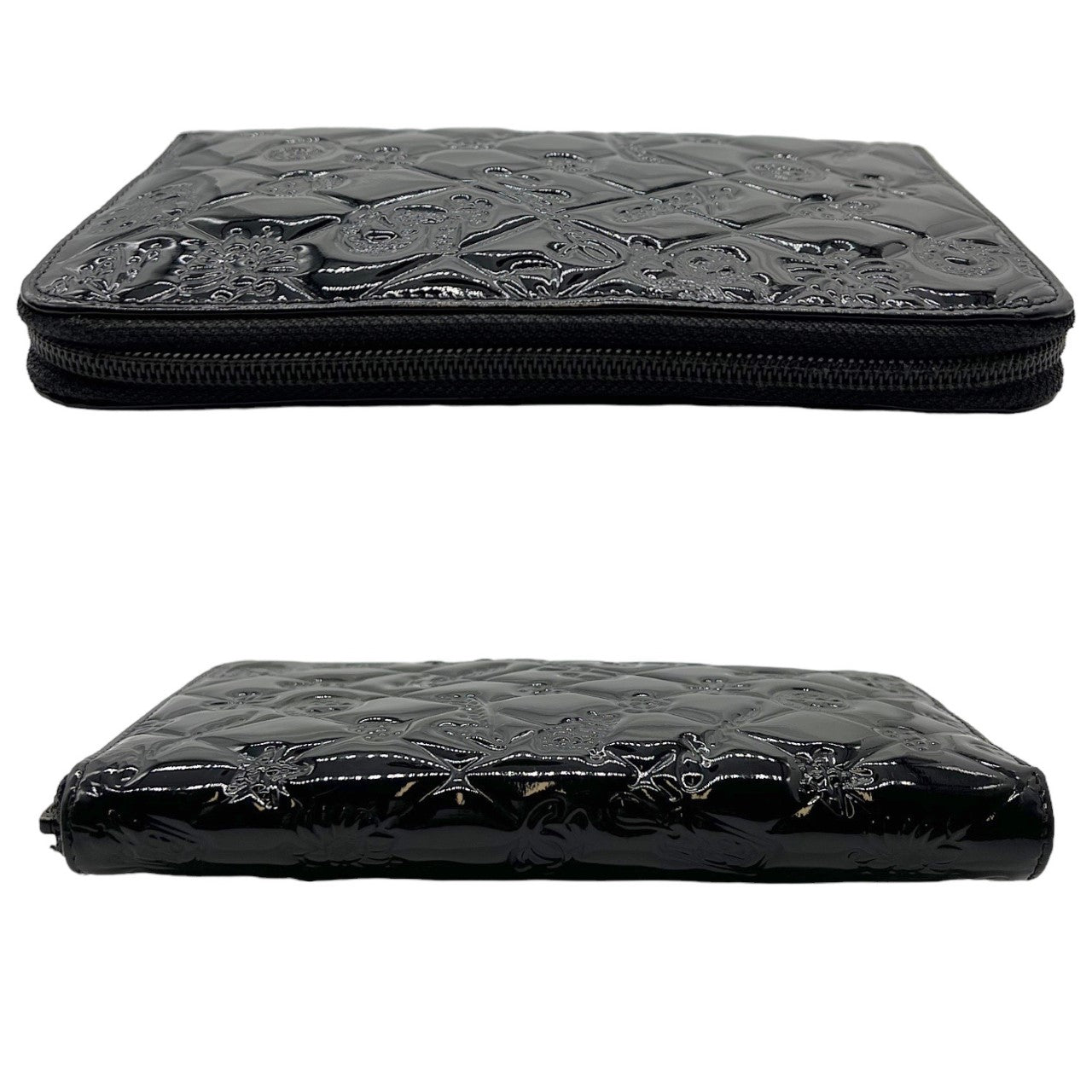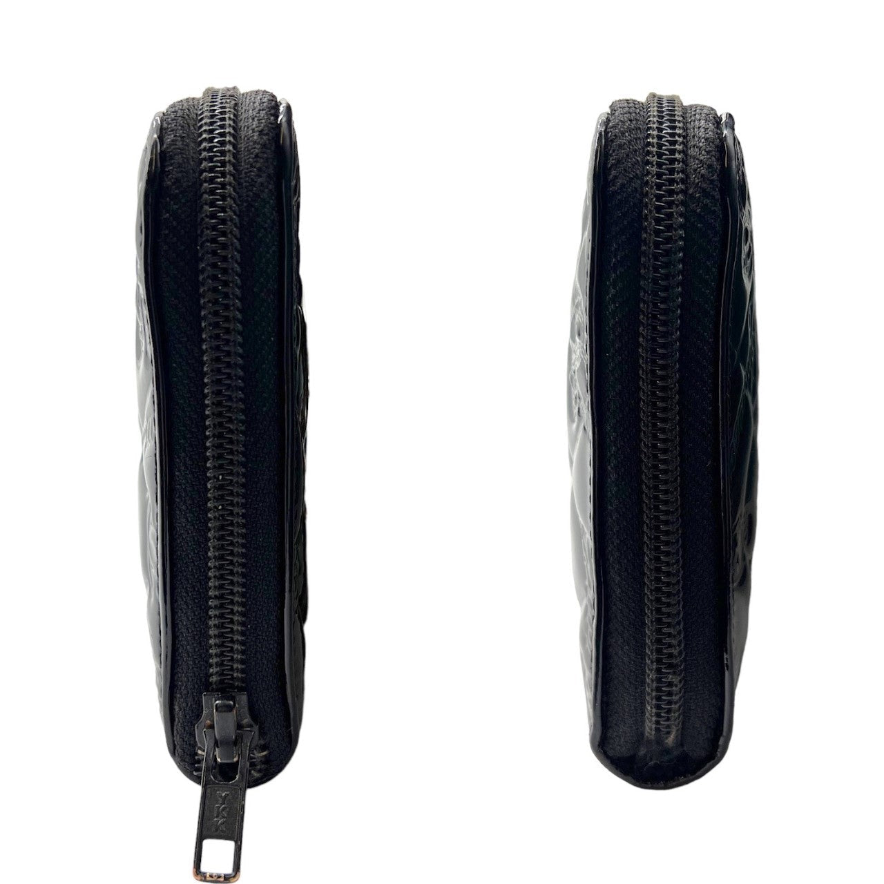 We are offering this beautiful Chanel bag wallet. From the 2008 collection by Karl Lagerfeld, it is finely crafted of black patent leather with a black-tone hardware zipper closure that opens up to a black leather interior with a silver-tone zippered compartment, 4 bill pockets, and 16 card slots. This wallet is perfect for everyday use with its compact design and many pockets. This wallet is certified by Entrupy.