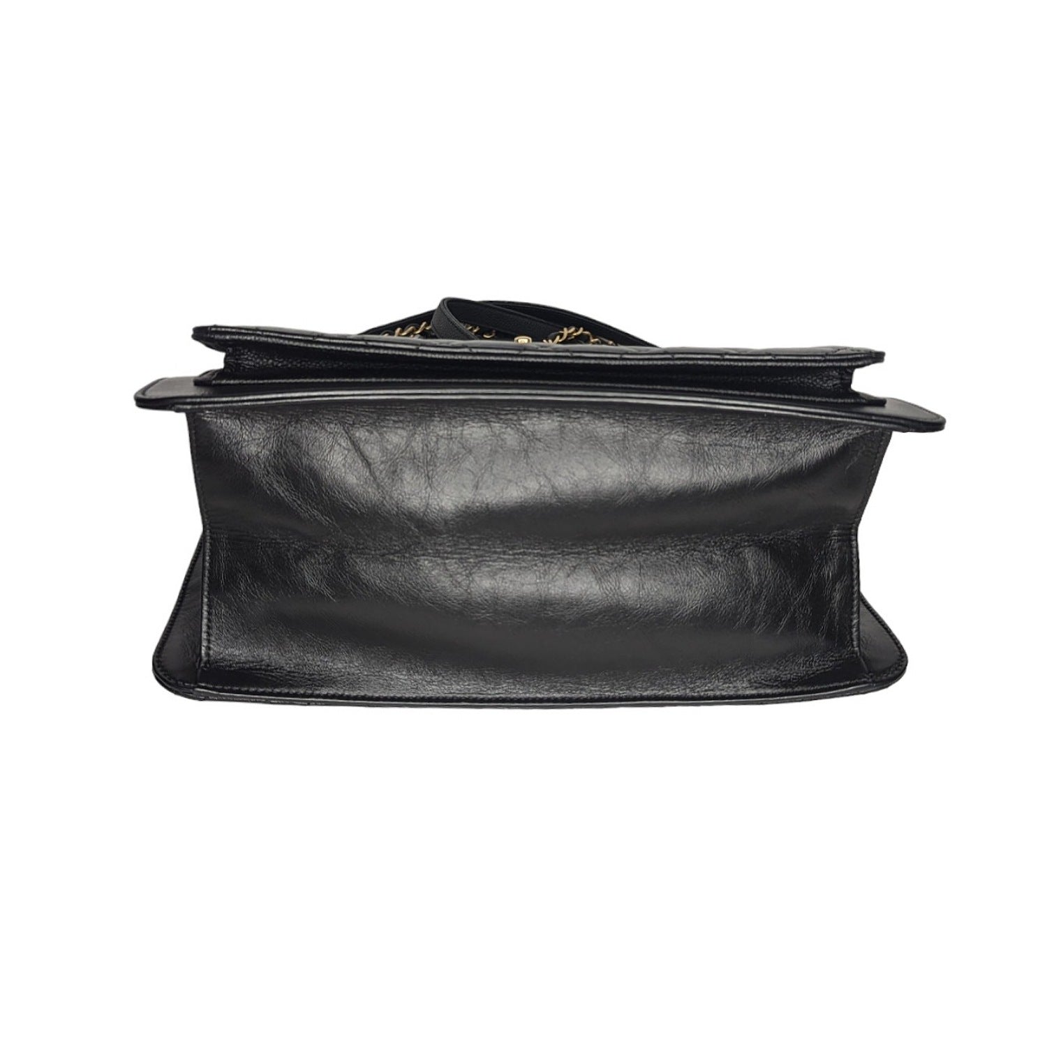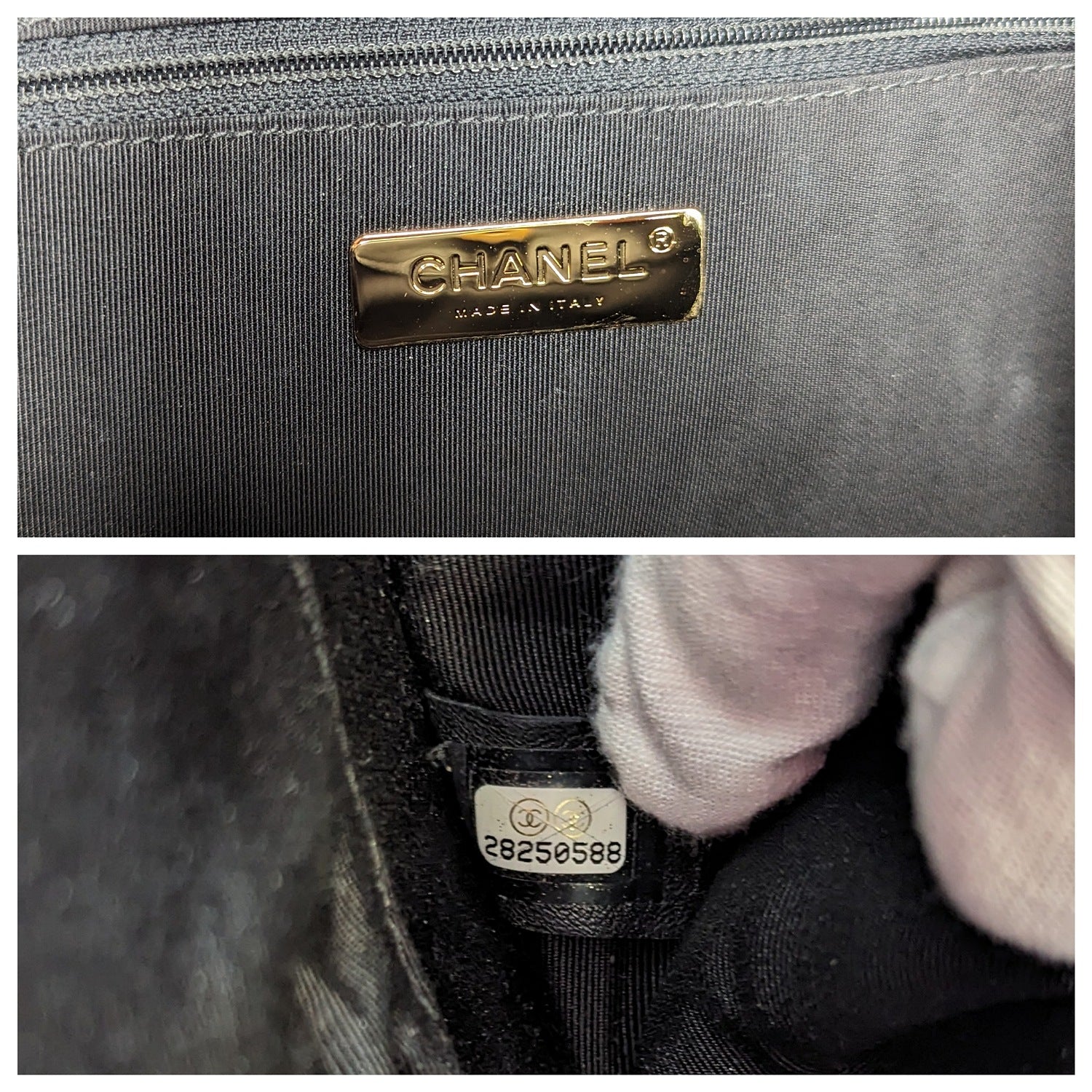 This stunning shoulder bag is crafted of smooth calfskin leather in black. The bag features aged gold chain link leather threaded shoulder straps with shoulder pads, dual flat top handles, and a frontal aged gold Chanel bag CC with a front quilted patch pocket. The top opens to a partitioned fabric interior with a zipper and patch pockets.