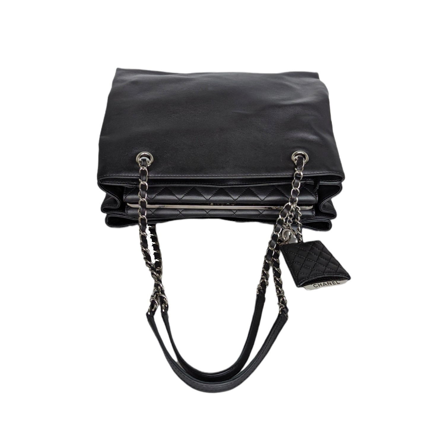 From the 2016 Collection by Karl Lagerfeld. This Chanel bag Accordion Shopping Tote is crafted of smooth Lambskin leather with quilted sides and trim. It features leather woven chain straps with leather shoulder pads, protective base studs, and silver-toned hardware. The interior is a fine textile with plenty of compartments and pockets.