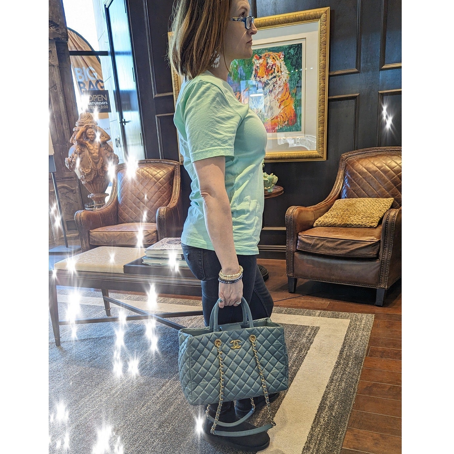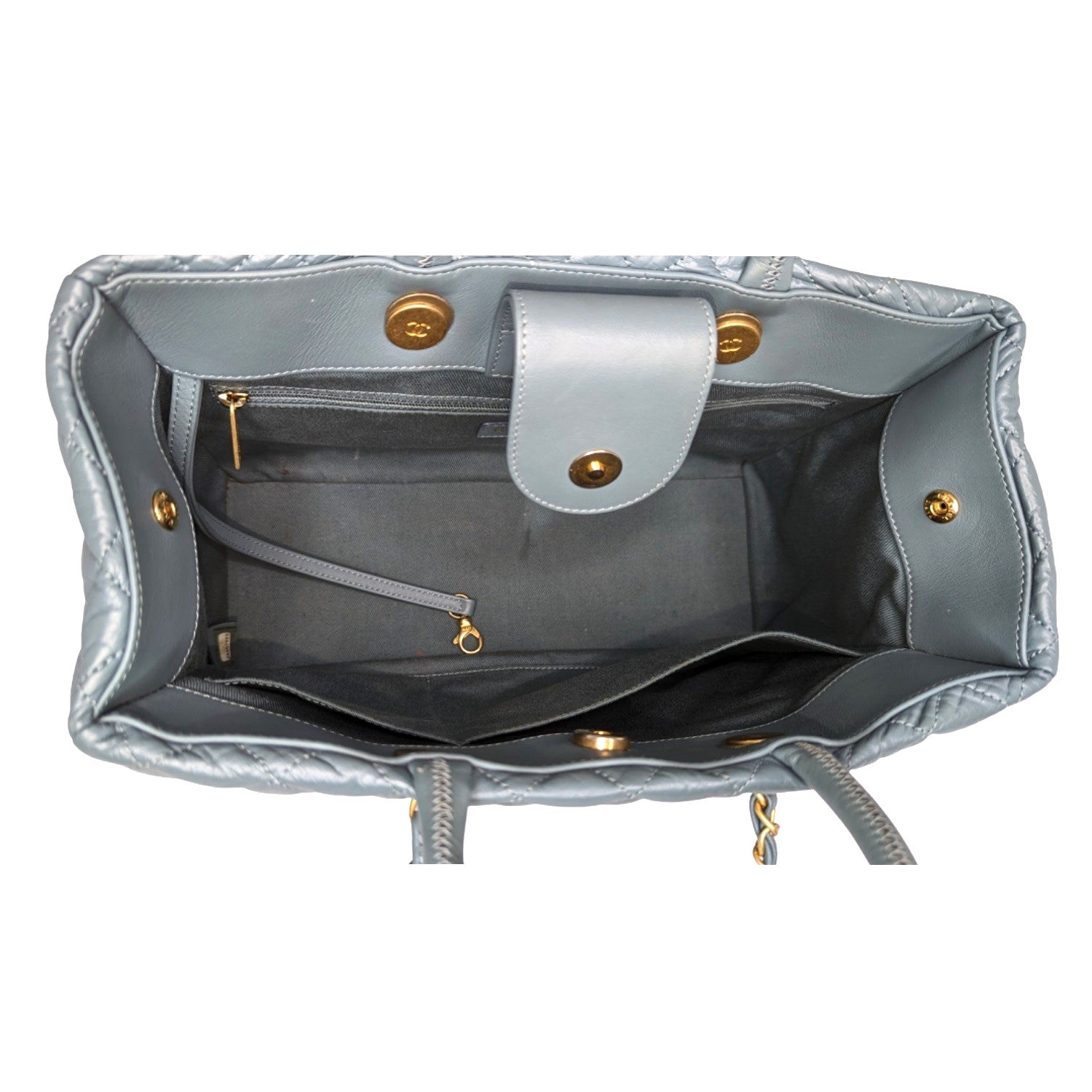 Chanel bag Coco Allure Shopping Bag is crafted of diamond quilted blue aged Calfskin leather with aged gold-tone hardware. It features chain and leather threaded shoulder straps, dual rolled top handles, gold Chanel bag CC logo on the front, an exterior patch pocket. Snap closure at top that opens to a blue interior lining with zipper, patch pockets, and a removable central zipper pouch.Β