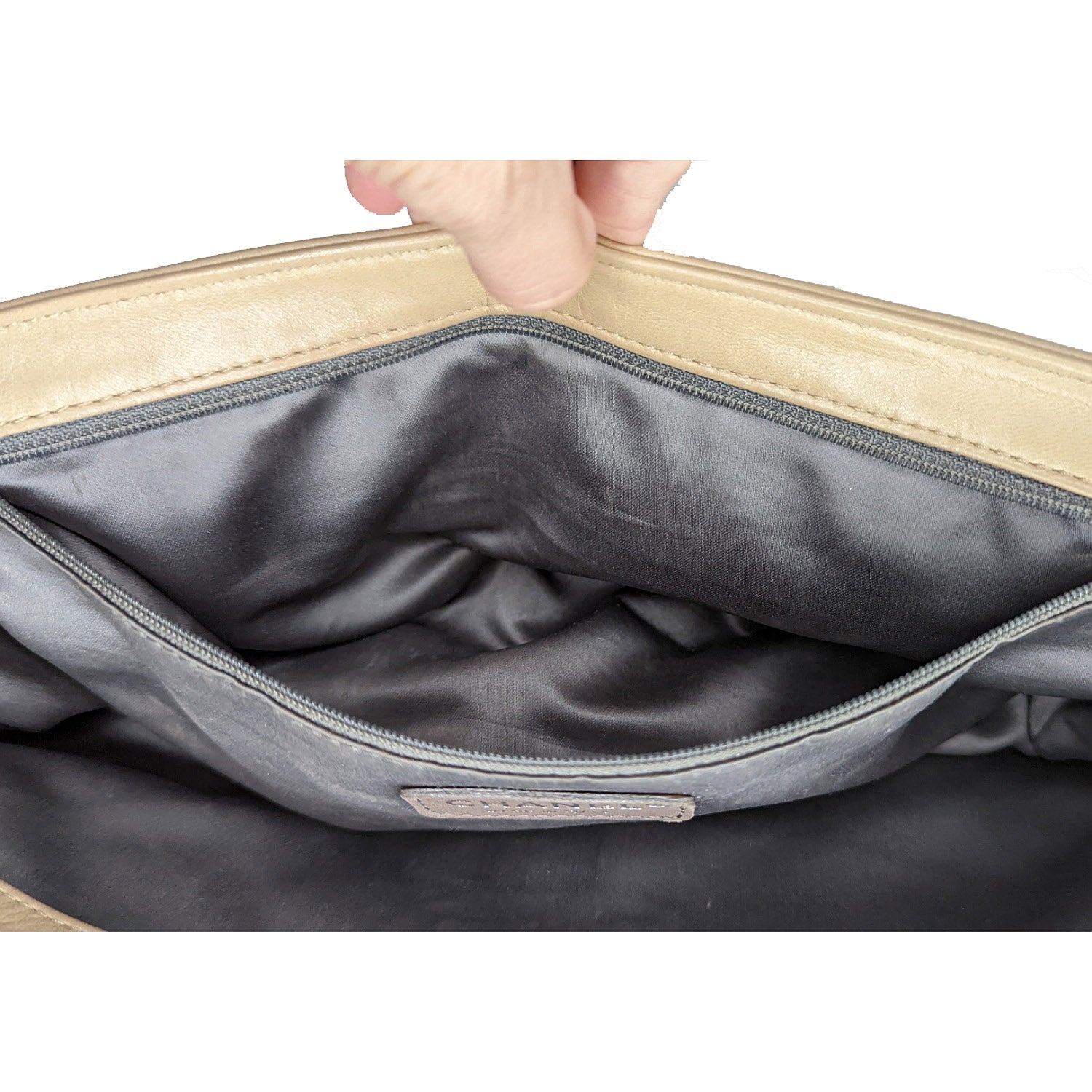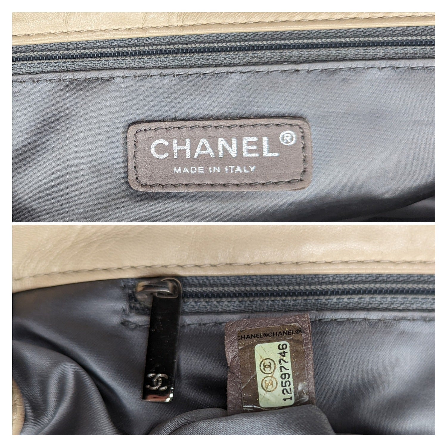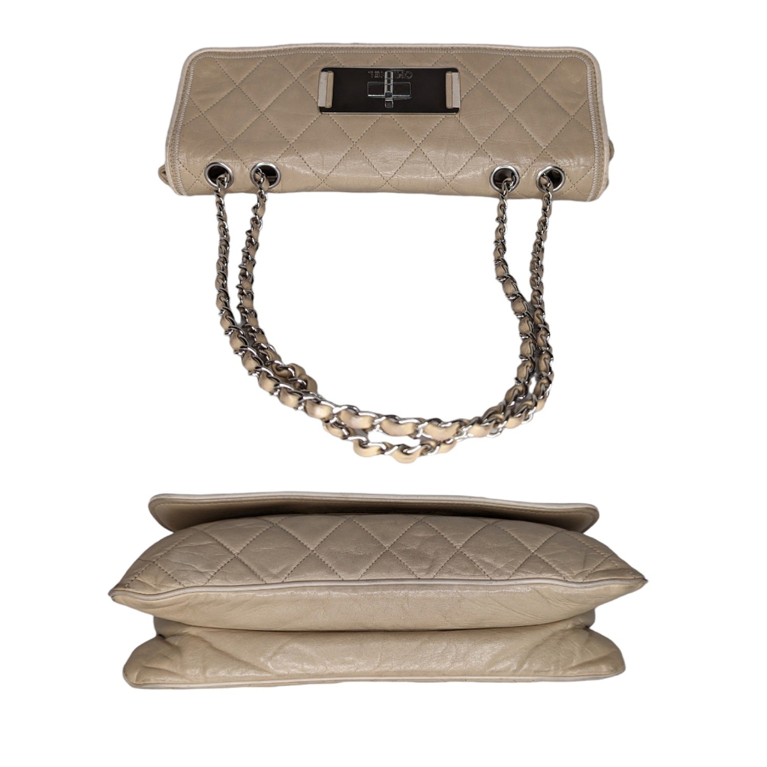 Go glam with this gorgeous Chanel bag Mademoiselle East-West Flap, crafted in beige diamond-quilted lambskin leather with contrast stitching, featuring a silver-tone chain link shoulder strap threaded with leather, sides that expand, a Mademoiselle turn-lock, opens to a gray satin interior lining with a single zip pocket.