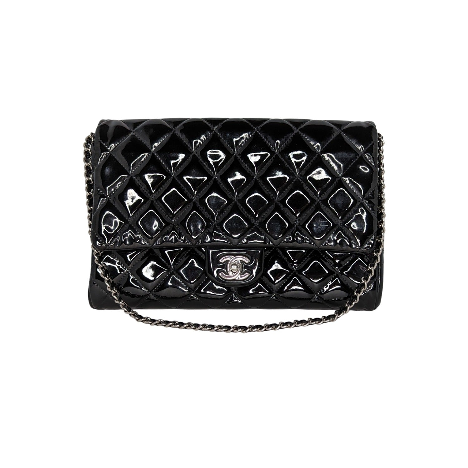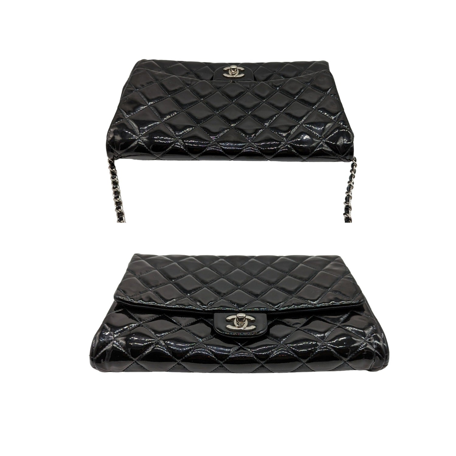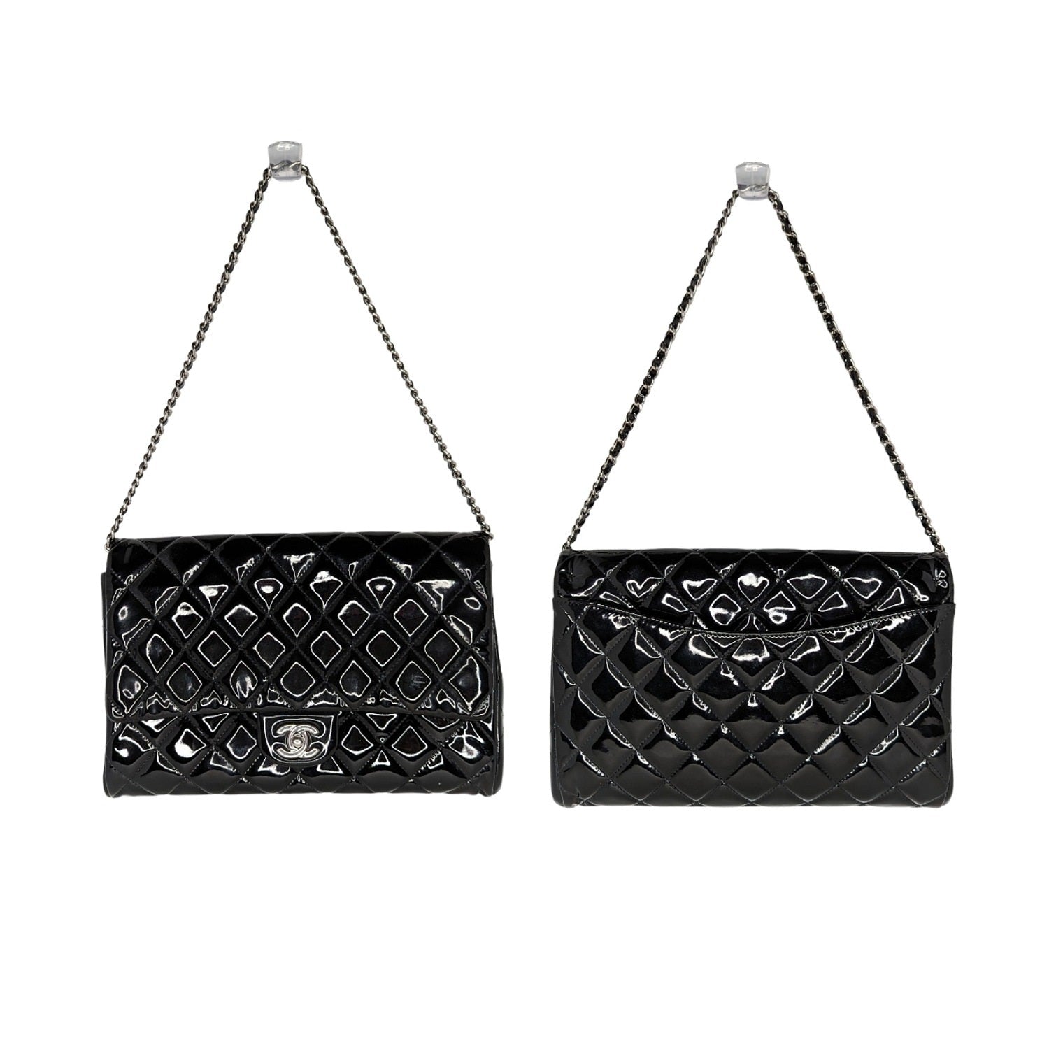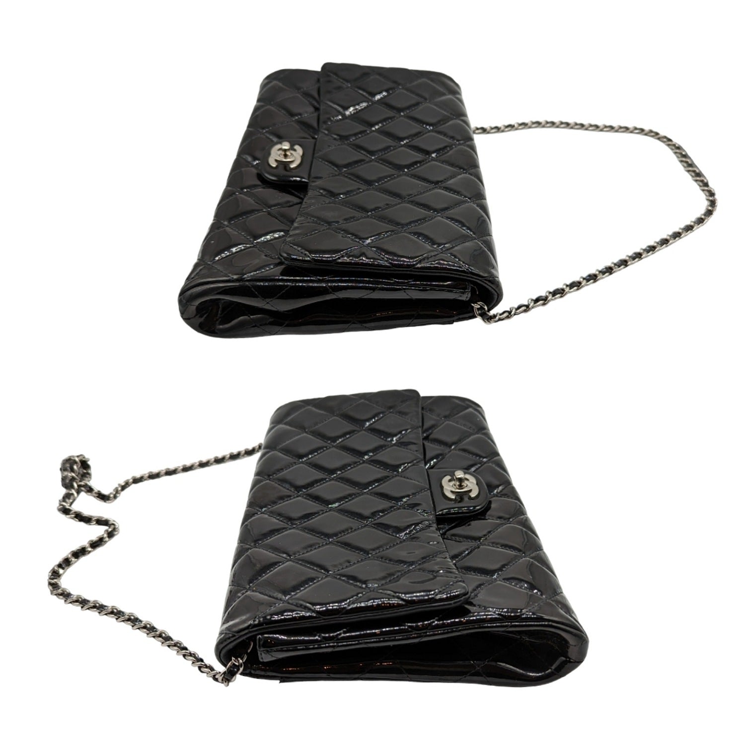 Black quilted patent leather Chanel bag New clutch with silver-tone hardware, drop-in chain-link and leather shoulder strap, exterior slit pocket at back, tonal leather lining, single slit pocket at interior wall and CC turn-lock closure at front flap. Est.
