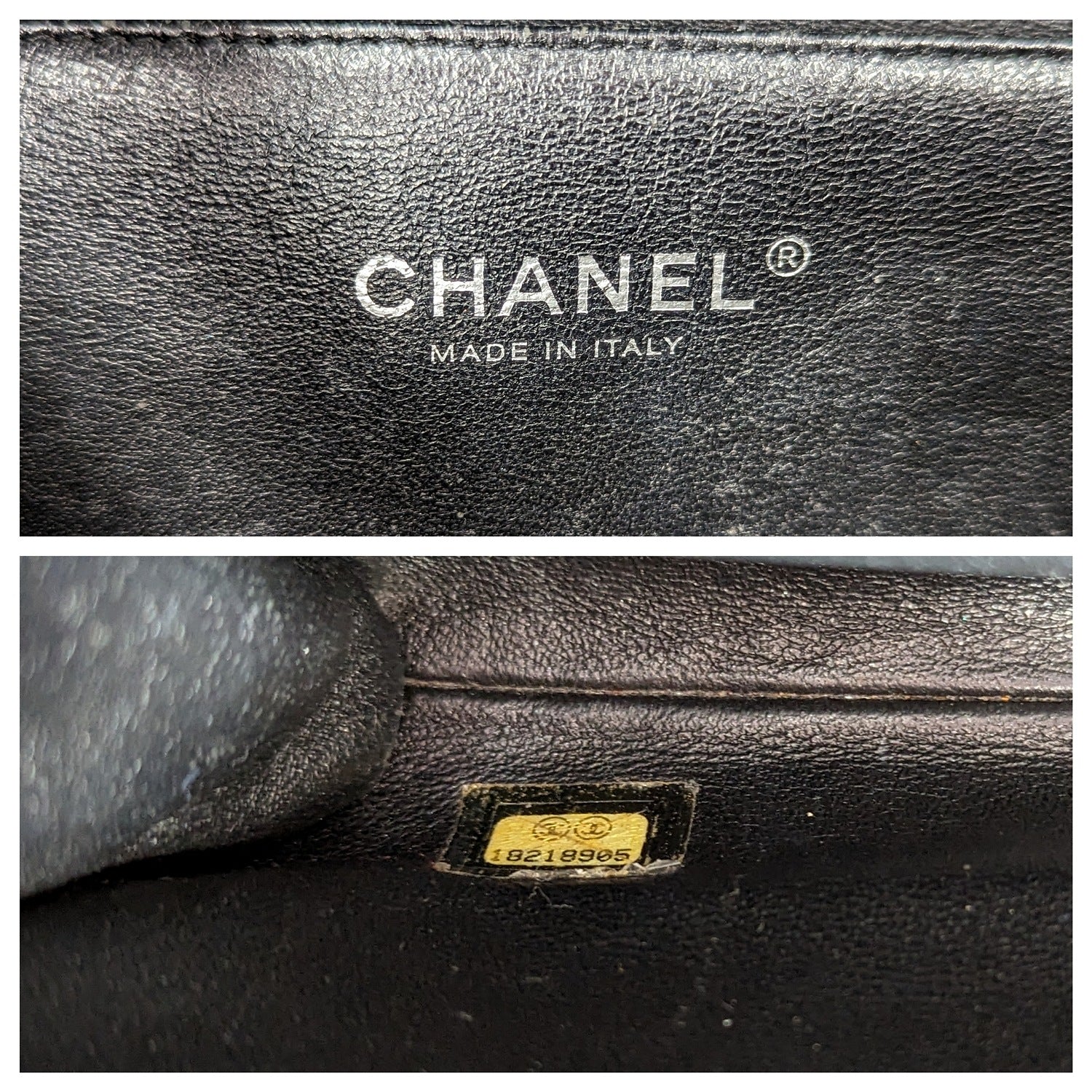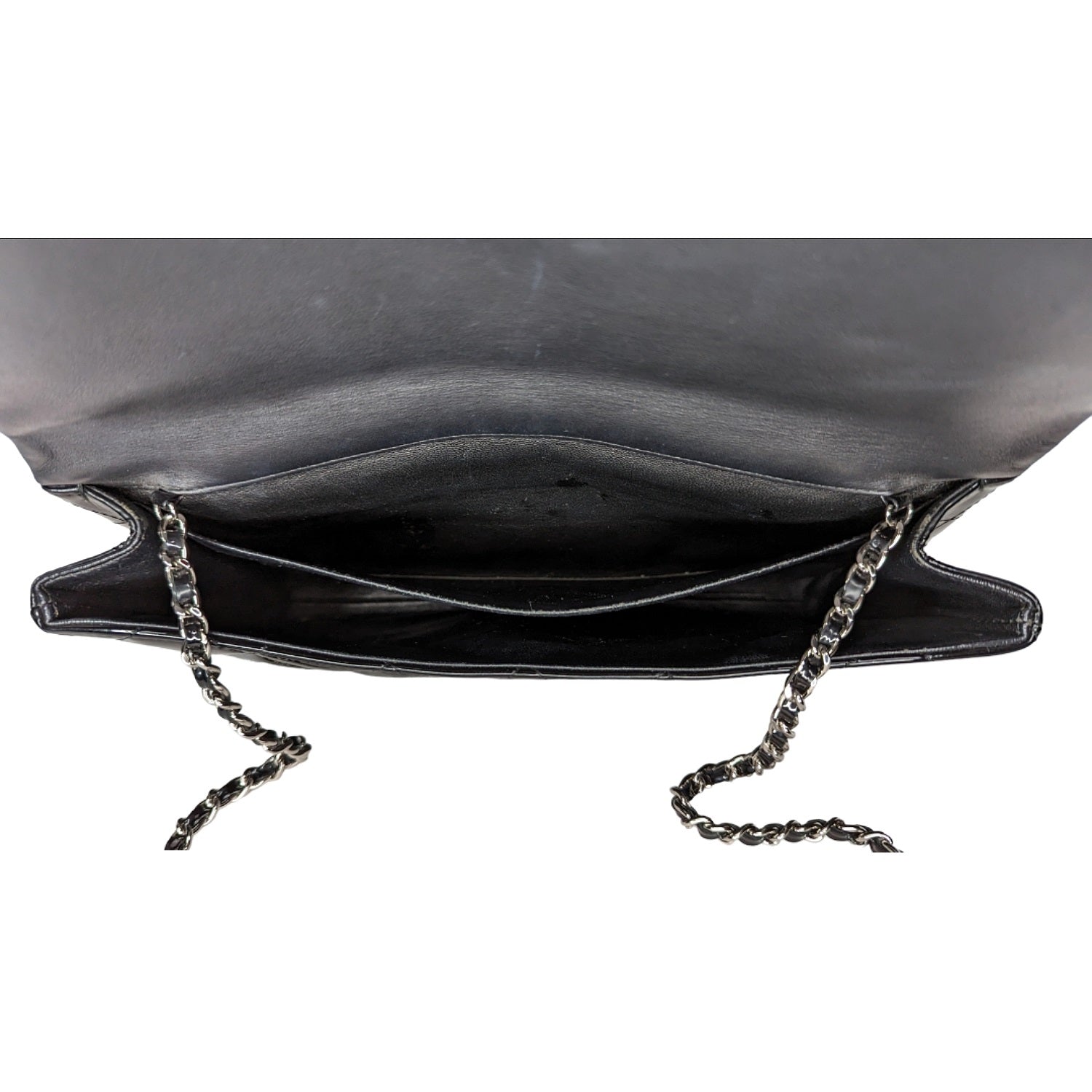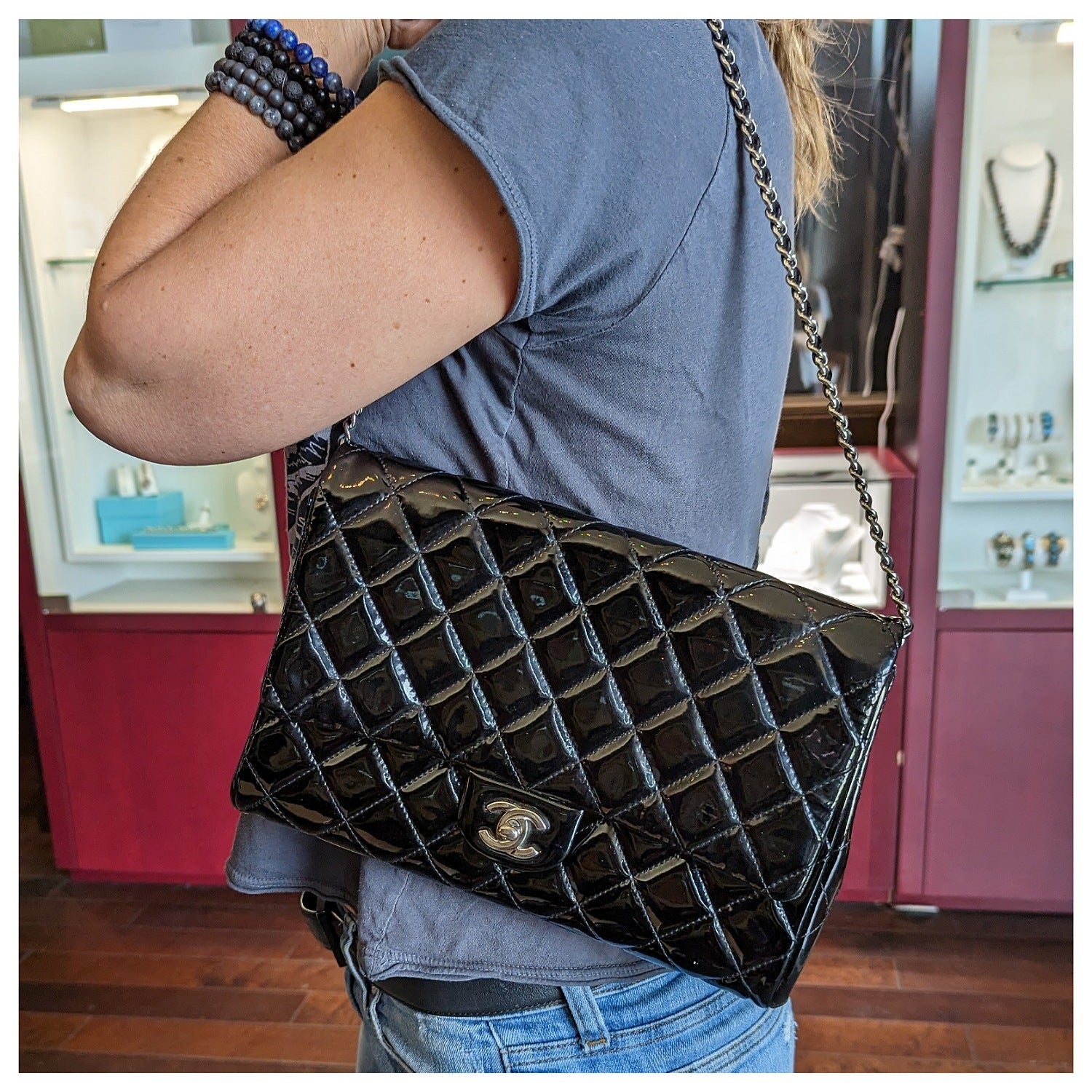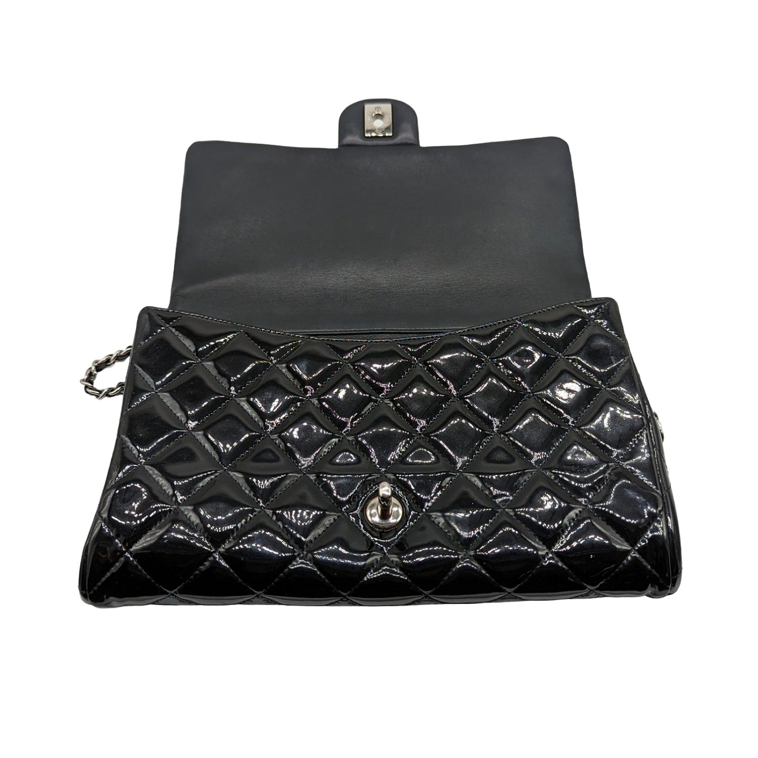 Black quilted patent leather Chanel bag New clutch with silver-tone hardware, drop-in chain-link and leather shoulder strap, exterior slit pocket at back, tonal leather lining, single slit pocket at interior wall and CC turn-lock closure at front flap. Est.