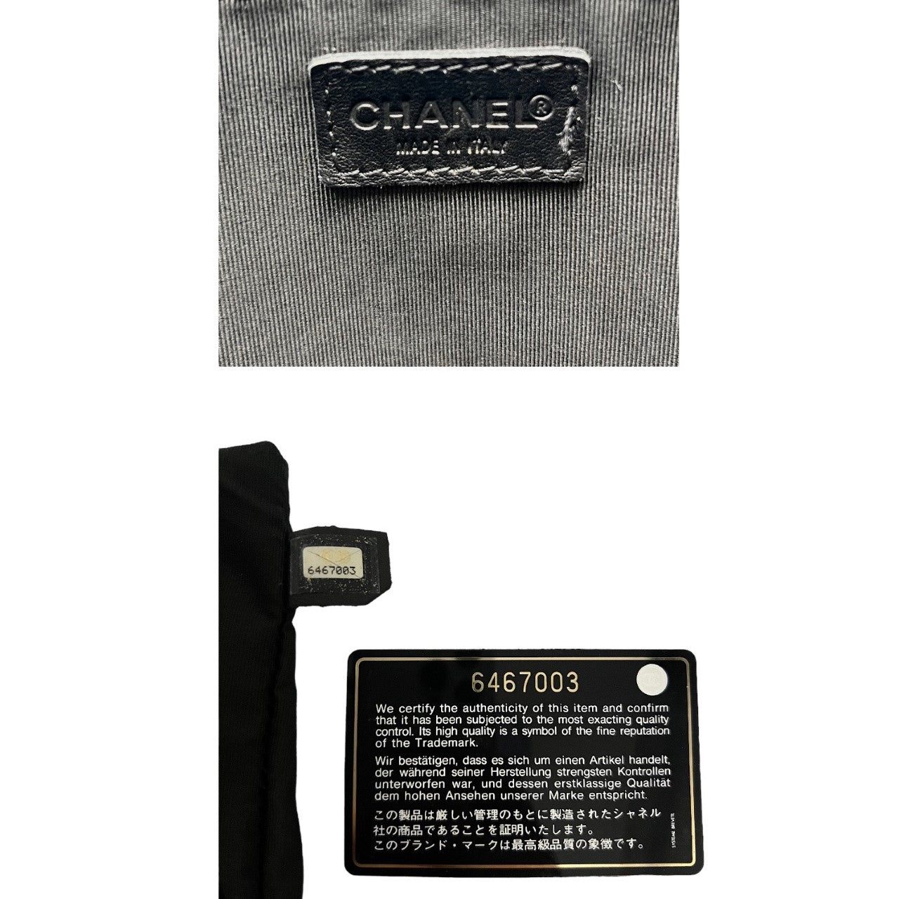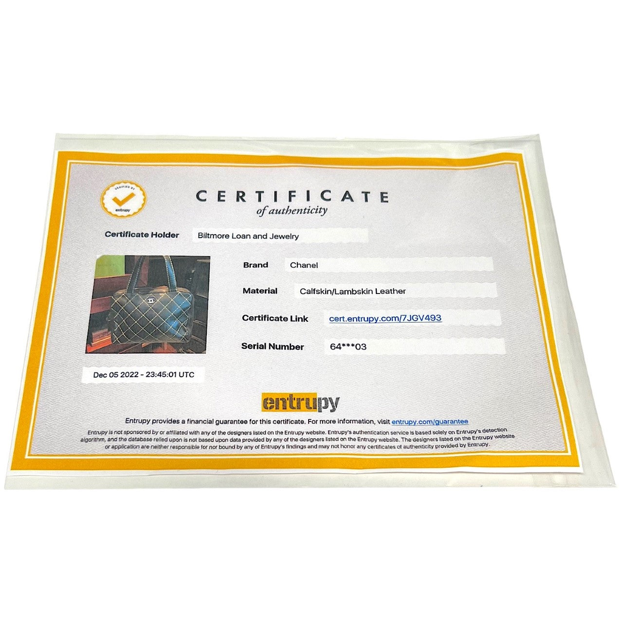 We are offering this elegant black Chanel bag handbag. Made in Italy sometime between 2000 & 2002, it is crafted of black leather with quilted stitch work. It has dual black leather top handles and features a dual zipper closure that opens up to an interior lined in grosgrain with a zipper pocket and a slip pocket. It also features 4 protective studs at the base. Certified by Entrupy.