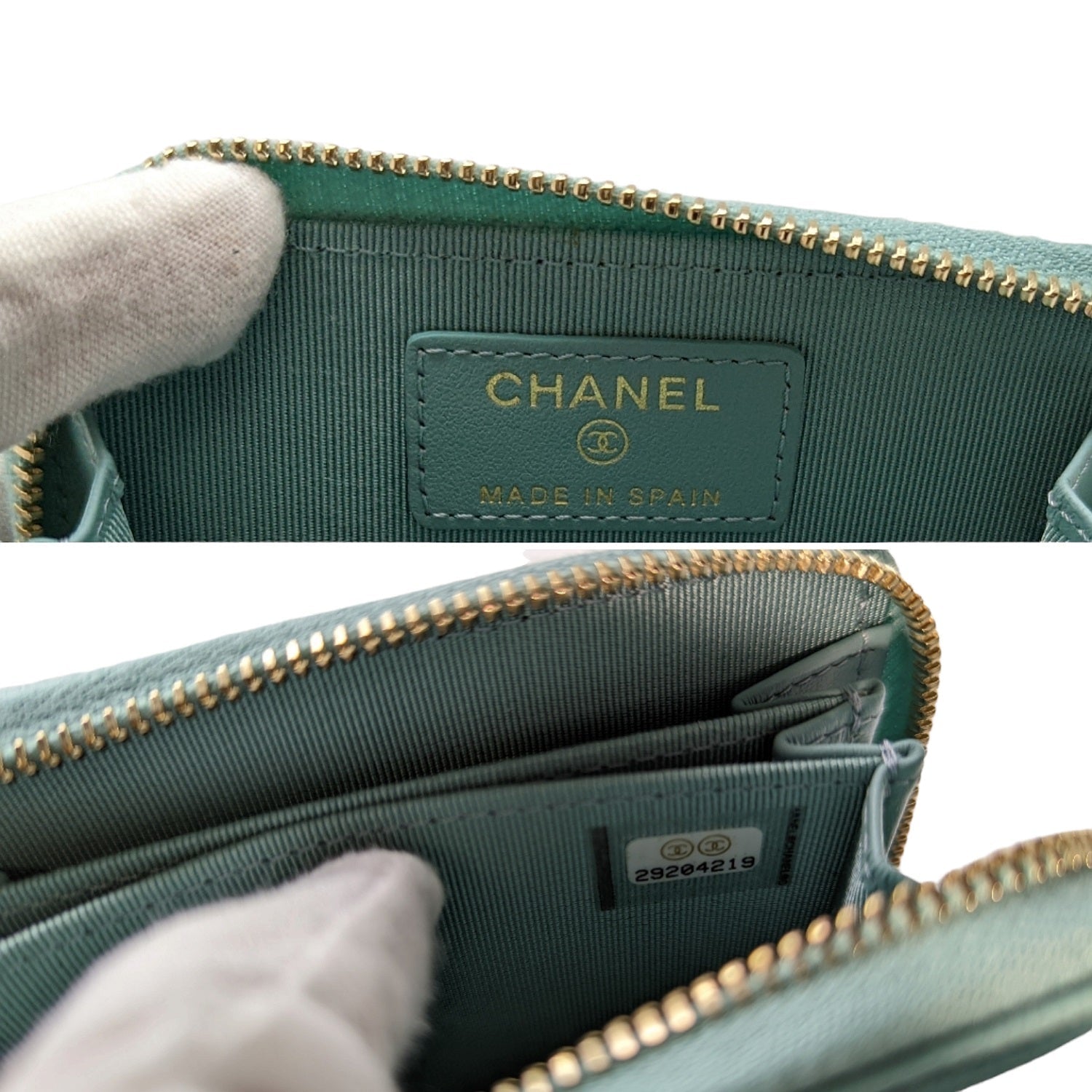 This petite wallet is crafted of sky blue caviar leather and features a wrap-around polished gold zipper with a matching CC logo on the front. The zipper opens to a partitioned fabric interior.