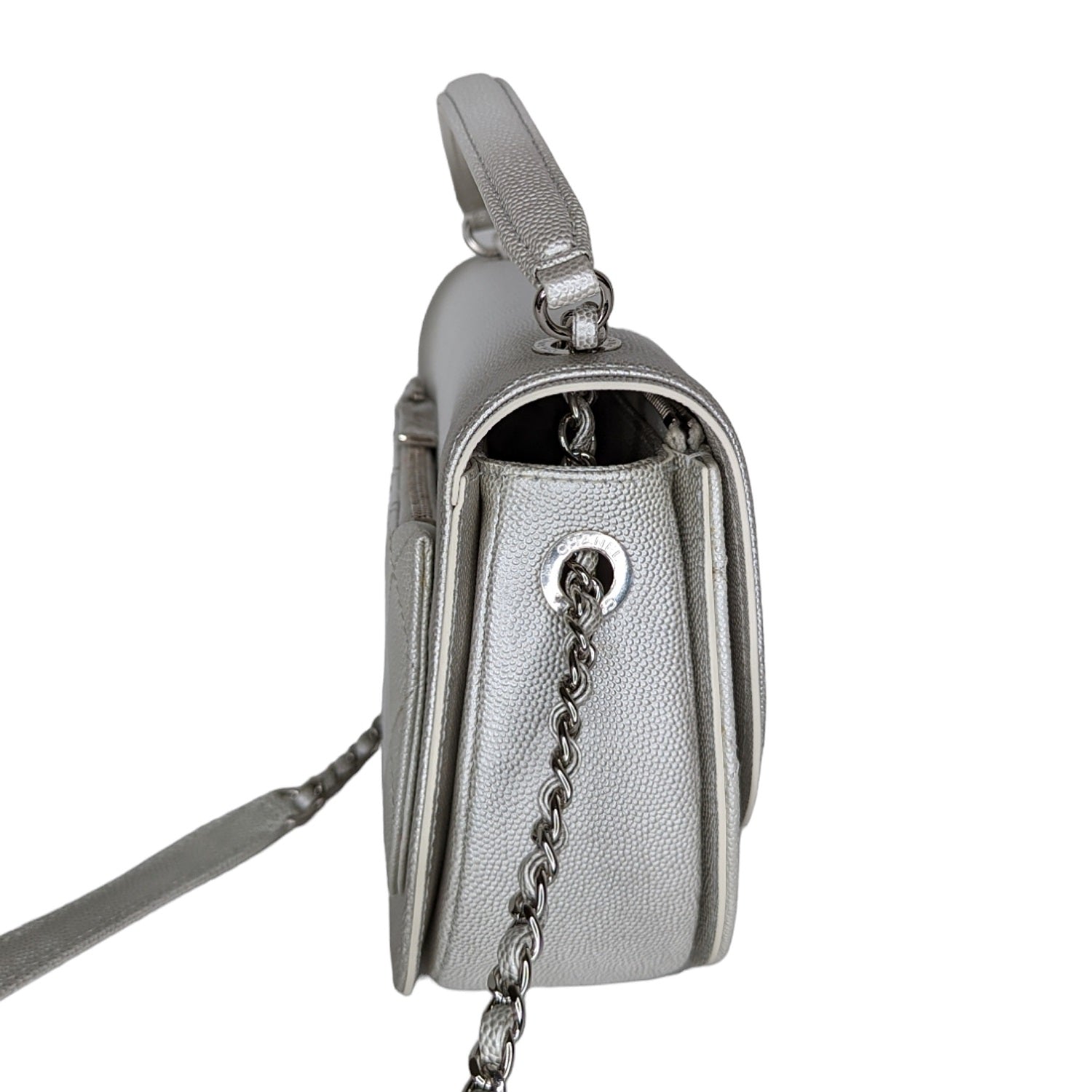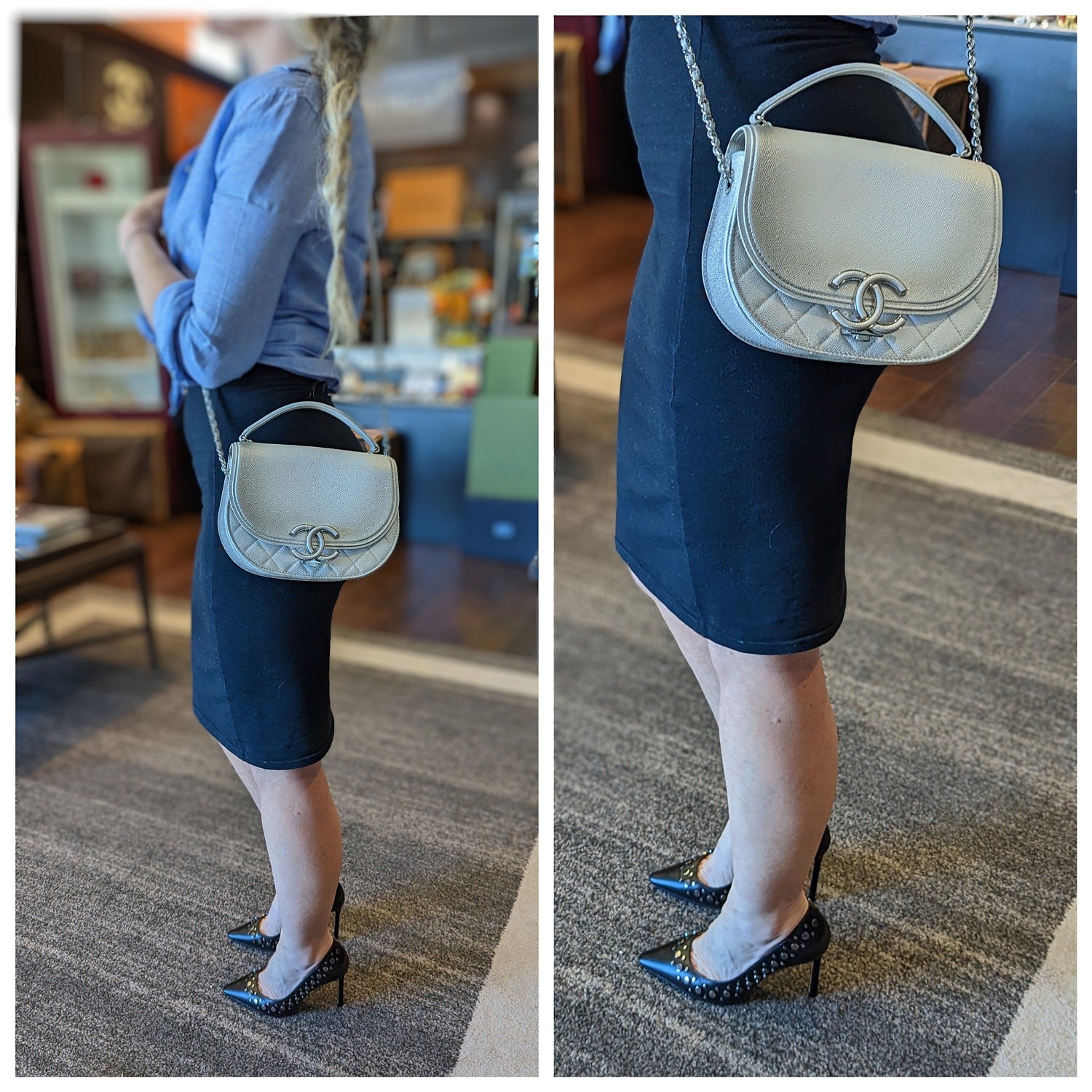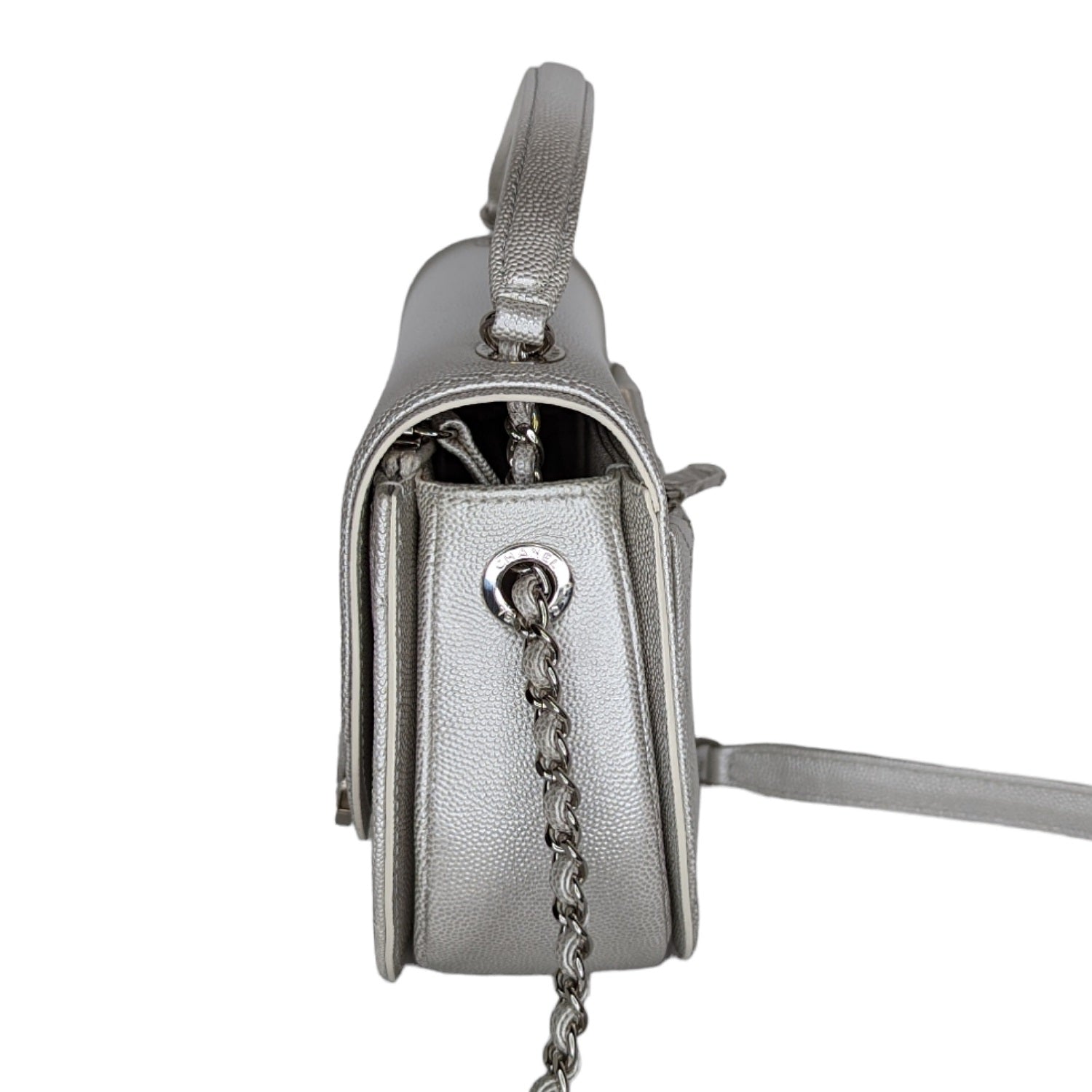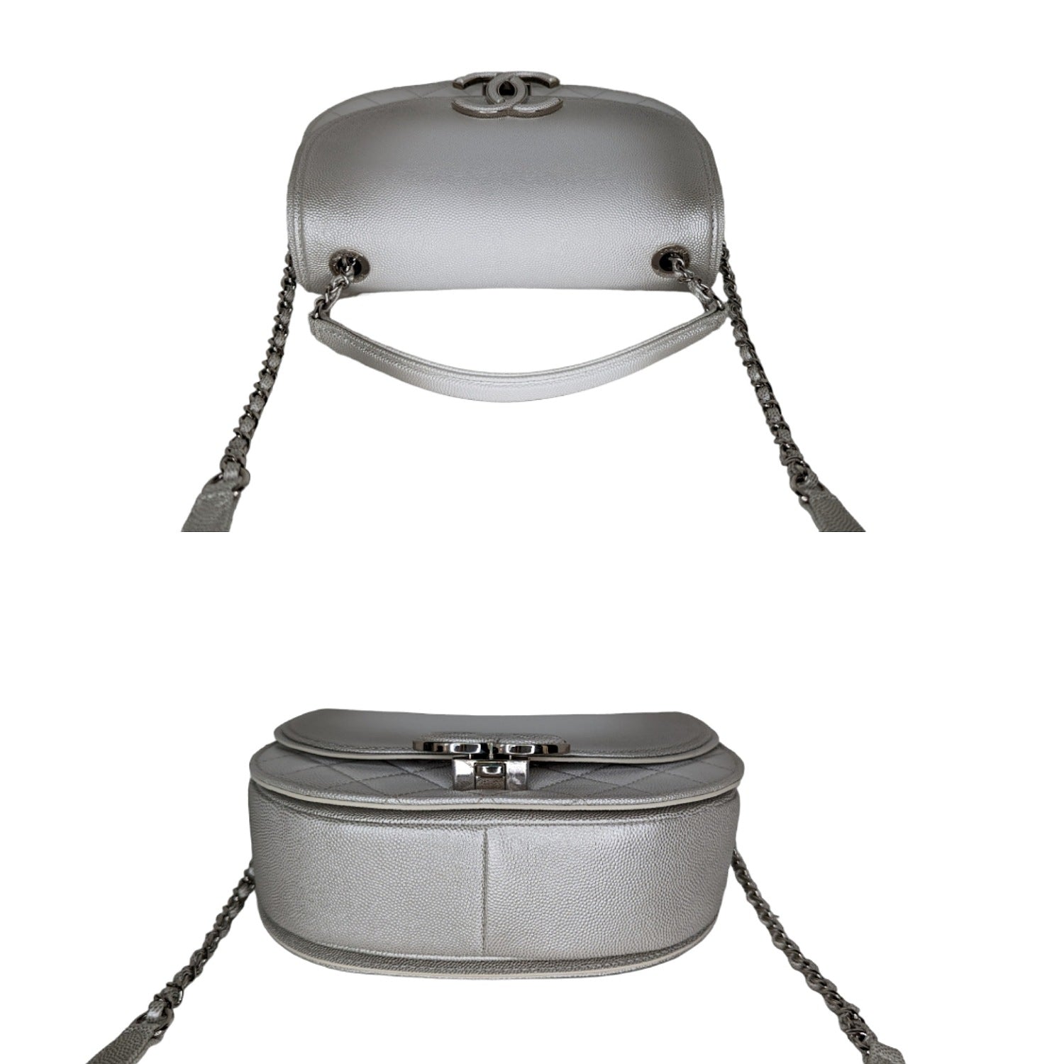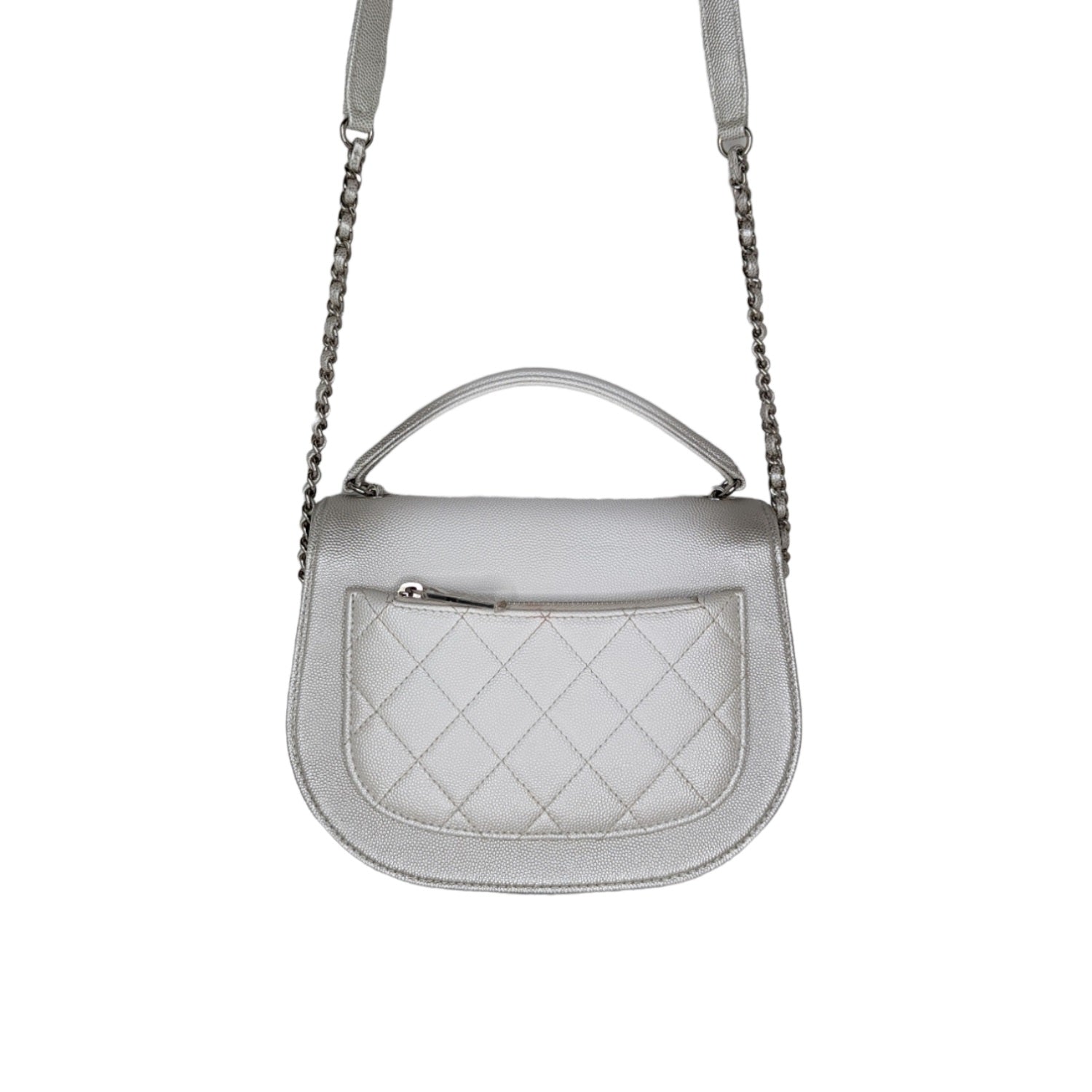 This chic shoulder bag is crafted of quilted grained calfskin leather in silver and white. The handbag features an aged silver chain link leather threaded shoulder strap and chain link top handle, an exterior zippered pocket and a rounded front flap with a Chanel bag CC plate and smooth border trim. This opens to a fabric interior, a zippered front pocket and a small patch pocket.