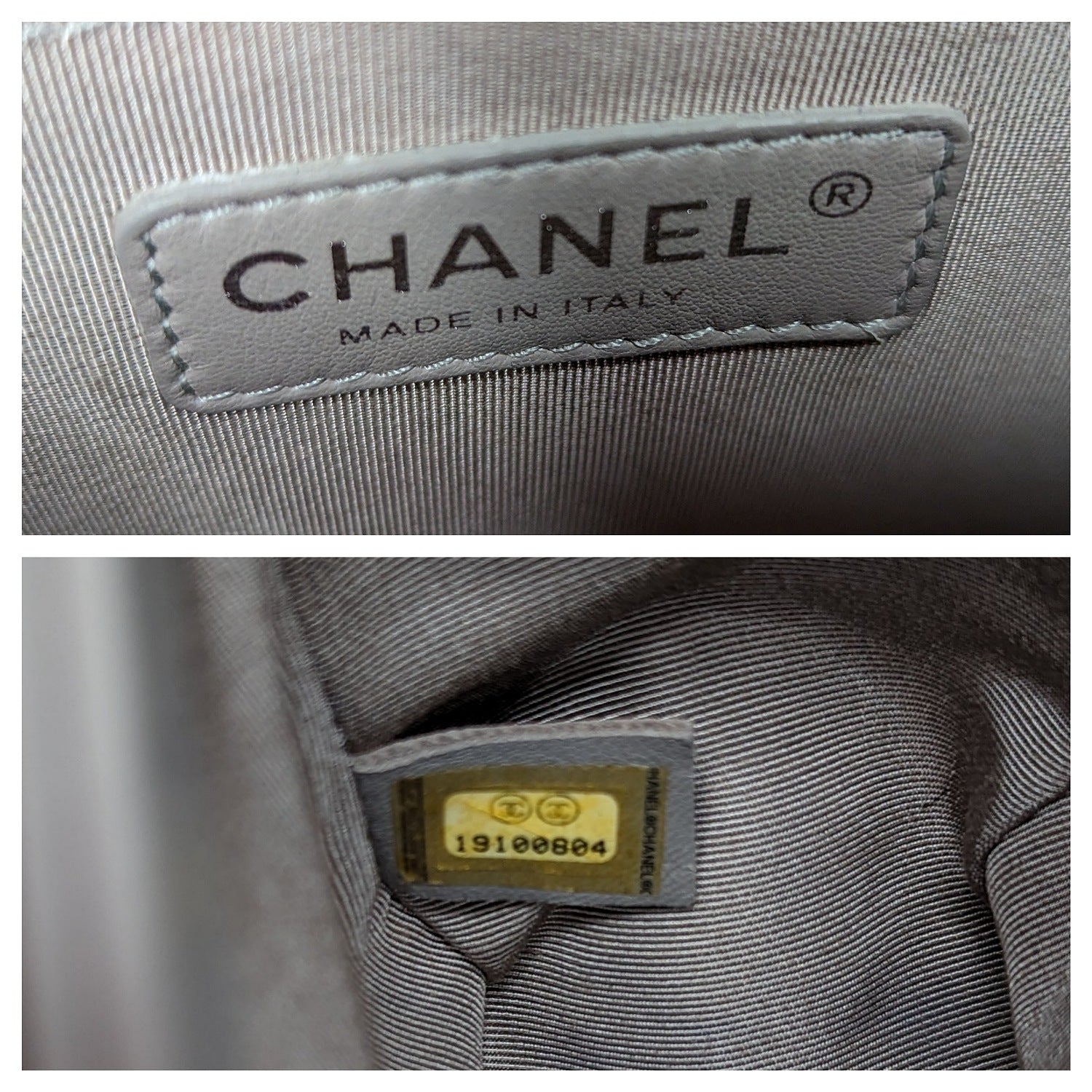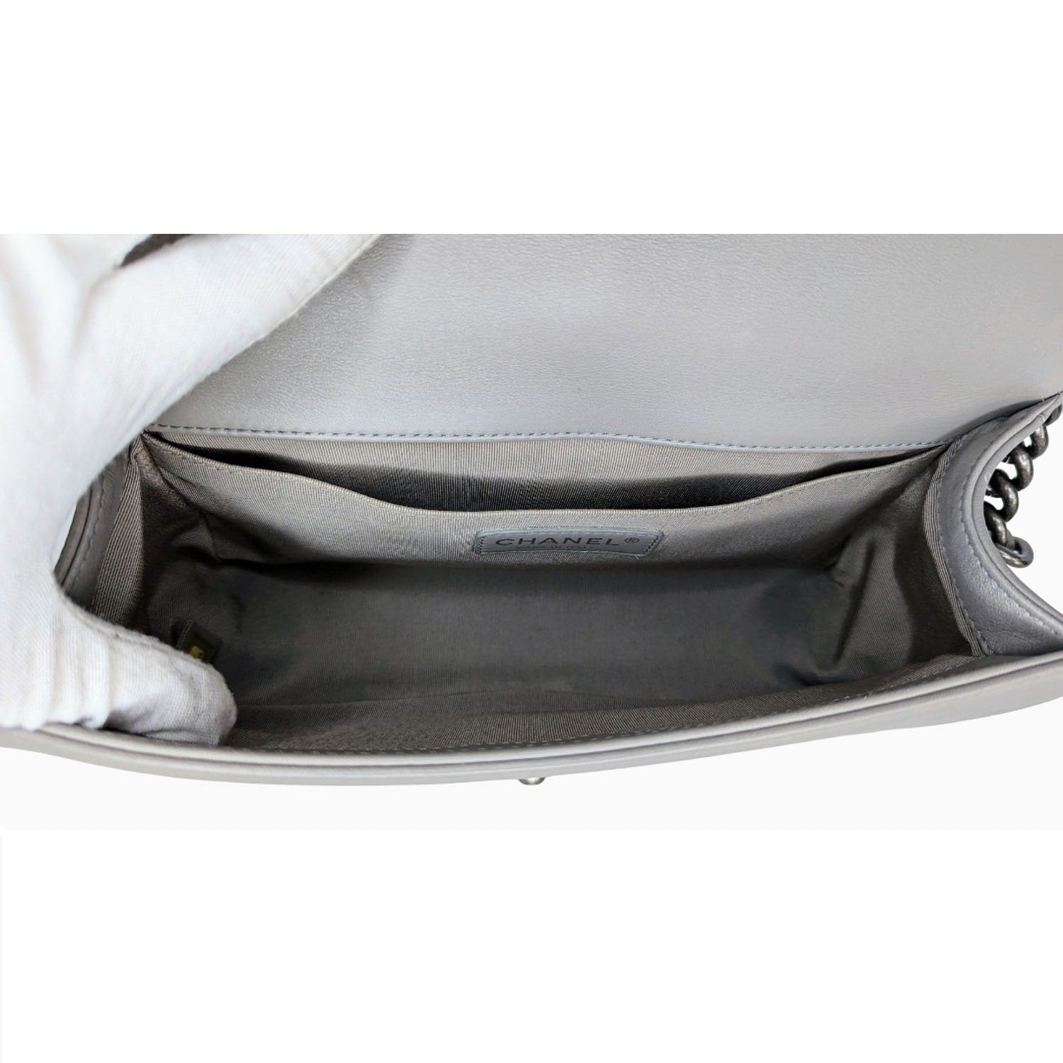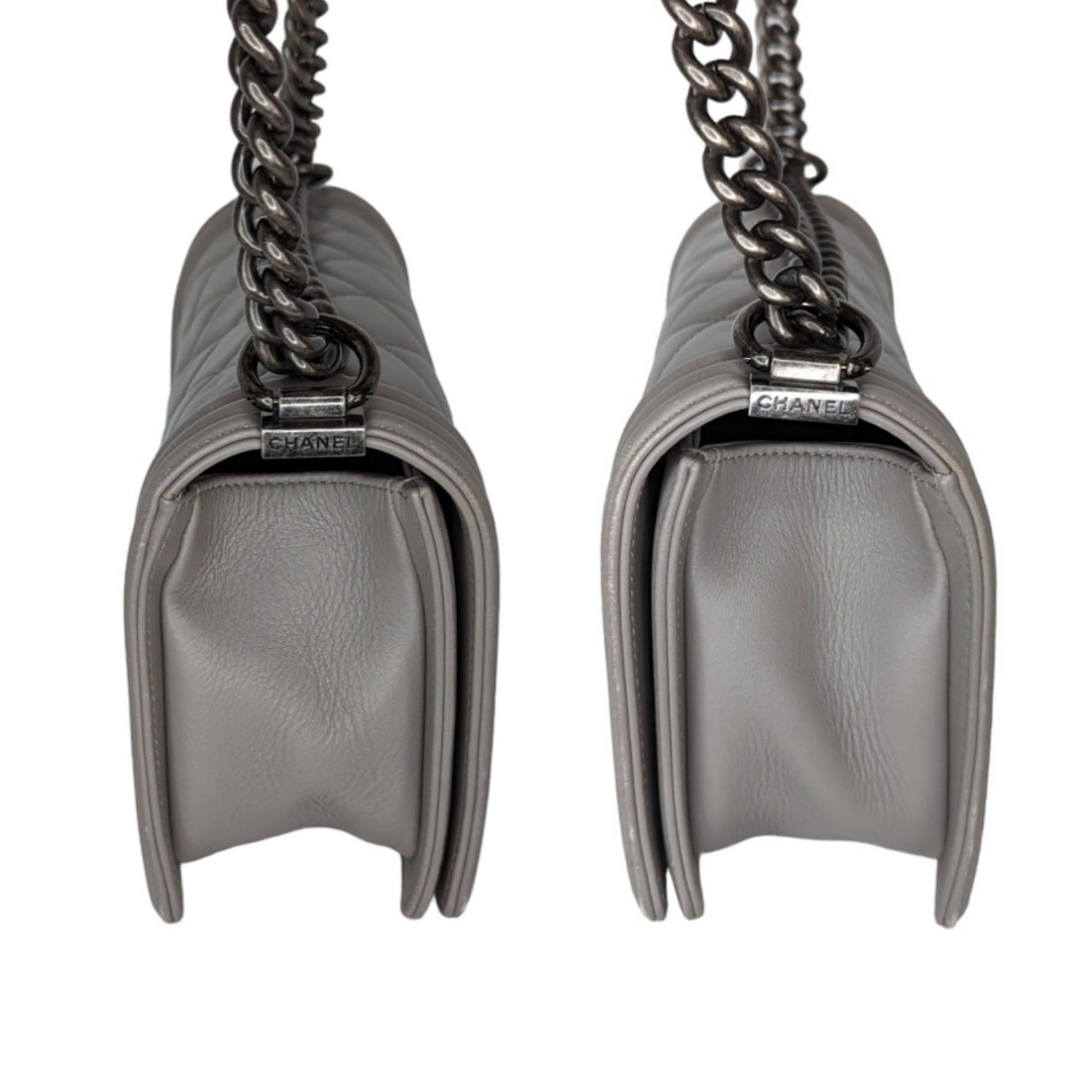 This limited edition Medium Boy bag marries neutral gray calfskin leather with aged ruthenium hardware. The bag is of quilted leather trimmed in smooth leather with smooth leather sides and bottom; it has a full front flap with the Boy signature CC push lock closure, and aged ruthenium chain link and gray leather padded shoulder strap.Β
