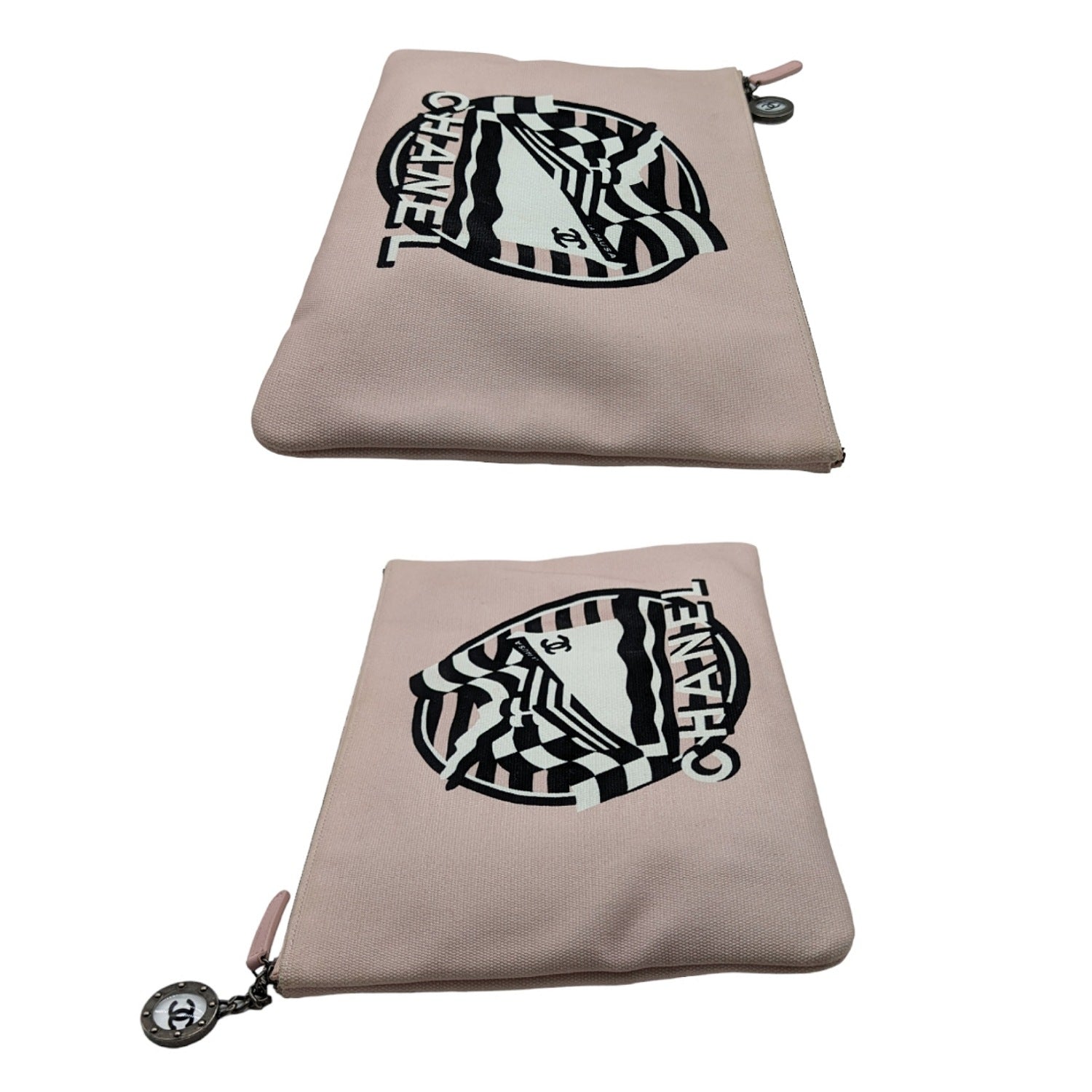From the Chanel bag Cruise 2019 Collection by Karl Lagerfeld. Chanel bag La Pausa Bay Pouch in light pink canvas with gunmetal hardware, tonal woven lining, single zip pocket at interior wall and zip closure at top. Made in Italy.