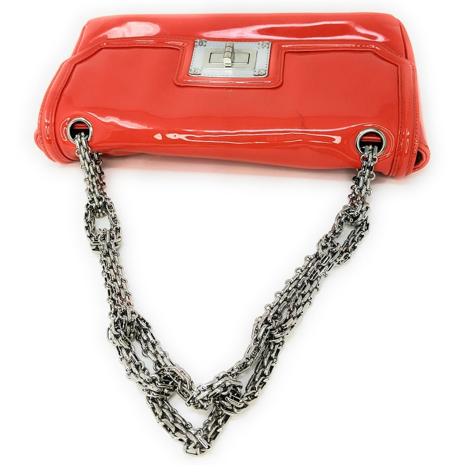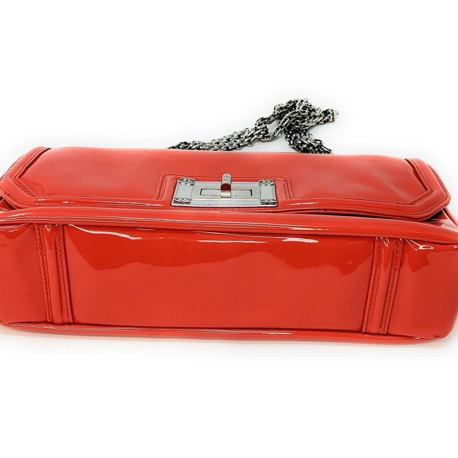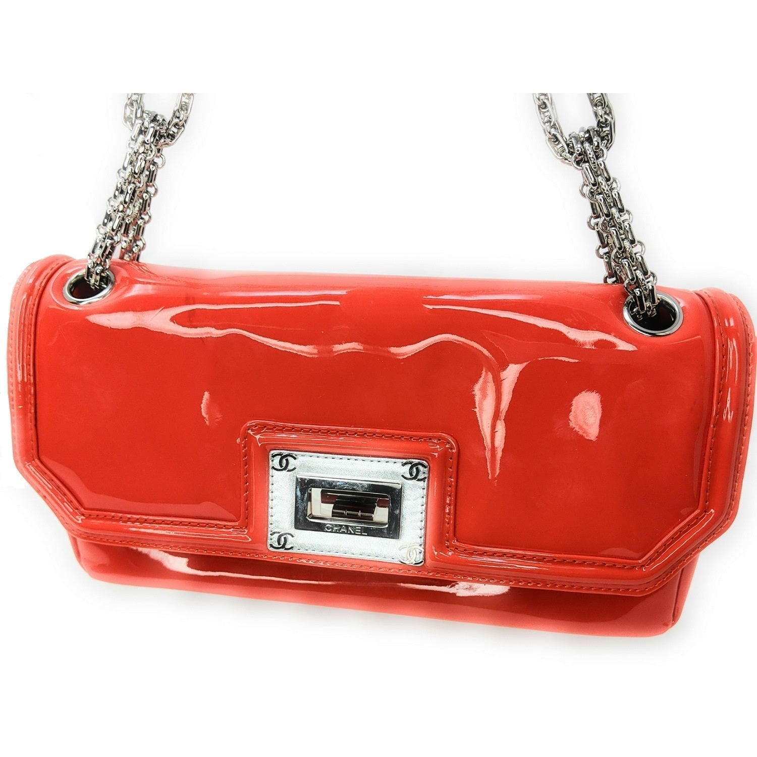 Chanel bag Shiny Mademoiselle Lock Linked Silver Bijoux Chain Classic Flap Bag from the Mademoiselle line crafted from patent calfskin leather, oversized silver reissue lock closure, and gray satin interior lining. This is a stunning shoulder bag that is ideal for day or evening with the timeless quality and style of Chanel bag