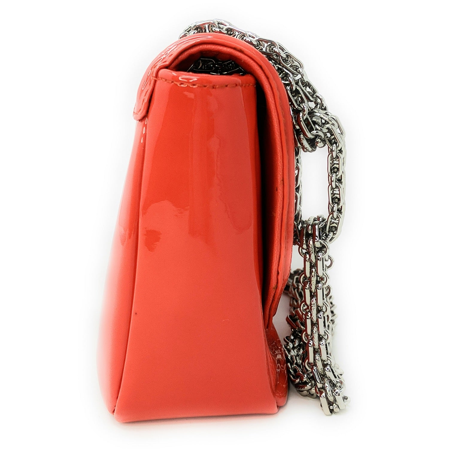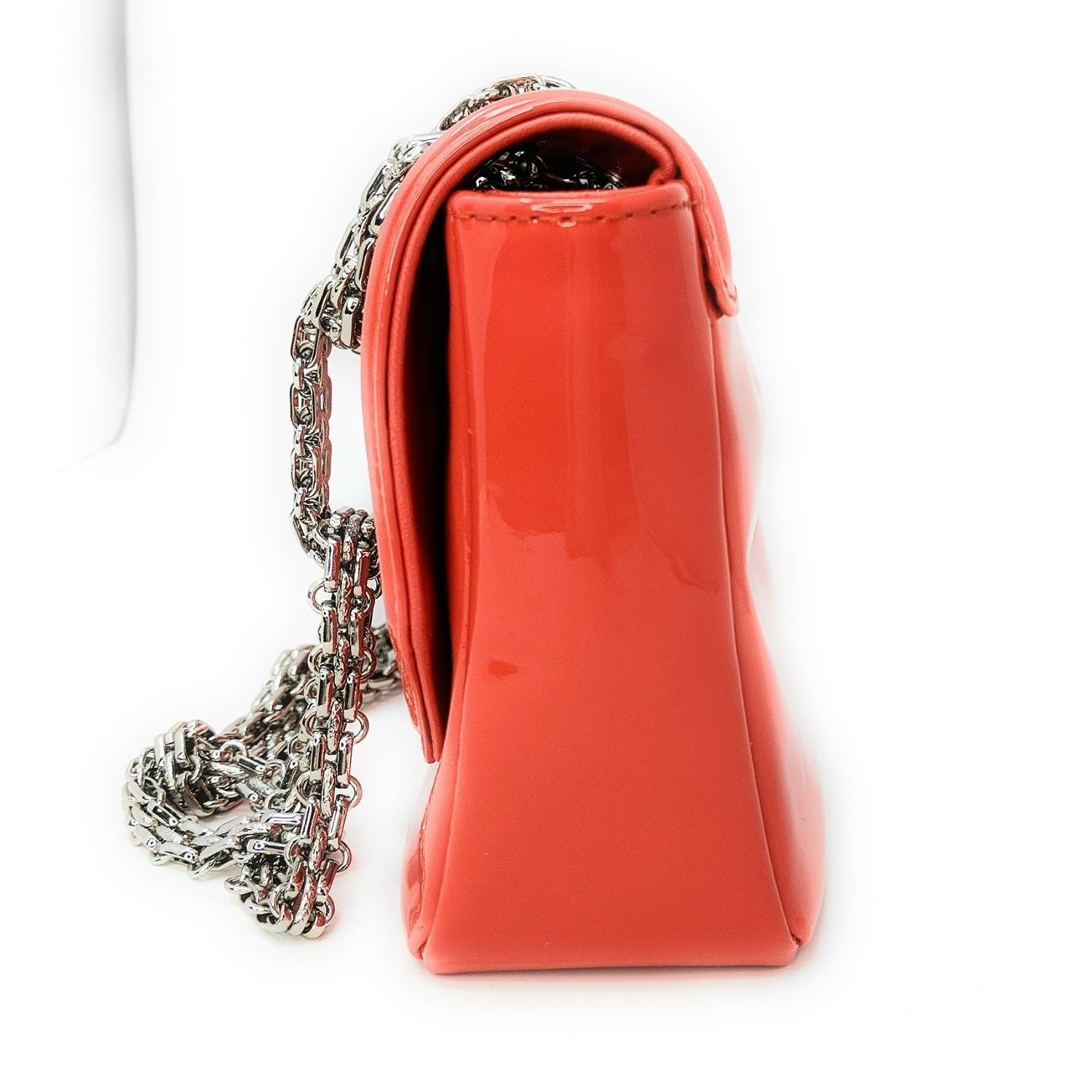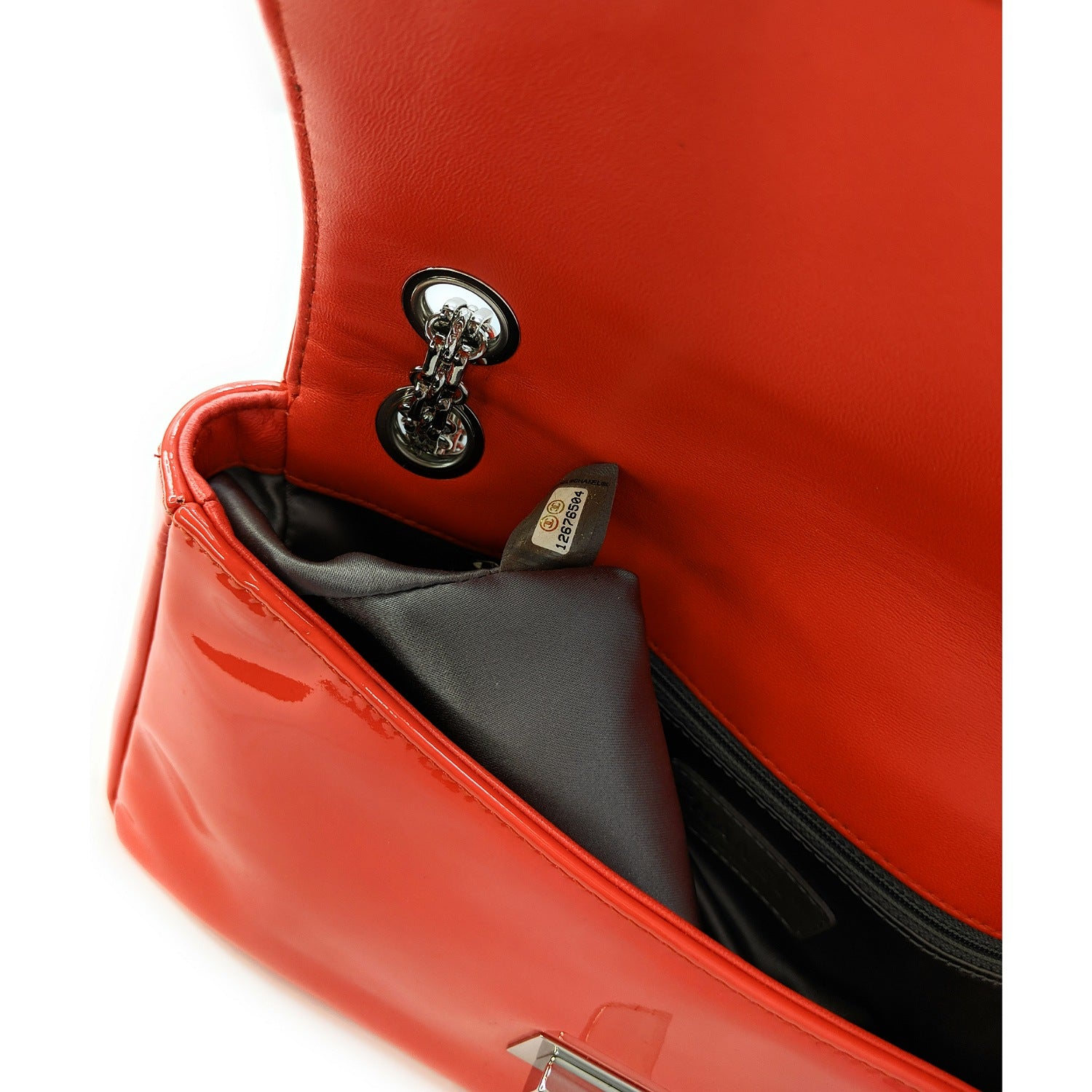 Chanel bag Shiny Mademoiselle Lock Linked Silver Bijoux Chain Classic Flap Bag from the Mademoiselle line crafted from patent calfskin leather, oversized silver reissue lock closure, and gray satin interior lining. This is a stunning shoulder bag that is ideal for day or evening with the timeless quality and style of Chanel bag