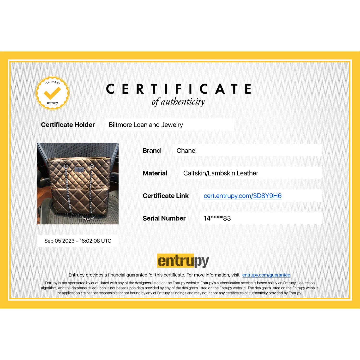 This exquisite tote is beautifully crafted of diamond quilted distressed aged calfskin leather in metallic bronze. The bag features bijoux ruthenium tightly linked chain shoulder straps and a ruthenium squared mademoiselle turn-lock. This opens to a cream fabric interior with zipper compartments and patch pockets. Est.