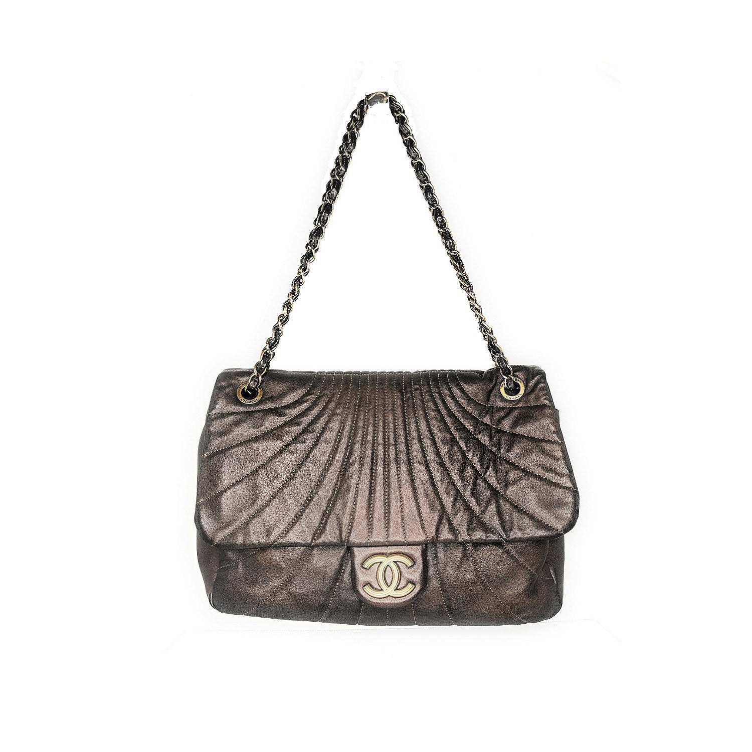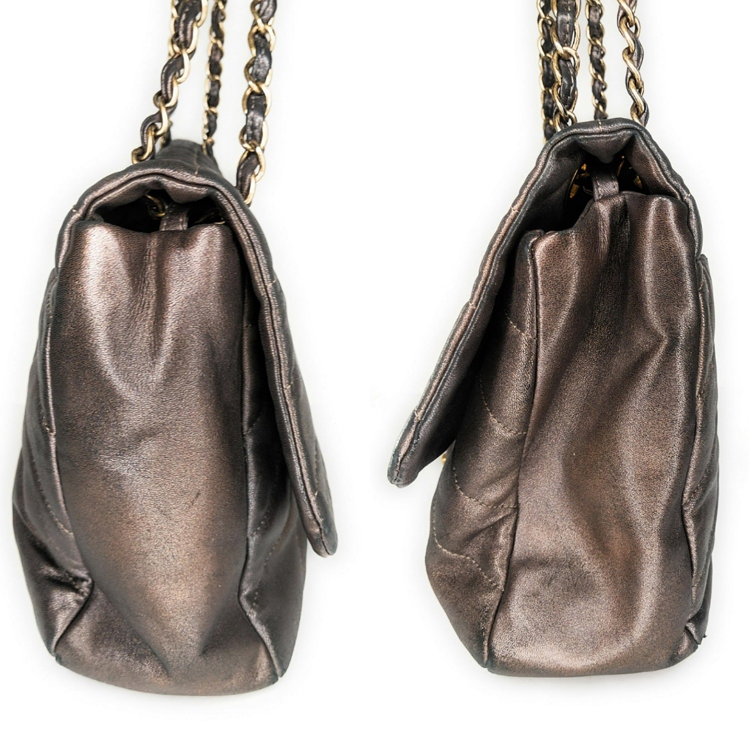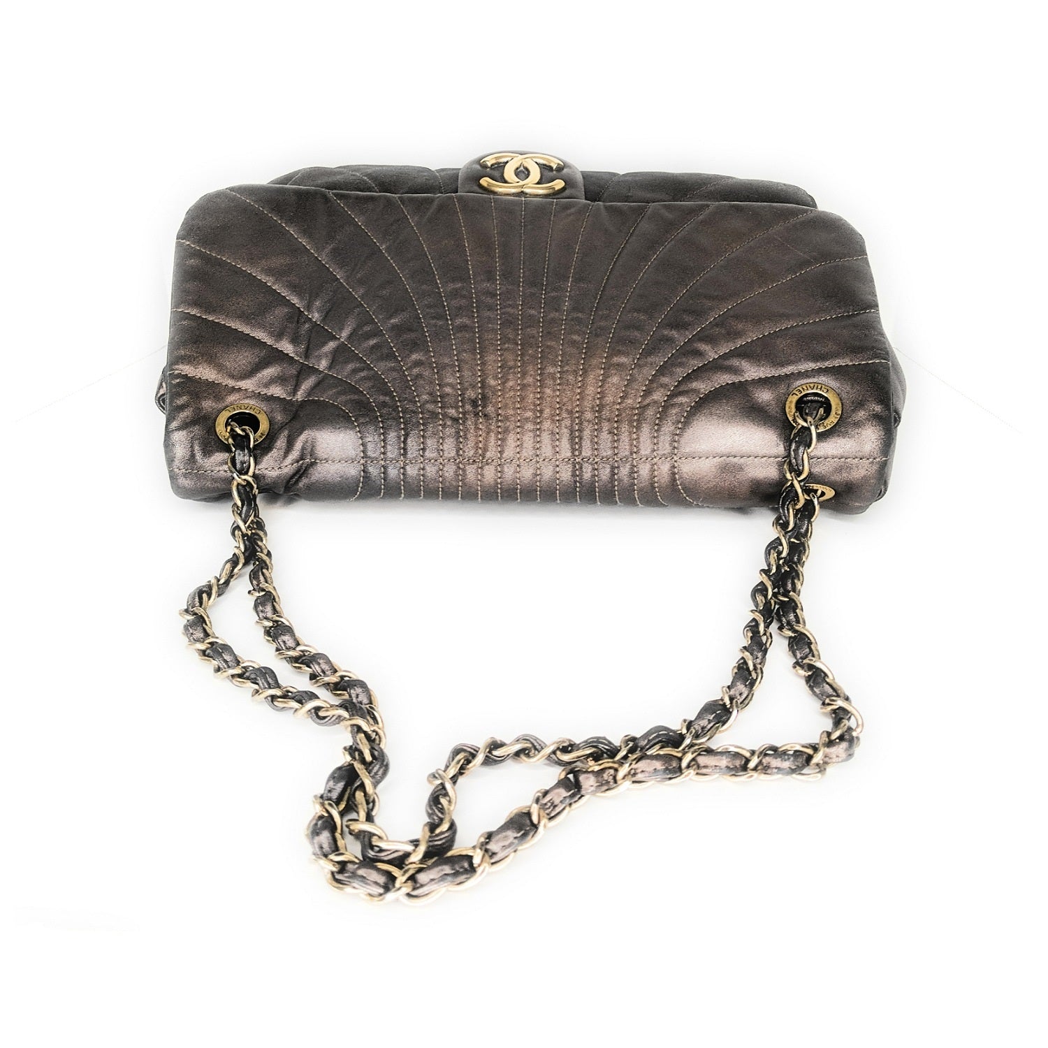 Metallic lambskin leather Chanel bag Paris-Shanghai Flap Bag with aged gold-tone hardware, convertible leather chain-link shoulder strap, satin lining, single interior zip pocket and magnetic snap closure at front flap.