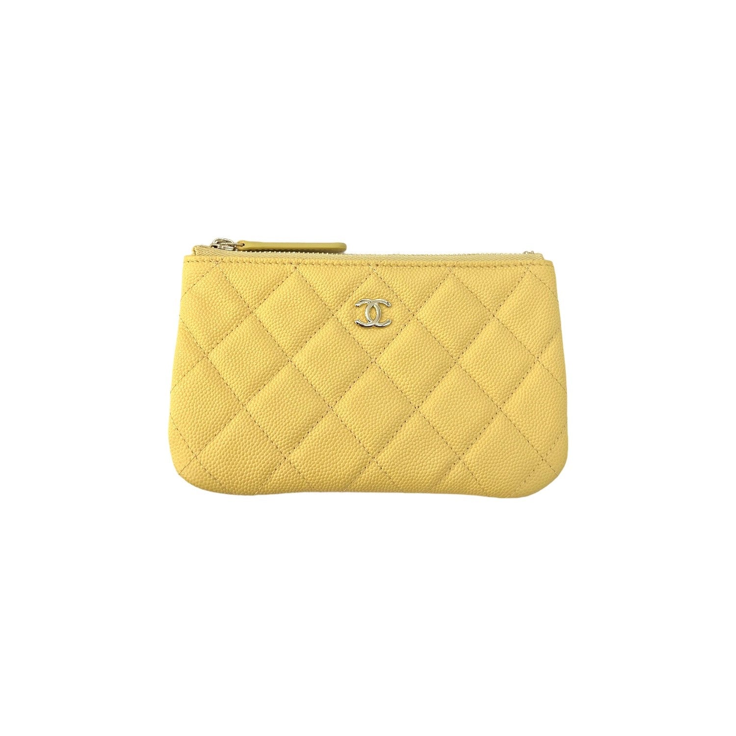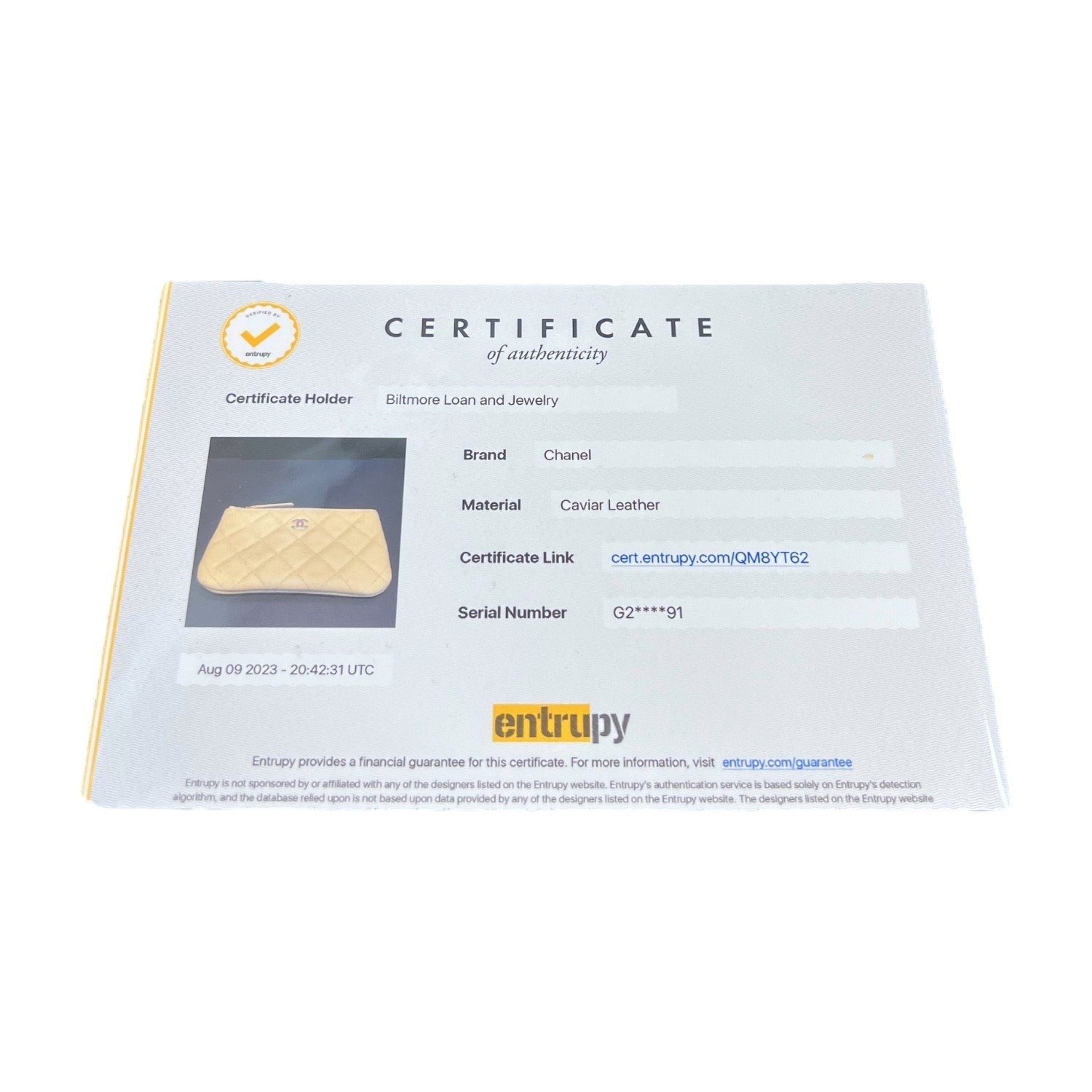 This very beautiful Chanel bag Cosmetic Case was made in Spain and it is finely crafted of light yellow quilted caviar leather with gold-tone hardware features. It has a zipper closure that opens up to a light yellow canvas interior. It is also certified by Entrupy!