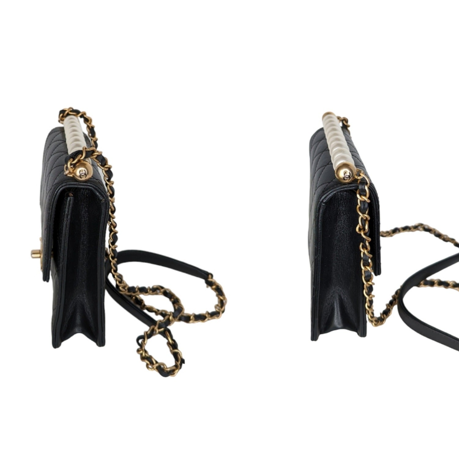 Chanel bag Goatskin Quilted Chic Pearls Flap in Black. This stylish shoulder bag is crafted of diamond-quilted textured goatskin leather. The bag features leather threaded aged gold chain strap, imitation pearls aligned on the top, and a flap with an aged gold classic CC turn lock. This opens to a gold leather interior with patch pockets.