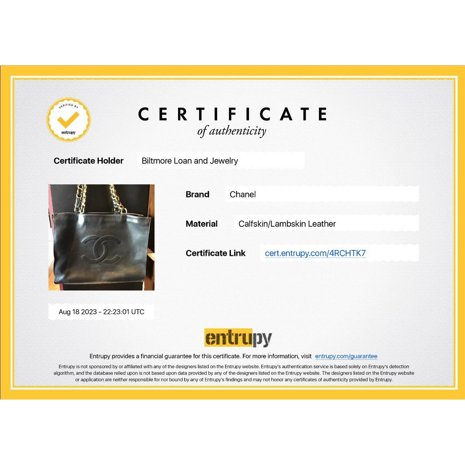 Includes: Chanel bag dust bag and Entrupy COA