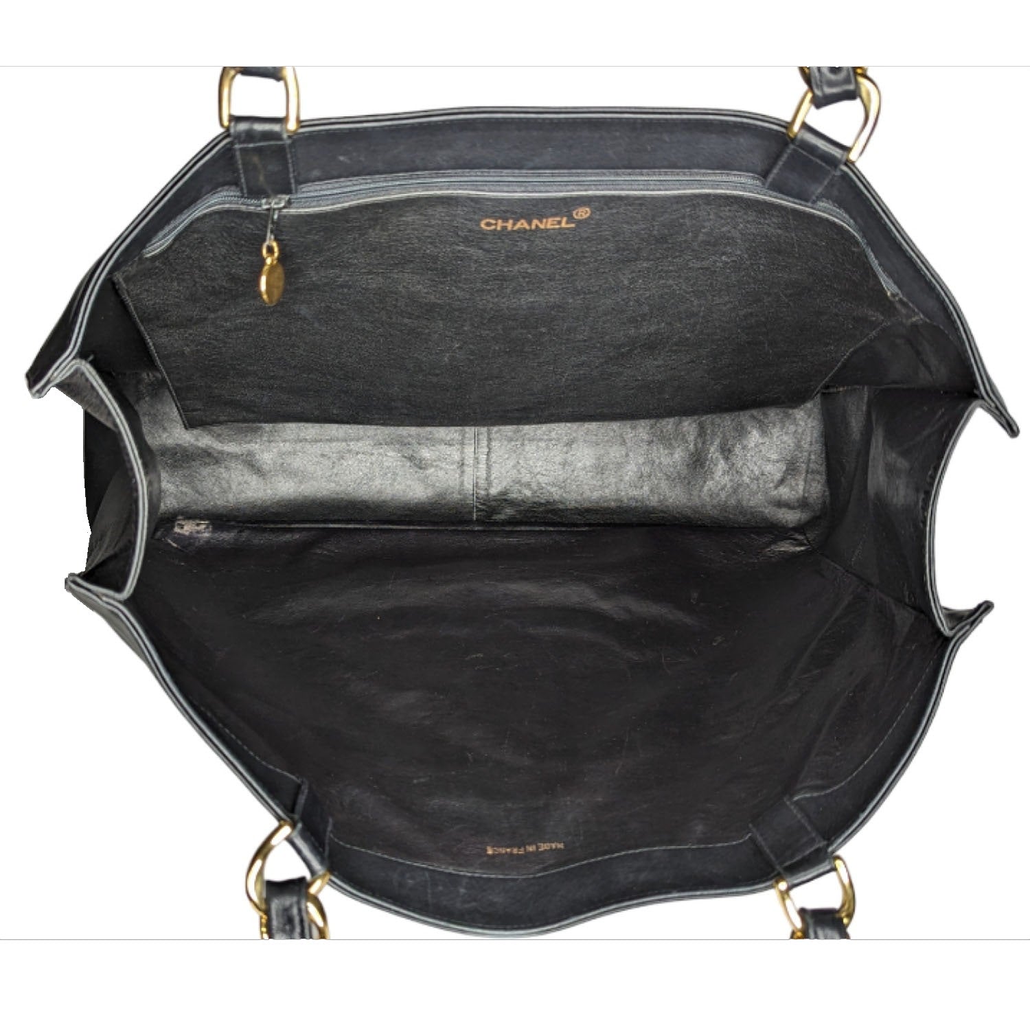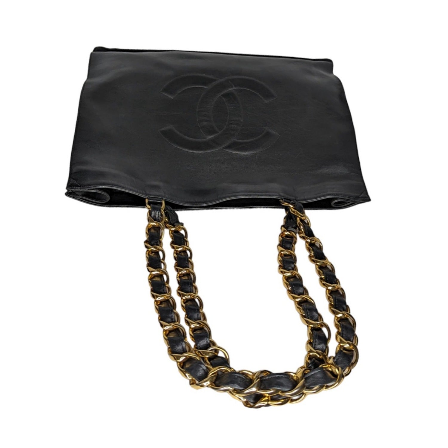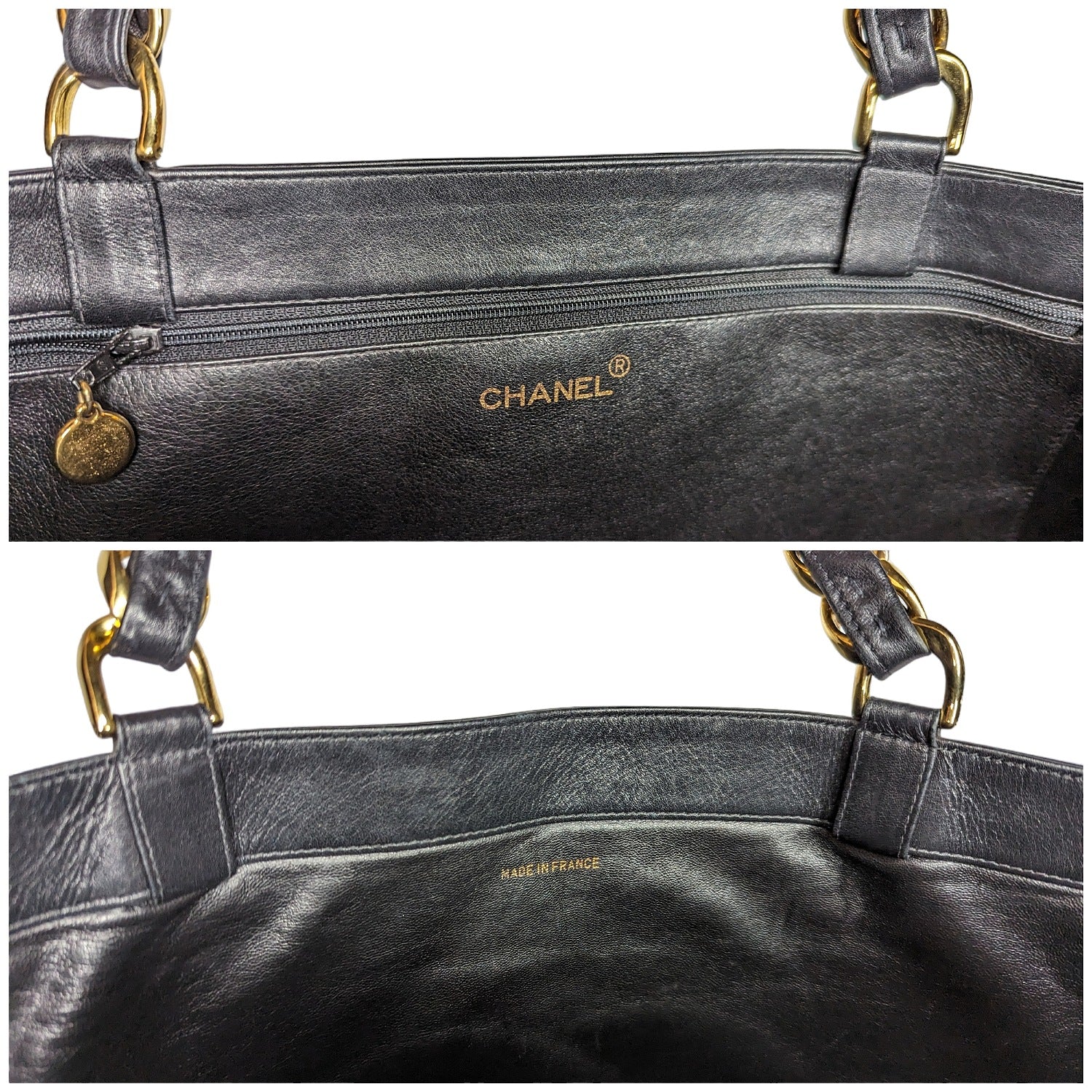 Chanel bag Vintage CC Chain Shopper Tote. This stunning tote, circa 90s, is crafted of luxuriously smooth Calfskin leather in black. The bag features a large, stitched CC quilted logo and leather threaded chain link straps. The top opens to a black leather interior with a zipper pocket. Made in France.